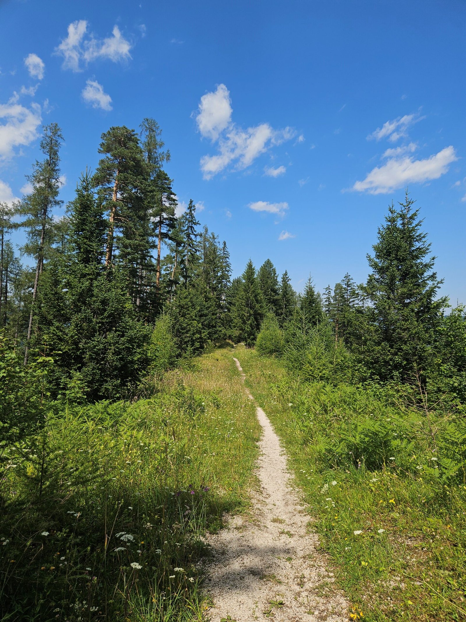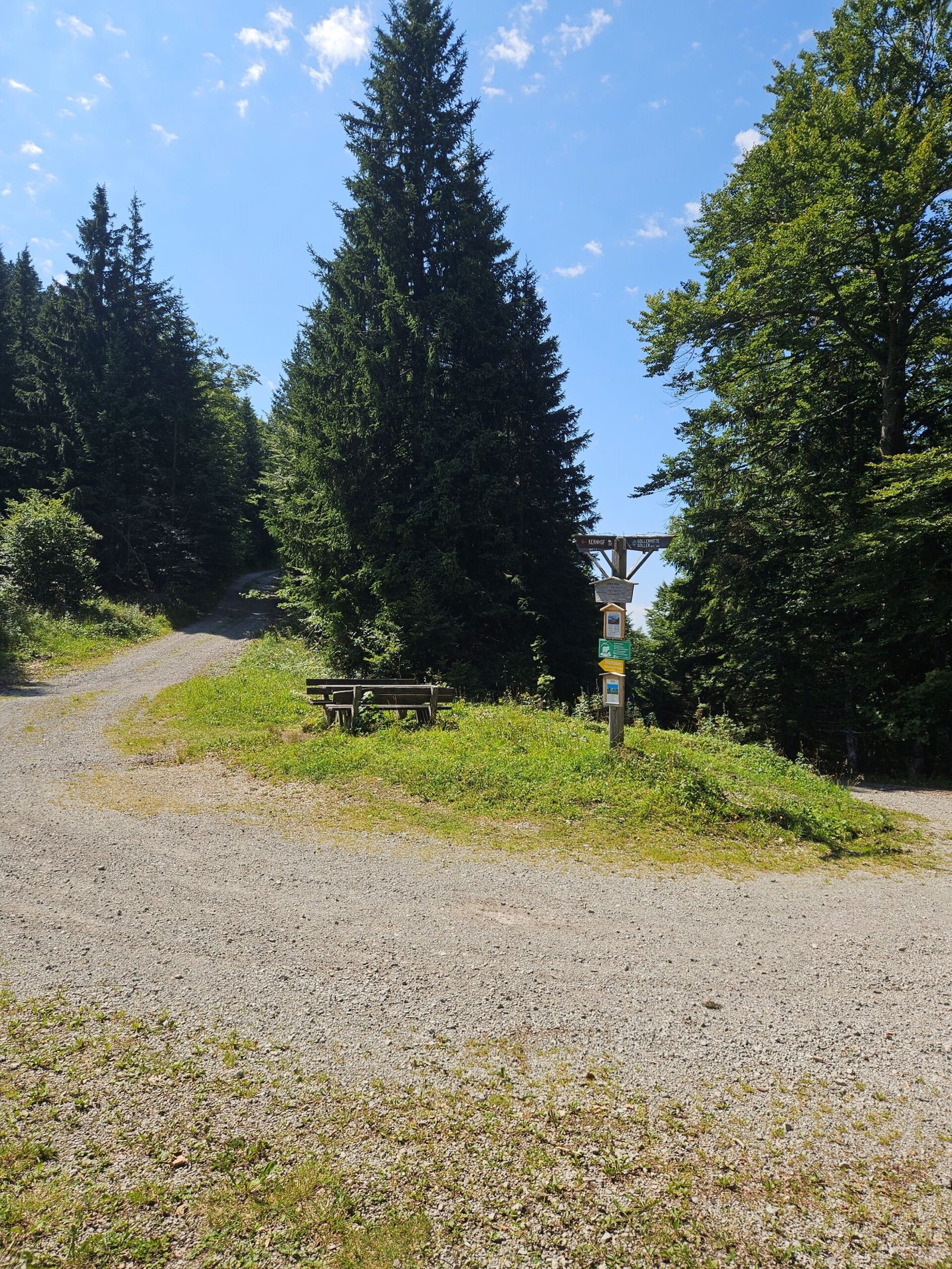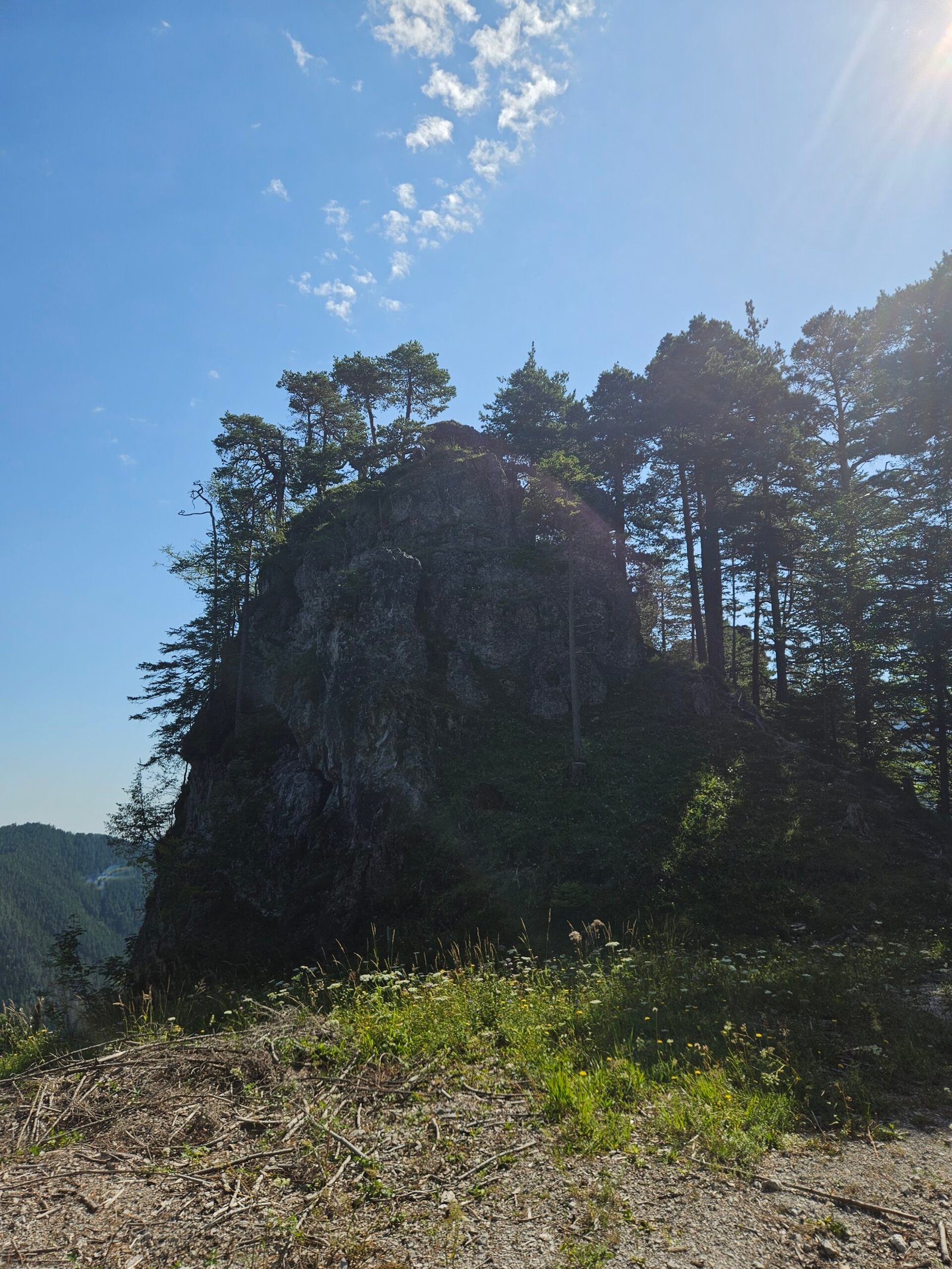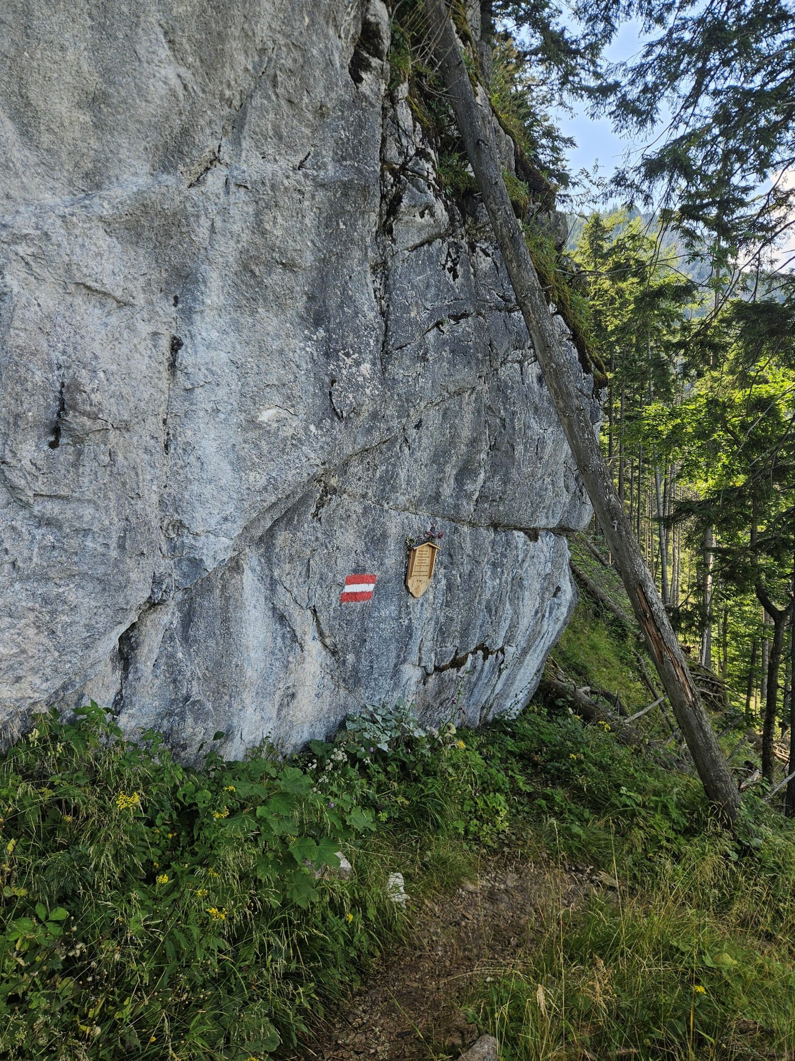 Ohne viele Umschweife starten wir die heutige Tagestour in Kernhof, genauer gesagt an der Bushaltestelle Kernhof Abzweigung Thalerl. Vorbei an Eisstockverein (Öffentliches WC!) und Feuerwehr bahnen wir uns den Weg hinüber zum rot-markierten Wanderweg 52/53, der in südliche Richtung zuerst über einen Feldweg und dann in ein kleines Tal hinein führt. Es folgt der erste kleinere Anstieg. Durch lichten, aber angenehm kühlen Bergwald, geht es nach oben. Das wird -kleiner Spoiler- nicht immer so bleiben.