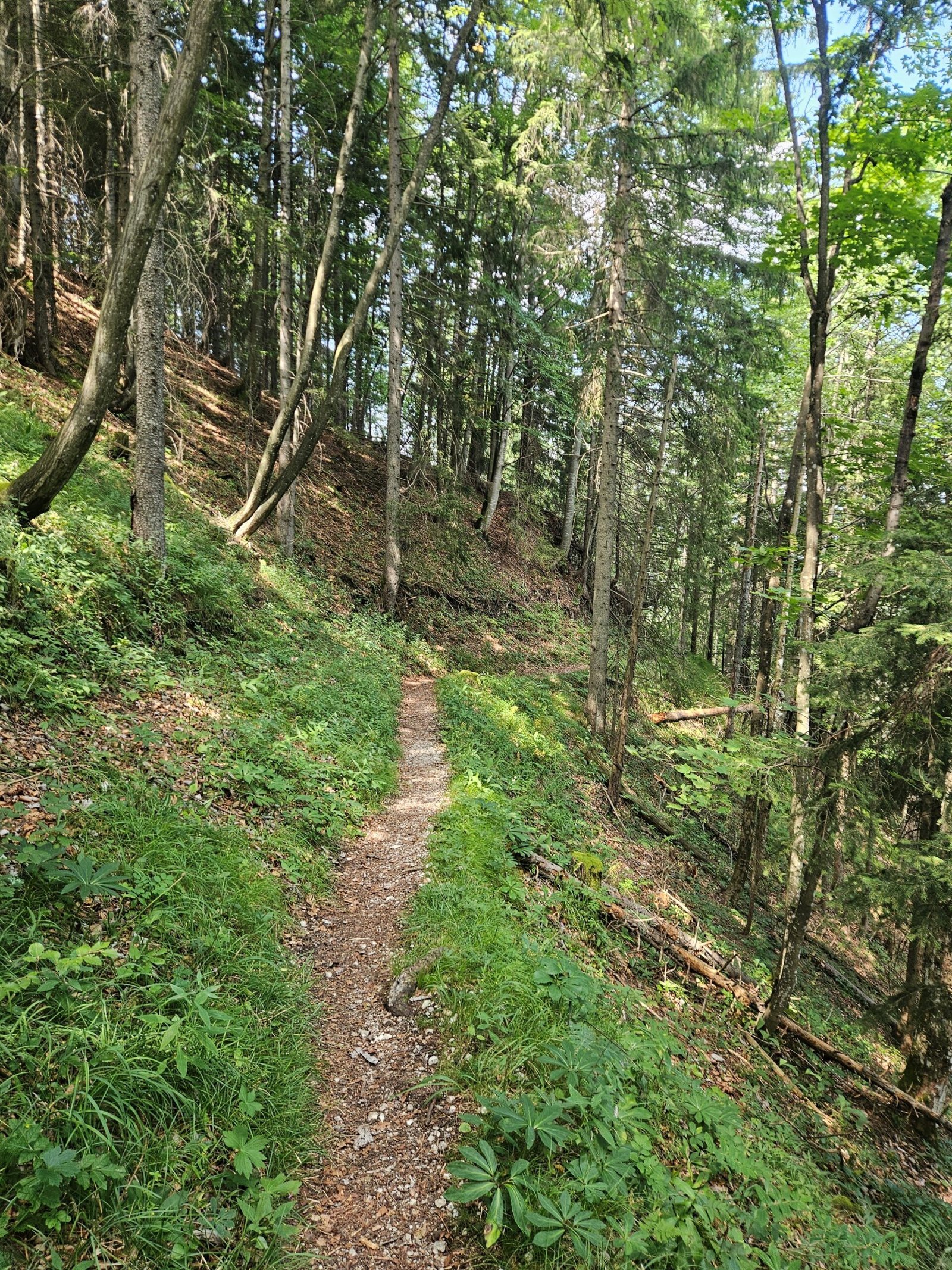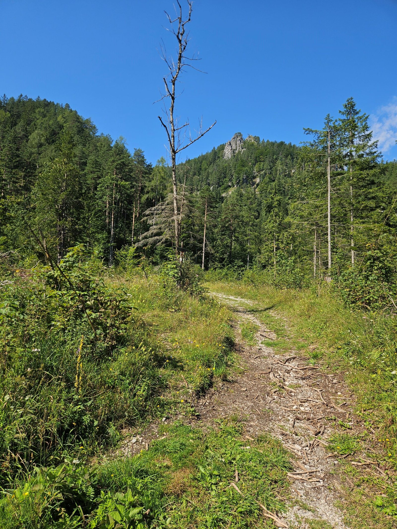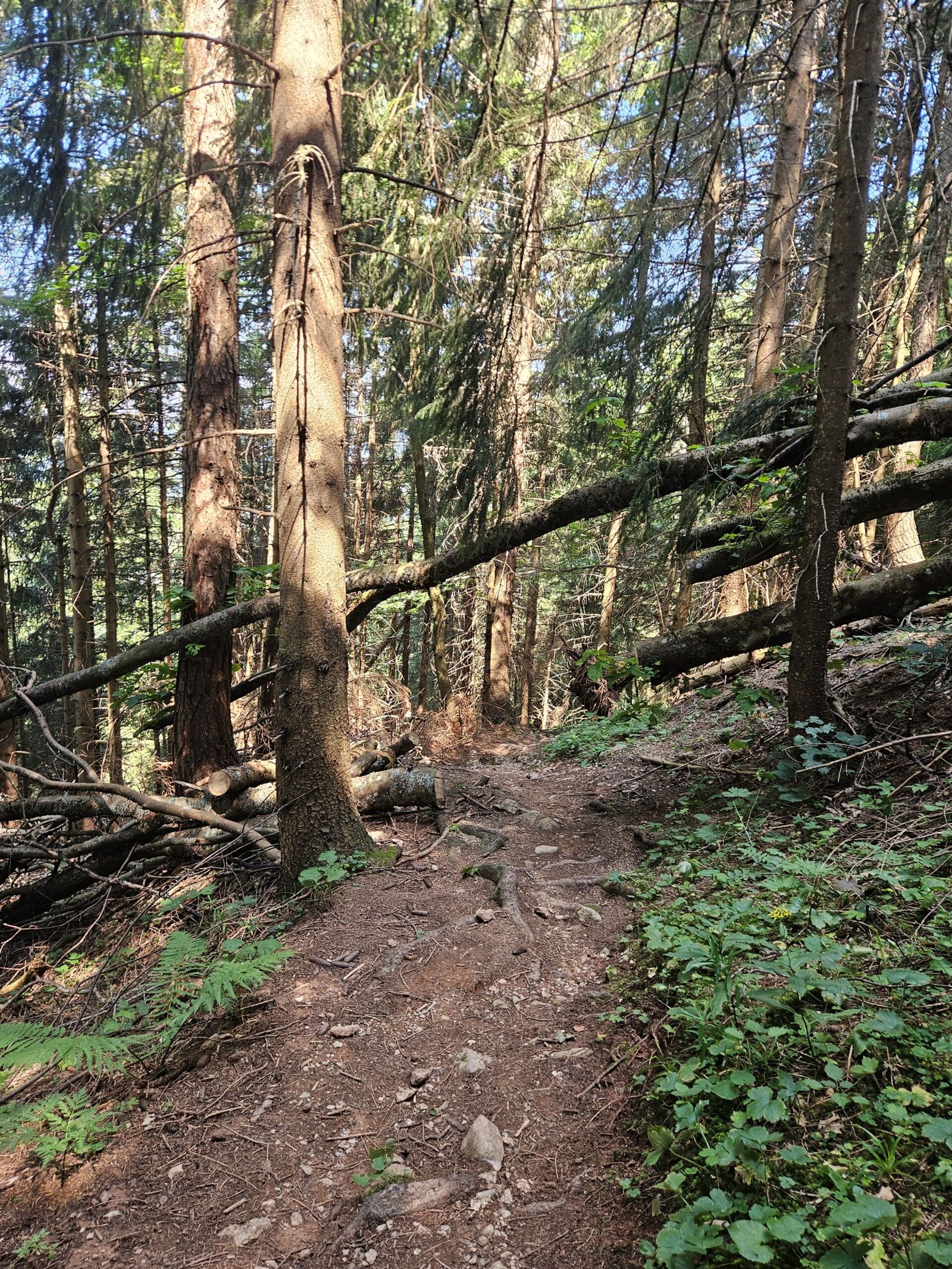 Ohne viele Umschweife starten wir die heutige Tagestour in Kernhof, genauer gesagt an der Bushaltestelle Kernhof Abzweigung Thalerl. Vorbei an Eisstockverein (Öffentliches WC!) und Feuerwehr bahnen wir uns den Weg hinüber zum rot-markierten Wanderweg 52/53, der in südliche Richtung zuerst über einen Feldweg und dann in ein kleines Tal hinein führt. Es folgt der erste kleinere Anstieg. Durch lichten, aber angenehm kühlen Bergwald, geht es nach oben. Das wird -kleiner Spoiler- nicht immer so bleiben.