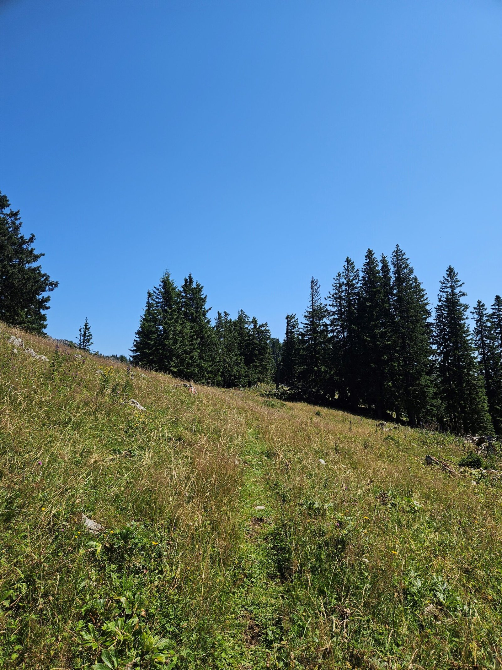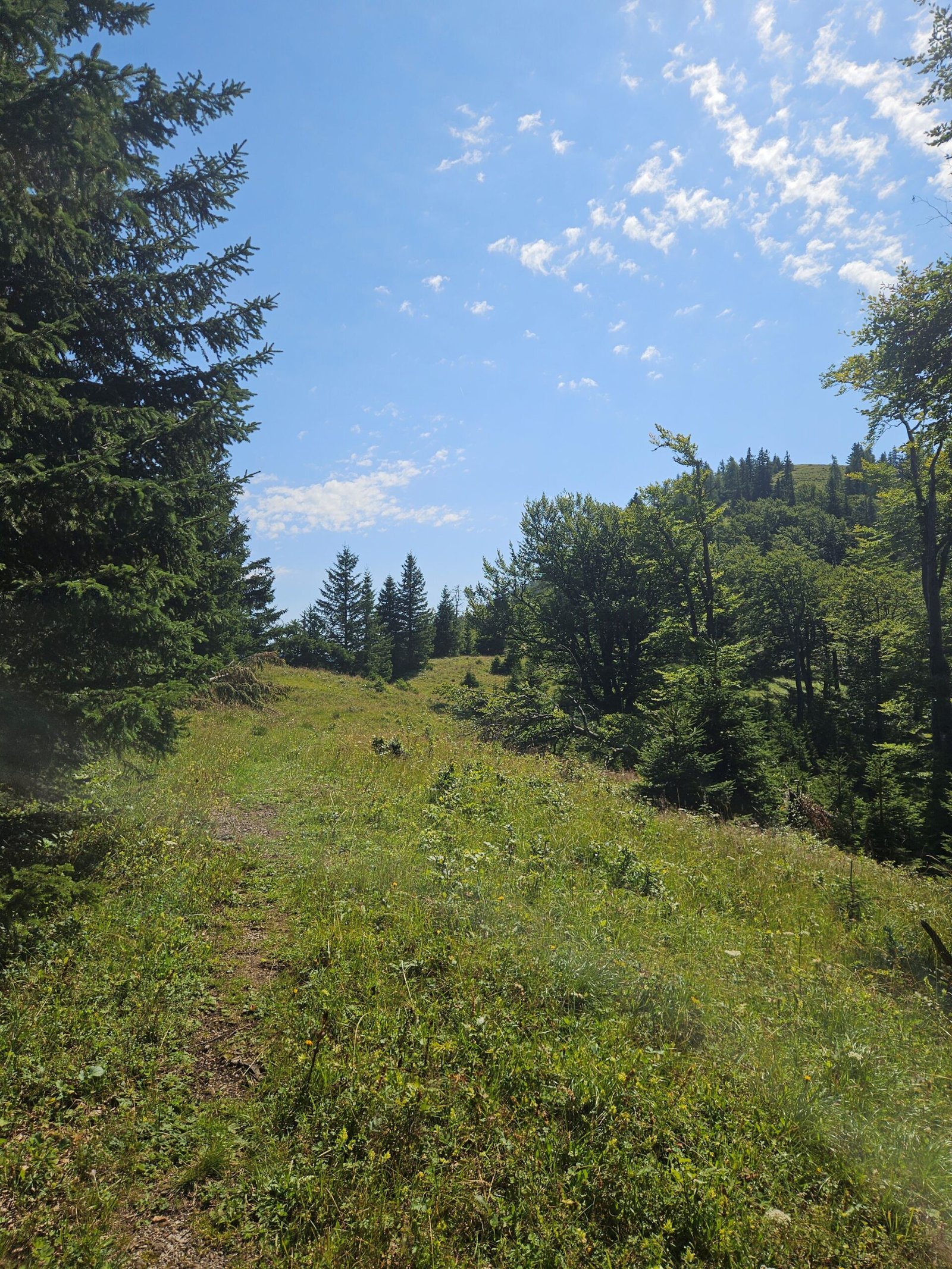 Wir überwinden ein kleines Köpferl und finden uns mitten auf dem Gratverlauf wieder, der sich zum markanten Gipfel des Gippel (ich weiß, ich weiß “Gippel-Gipfel” könnte durchaus als kleiner Zungenbrecher durchgehen) hinüberzieht. Spürbar felsiger und zunehmend schmäler windet sich der Pfad nach Osten, immer rechterhand der links steil abfallenden Geländekante. Im Mittelteil braucht es kurz ein paar konzentriert gesetzte Schritte und teils geht es auch auf der rechten Seite ordentlich nach unten, ansonsten halten sich die Schwierigkeiten beim Transfer hinüber zur Polwischalm aber in Grenzen. Ein normaler Wanderweg für Kind und Kegel ist der Pfad aber dennoch nicht, im Gegenteil er stellt eher eine gute Einstimmung auf den noch folgenden Wegabschnitt dar.