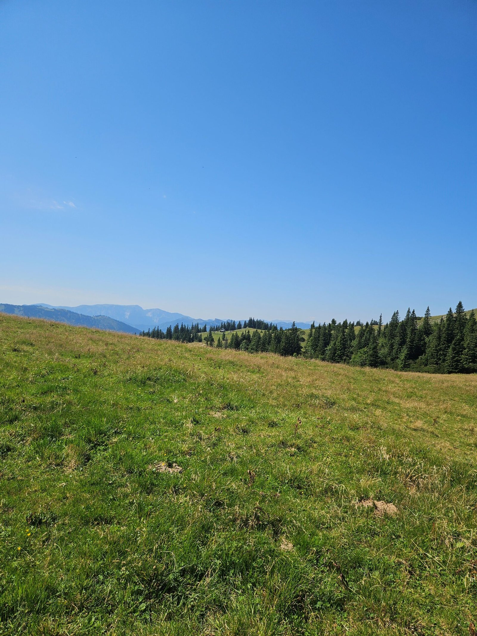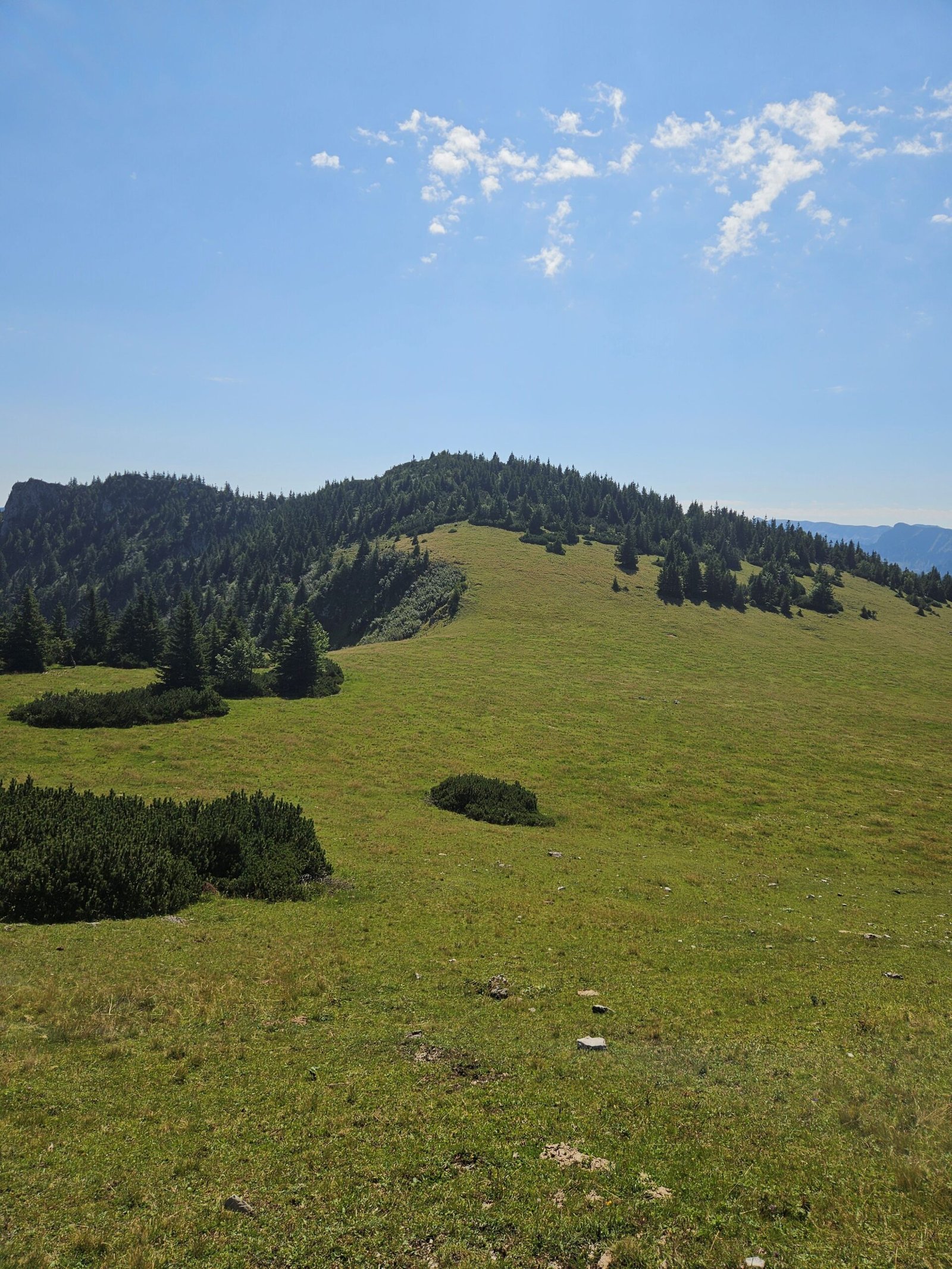 Vom kurzfristigen Zwischenziel steigen wir wieder hinunter auf den Almboden, überqueren diesen in südliche Richtung, wobei wir auch einen Blick auf die nahe Kohlröserl-Hütte auf der Hofalm werfen können.