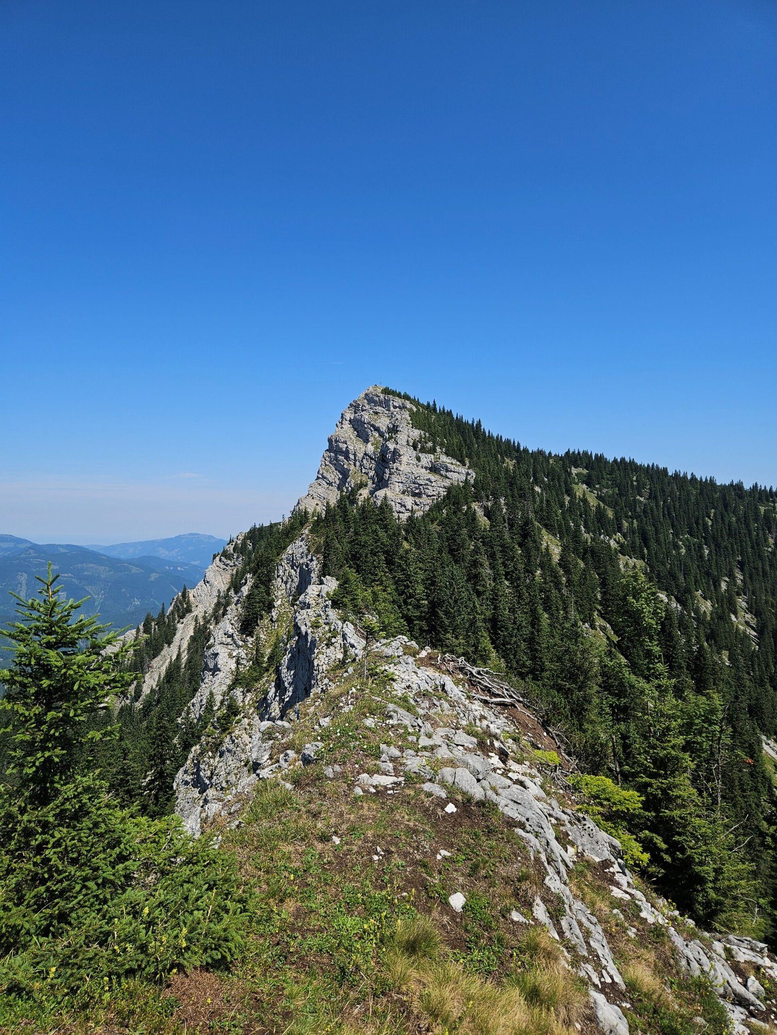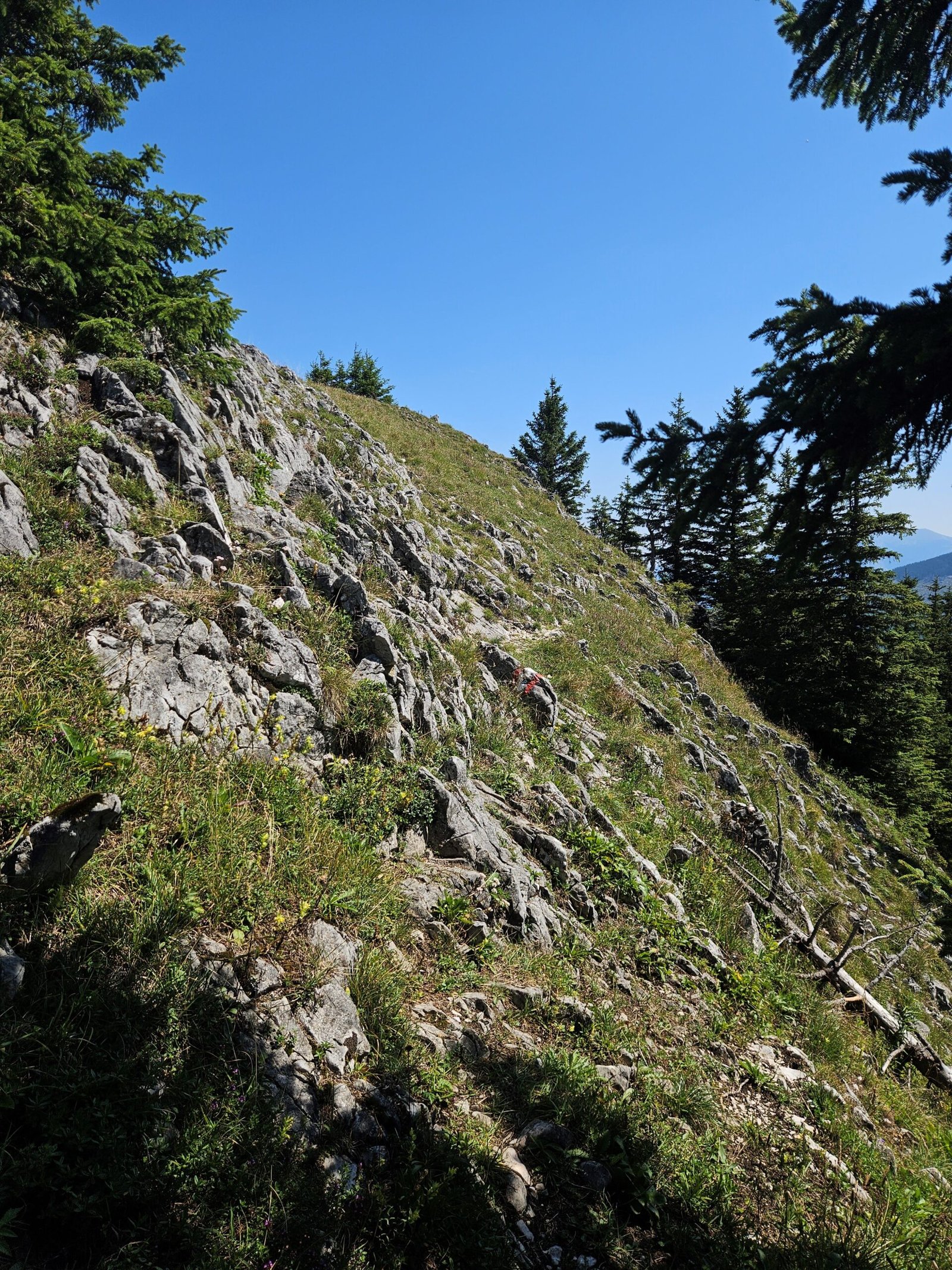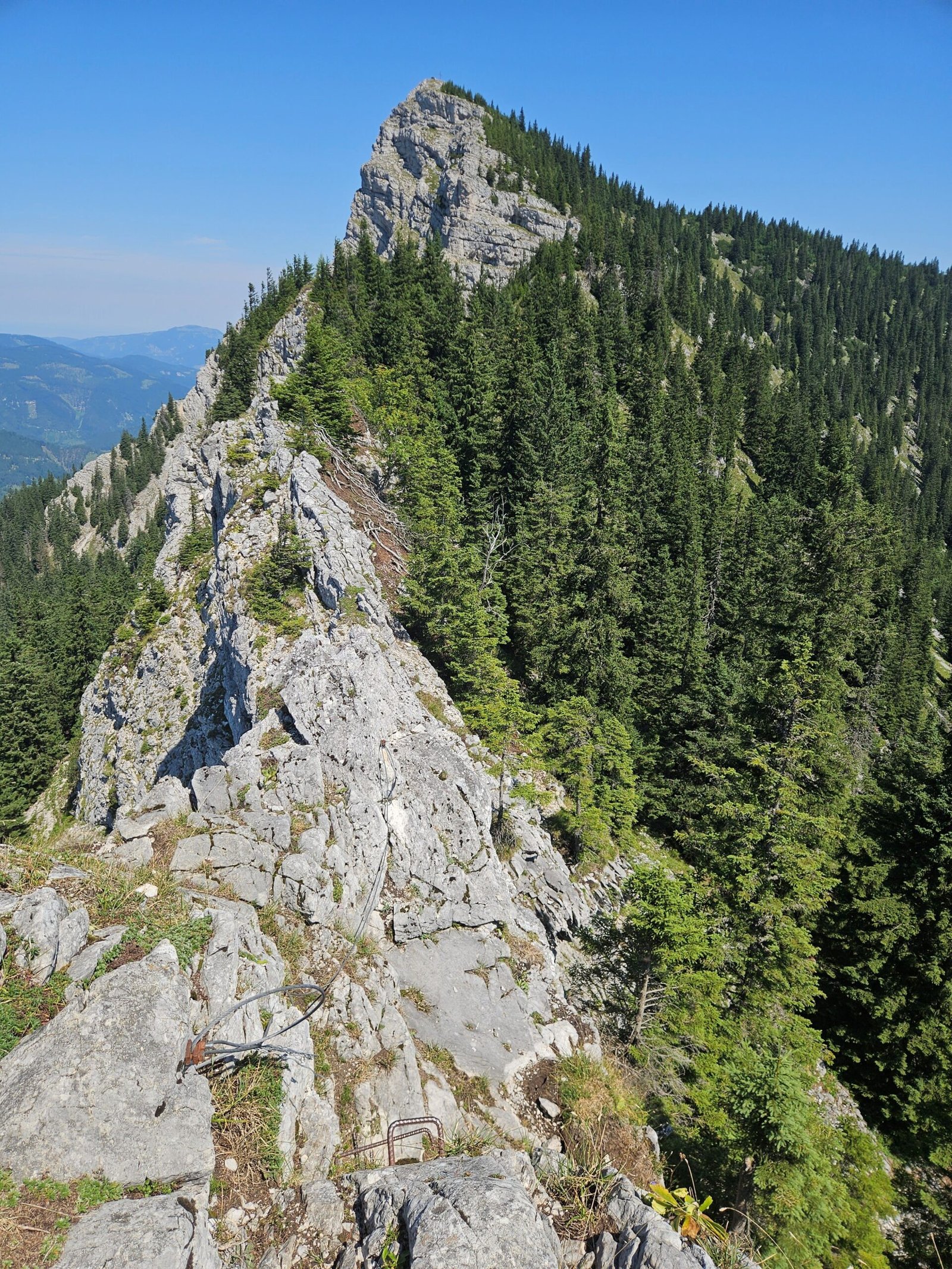 Während der Grat immer spitzer zuläuft, freuen wir uns über jedes kleine Bäumchen, welches uns hier noch angenehme Kühle spendet, denn Schatten ist von hier bis zum Gipfel absolute Mangelware. Am Ende des kleinen Bergwäldchens stehen wir dann recht unvermittelt vor dem Ende des Weges. Zumindest scheint es so, denn an ein Weiterkommen ist hier auf den ersten Blick nicht zu denken. Die Schlüsselstelle -und gleichzeitig der einzig versicherte Abschnitt des Steigs- überwindet den schärfsten Gratabschnitt mithilfe einiger gezielt platzierter Klampfen und dem einen oder anderen Stahlseil. Die Kletter(steig)schwierigkeit begrenzt sich auf ein absolutes Minimum (A/B), die viel beschworenen Schwindelfreiheit und Trittsicherheit sind hier aber zwingend erforderlich. Links geht es hier ein paar hundert Meter fast senkrecht nach unten, rechts immerhin auch um die hundert. Spannenderweise müssen wir die Kletterstelle aber nicht hinauf- sondern abklettern. Das stellt vielleicht auch die größere Herausforderung dar, als die reine Kletterschwierigkeit, denn es erfordert wie gesagt etwas Überwindung hier in den doch recht abschüssigen Gratverlauf hinein- und hinunterzukraxeln, als es vielleicht im Aufstieg der Fall wäre. Mit etwas nachgeschärfter Konzentration, immerhin befinden wir uns bereits in einem recht fortgeschrittenen Abschnitt der Tour, hangeln wir uns am Stahlseil nach unten. Etwas Vorsicht, denn oft hat das Seil ein wenig Spiel und ist bei einer Sanduhr im unteren Teil besonders locker verlegt worden. Wir verlassen über eine letzte leicht ausgesetzte Querung den Mittelteil und begeben uns hinüber in die abgewaschenen Felsstufen des südwestlichen Gipfelaufbaus. Hier ist die Wegfindung nicht immer so einfach und der Weg teils schlecht bis gar nicht markiert. Da hilft nur immer wieder ein beherzter Blick auf die Karte, denn das wesentlich verweilfreundlichere Gelände ist dafür nach der doch etwas pulsaktivierenden Partie von vorhin recht gut geeignet. Wir halten uns, auch wenn so manche Steigspur etwas anderes vermuten lassen würde, eher links und überwinden in weiterer Folge unschwierig zwei kleine Felsbänke.
