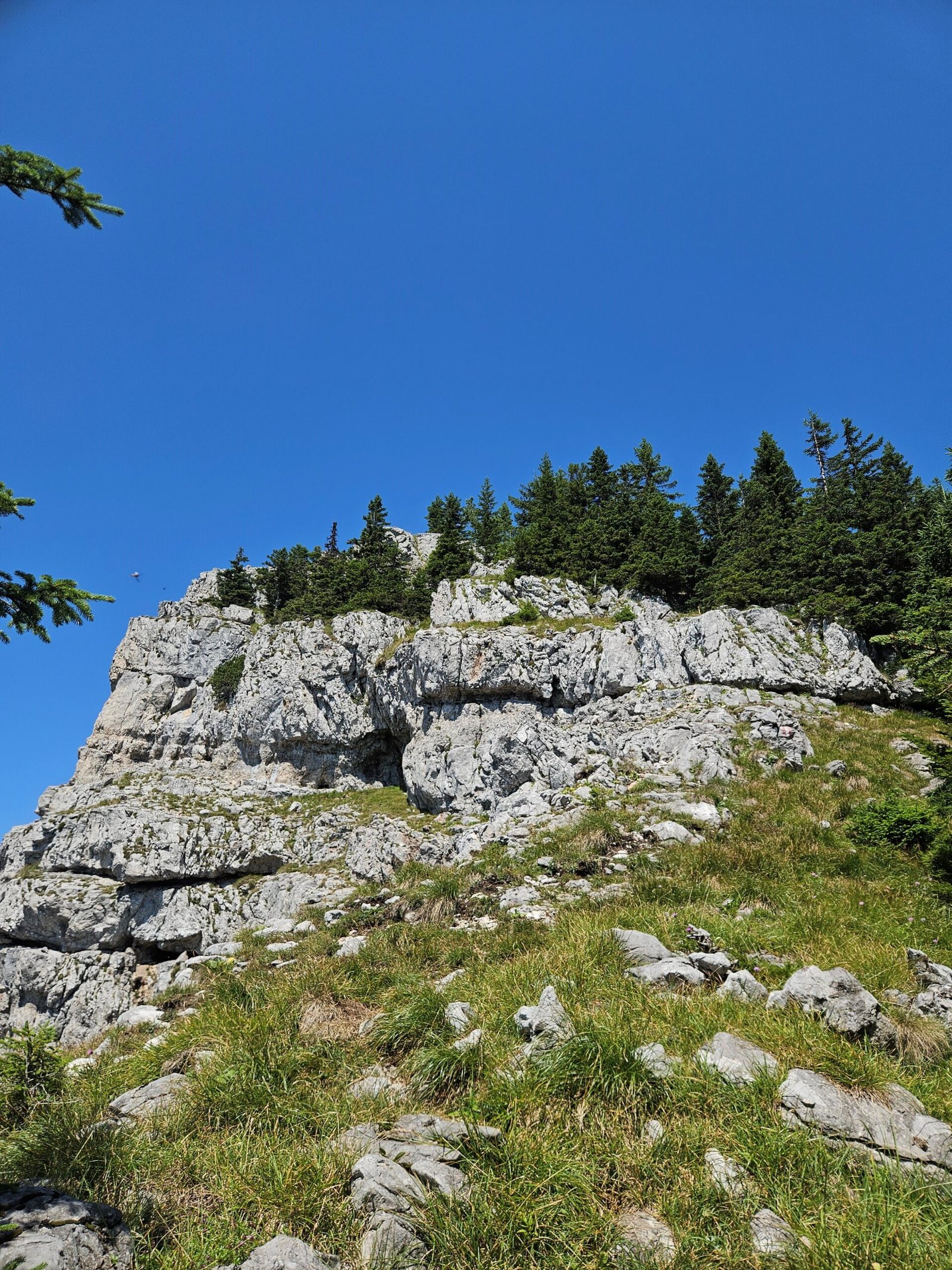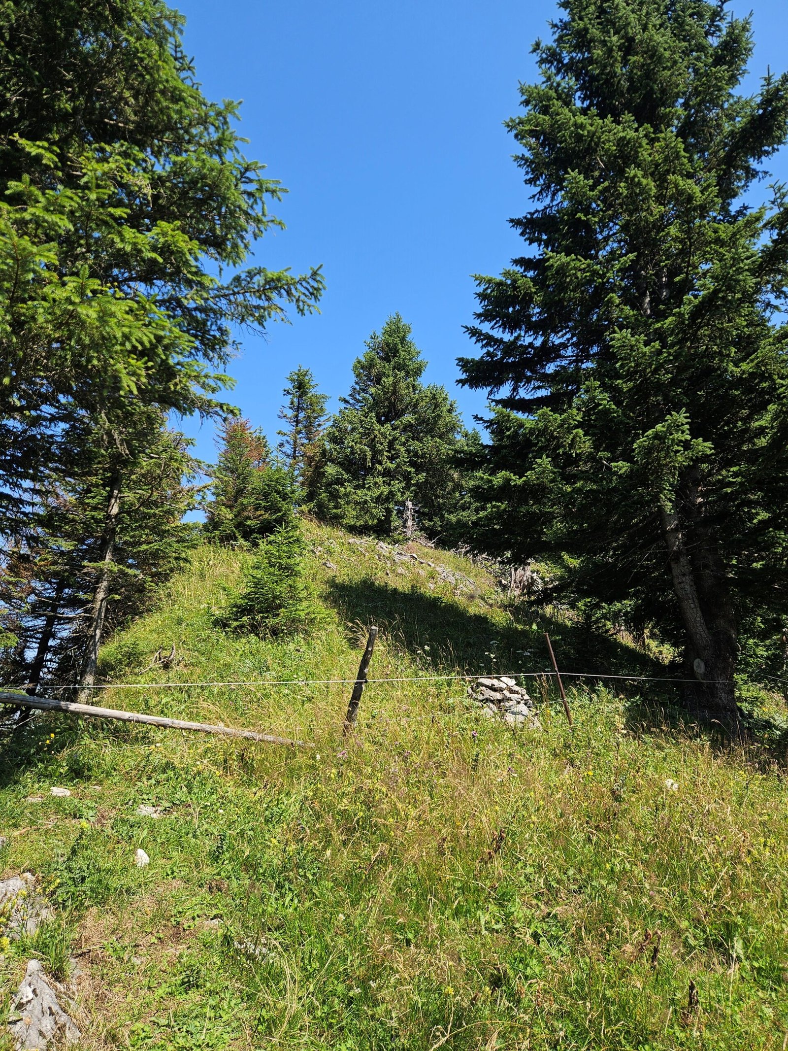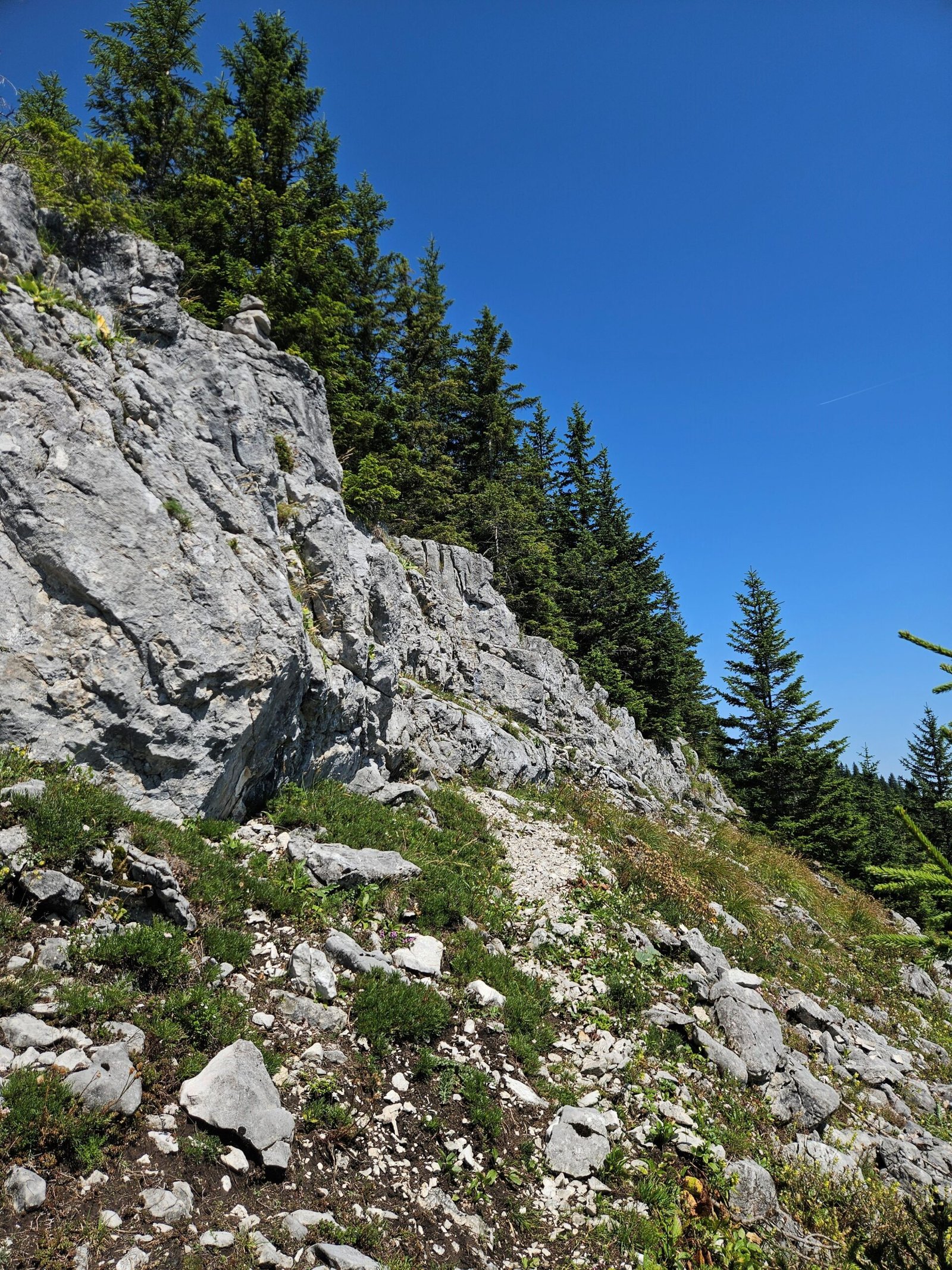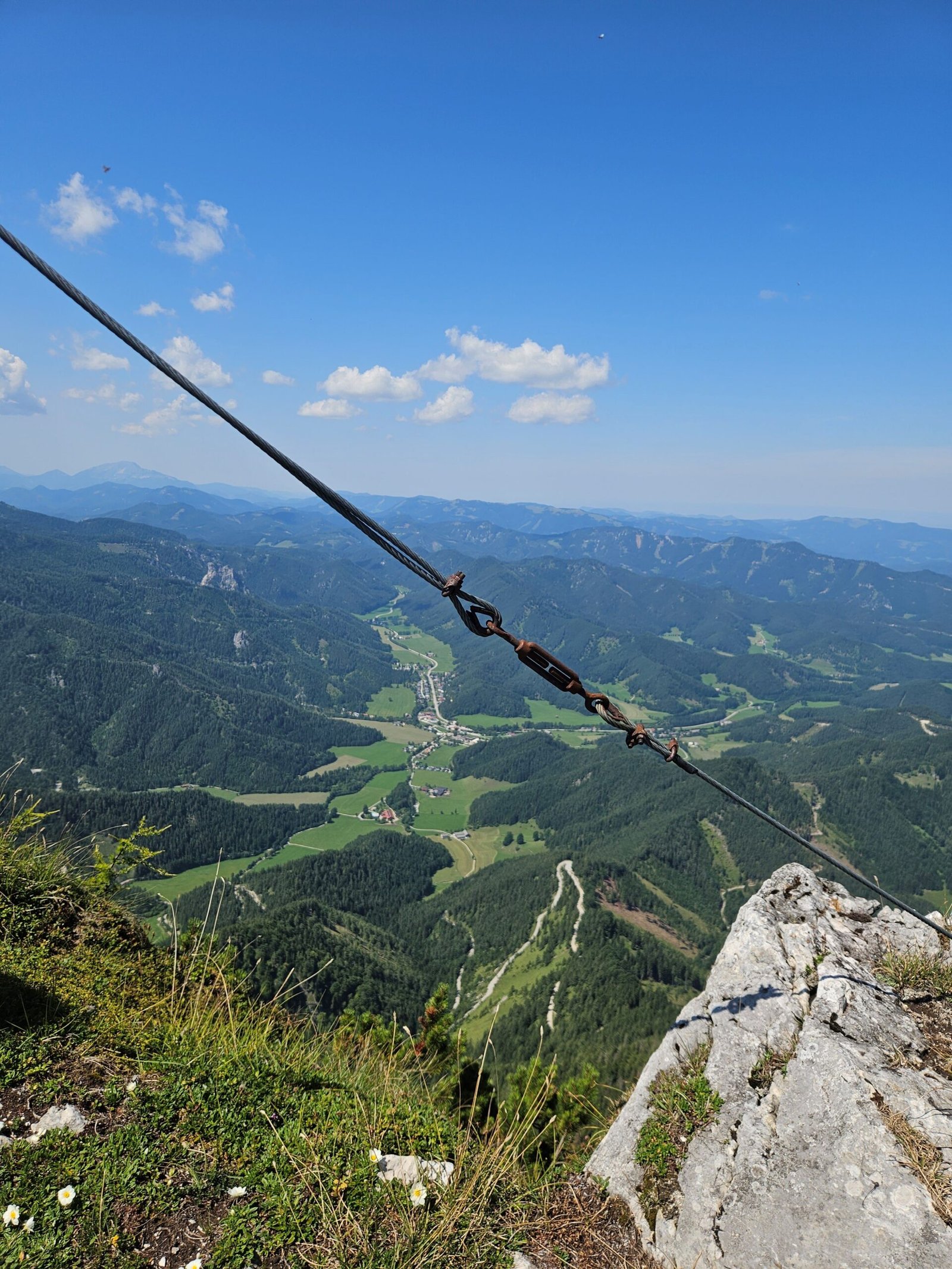 Während der Grat immer spitzer zuläuft, freuen wir uns über jedes kleine Bäumchen, welches uns hier noch angenehme Kühle spendet, denn Schatten ist von hier bis zum Gipfel absolute Mangelware. Am Ende des kleinen Bergwäldchens stehen wir dann recht unvermittelt vor dem Ende des Weges. Zumindest scheint es so, denn an ein Weiterkommen ist hier auf den ersten Blick nicht zu denken. Die Schlüsselstelle -und gleichzeitig der einzig versicherte Abschnitt des Steigs- überwindet den schärfsten Gratabschnitt mithilfe einiger gezielt platzierter Klampfen und dem einen oder anderen Stahlseil. Die Kletter(steig)schwierigkeit begrenzt sich auf ein absolutes Minimum (A/B), die viel beschworenen Schwindelfreiheit und Trittsicherheit sind hier aber zwingend erforderlich. Links geht es hier ein paar hundert Meter fast senkrecht nach unten, rechts immerhin auch um die hundert. Spannenderweise müssen wir die Kletterstelle aber nicht hinauf- sondern abklettern. Das stellt vielleicht auch die größere Herausforderung dar, als die reine Kletterschwierigkeit, denn es erfordert wie gesagt etwas Überwindung hier in den doch recht abschüssigen Gratverlauf hinein- und hinunterzukraxeln, als es vielleicht im Aufstieg der Fall wäre. Mit etwas nachgeschärfter Konzentration, immerhin befinden wir uns bereits in einem recht fortgeschrittenen Abschnitt der Tour, hangeln wir uns am Stahlseil nach unten. Etwas Vorsicht, denn oft hat das Seil ein wenig Spiel und ist bei einer Sanduhr im unteren Teil besonders locker verlegt worden. Wir verlassen über eine letzte leicht ausgesetzte Querung den Mittelteil und begeben uns hinüber in die abgewaschenen Felsstufen des südwestlichen Gipfelaufbaus. Hier ist die Wegfindung nicht immer so einfach und der Weg teils schlecht bis gar nicht markiert. Da hilft nur immer wieder ein beherzter Blick auf die Karte, denn das wesentlich verweilfreundlichere Gelände ist dafür nach der doch etwas pulsaktivierenden Partie von vorhin recht gut geeignet. Wir halten uns, auch wenn so manche Steigspur etwas anderes vermuten lassen würde, eher links und überwinden in weiterer Folge unschwierig zwei kleine Felsbänke.
