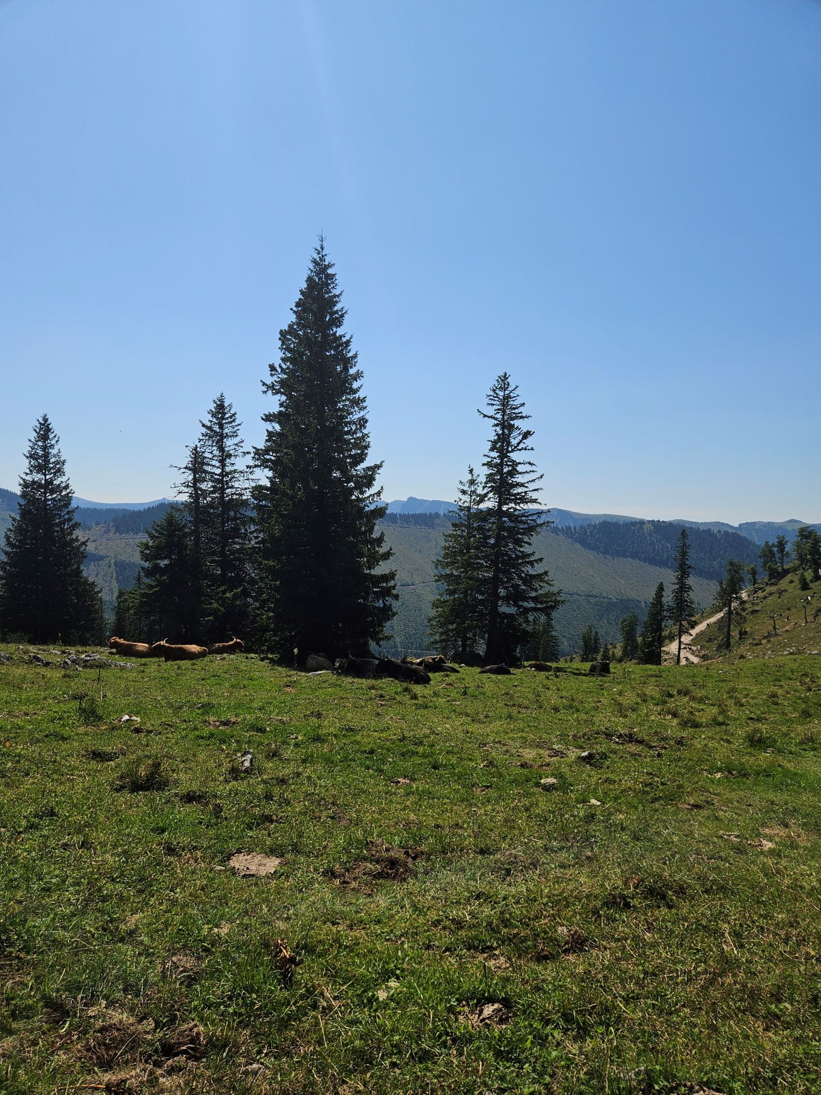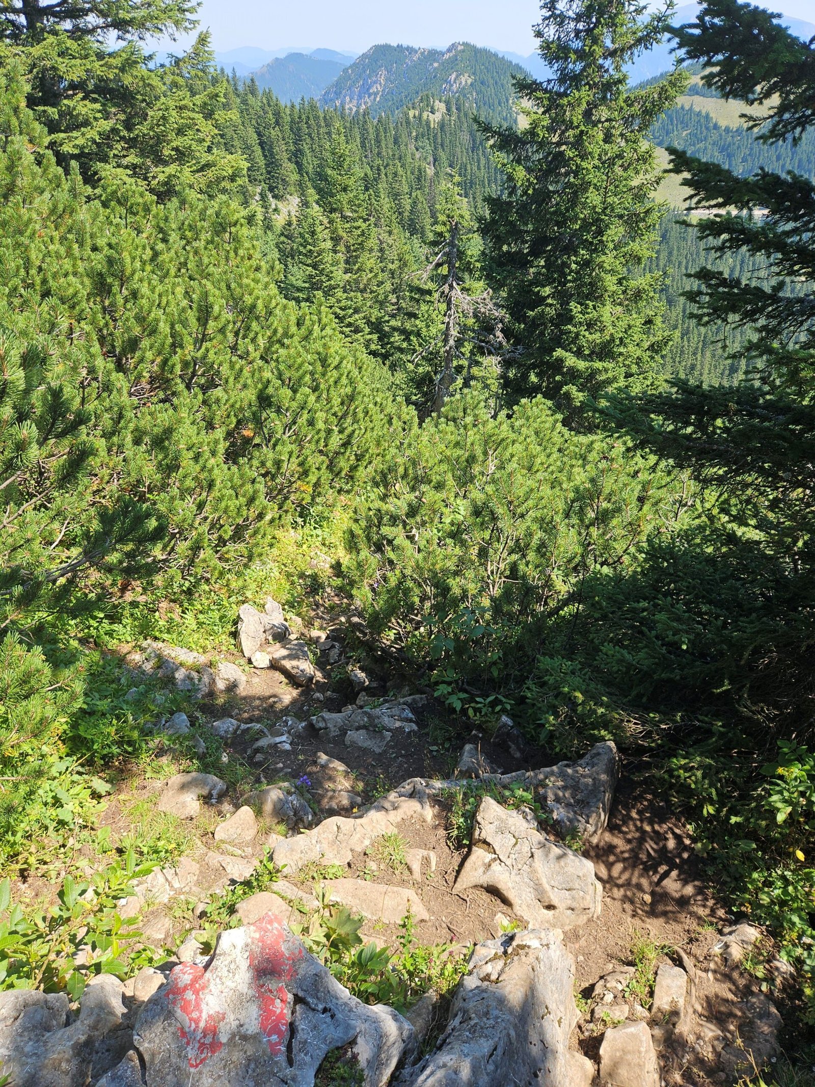 Von der Felskanzel des Gupfs genießen wir einen herrlichen Rundumblick. Nach einer kurzen Pause und dem obligatorischen Gipfelfoto steigen wir hinunter Richtung Gippelalm. Über einen deutlich einfacheren Wanderweg geht es durch Latschen und über kleinere Weideflächen dahin.