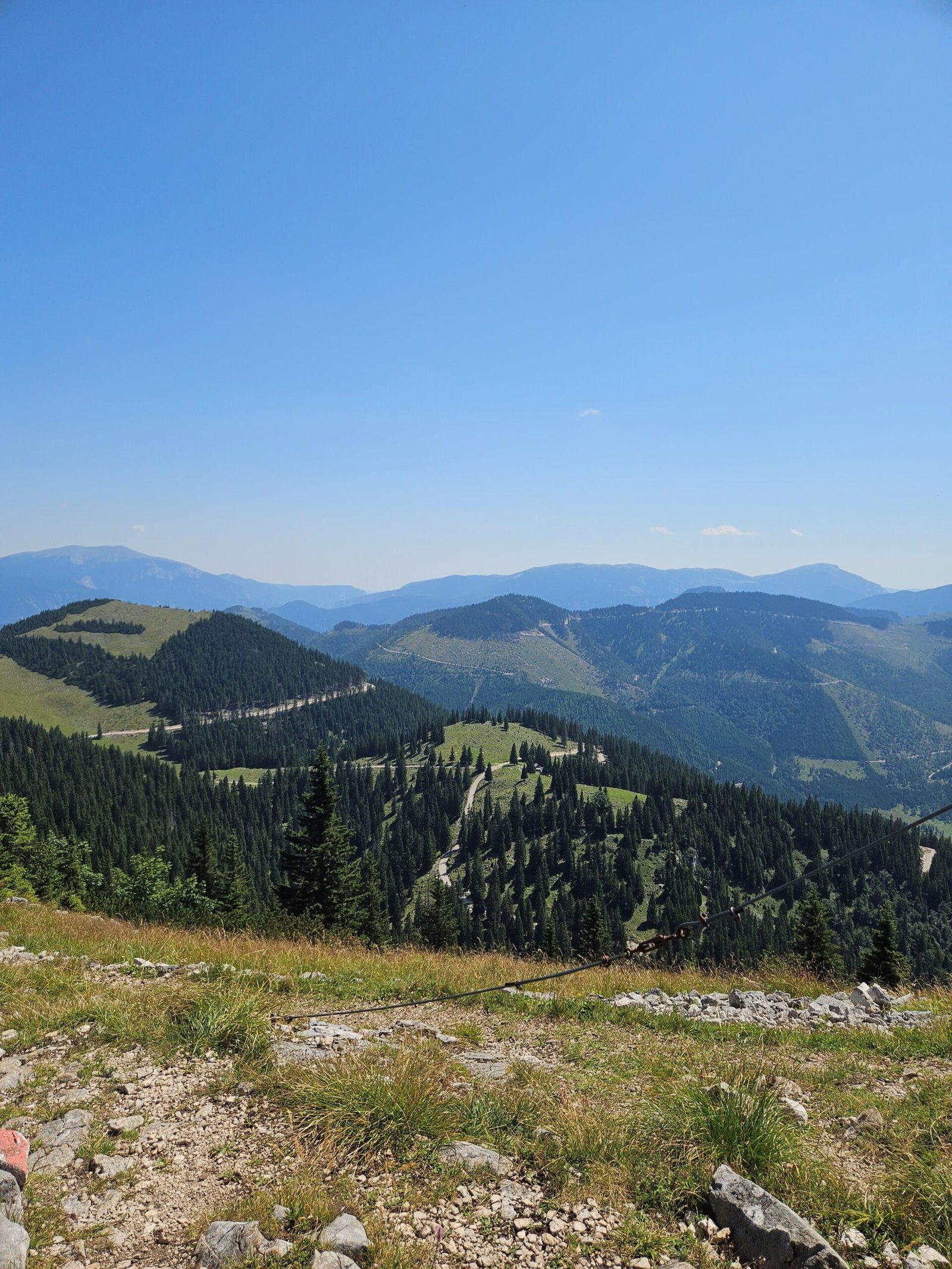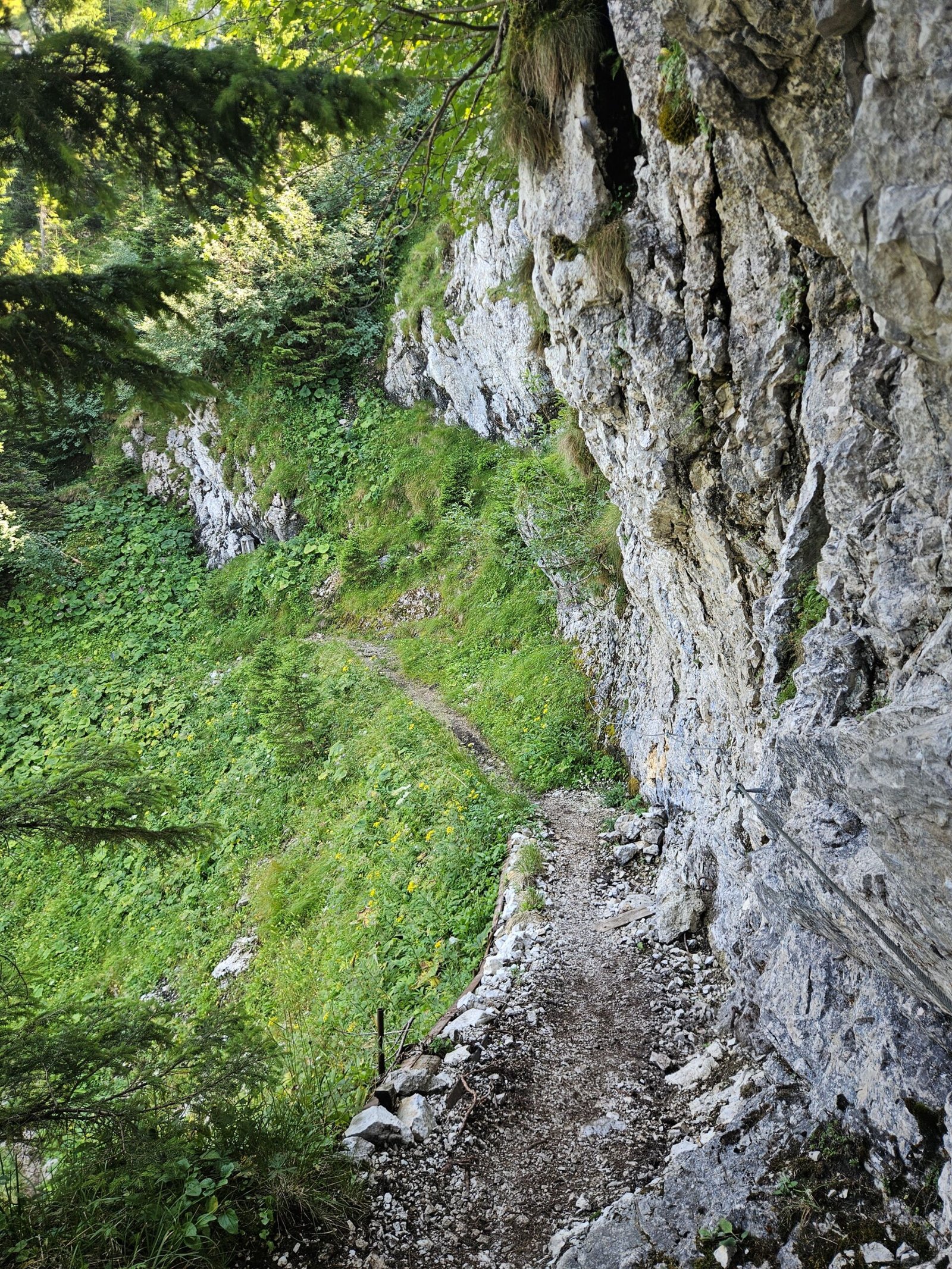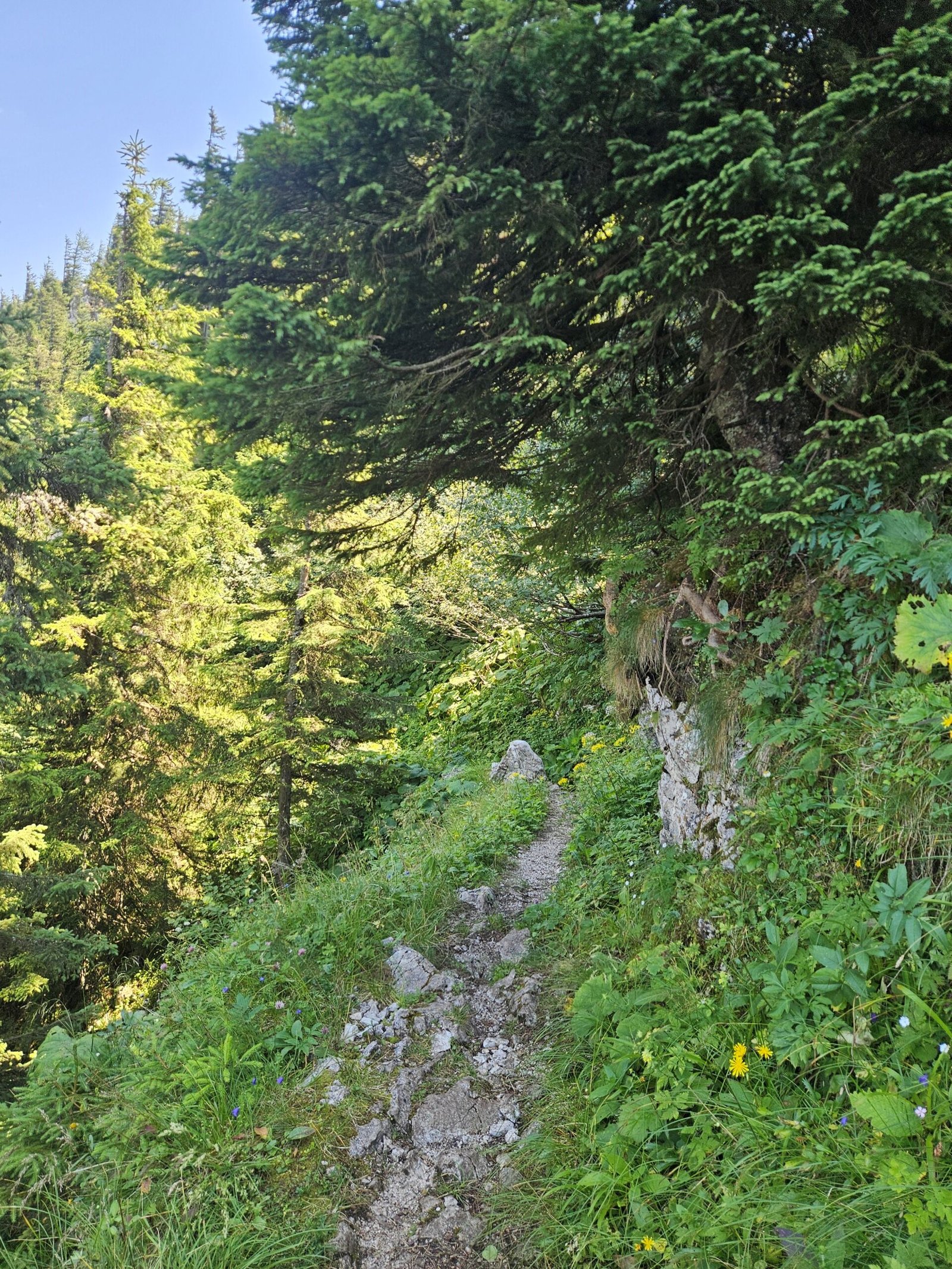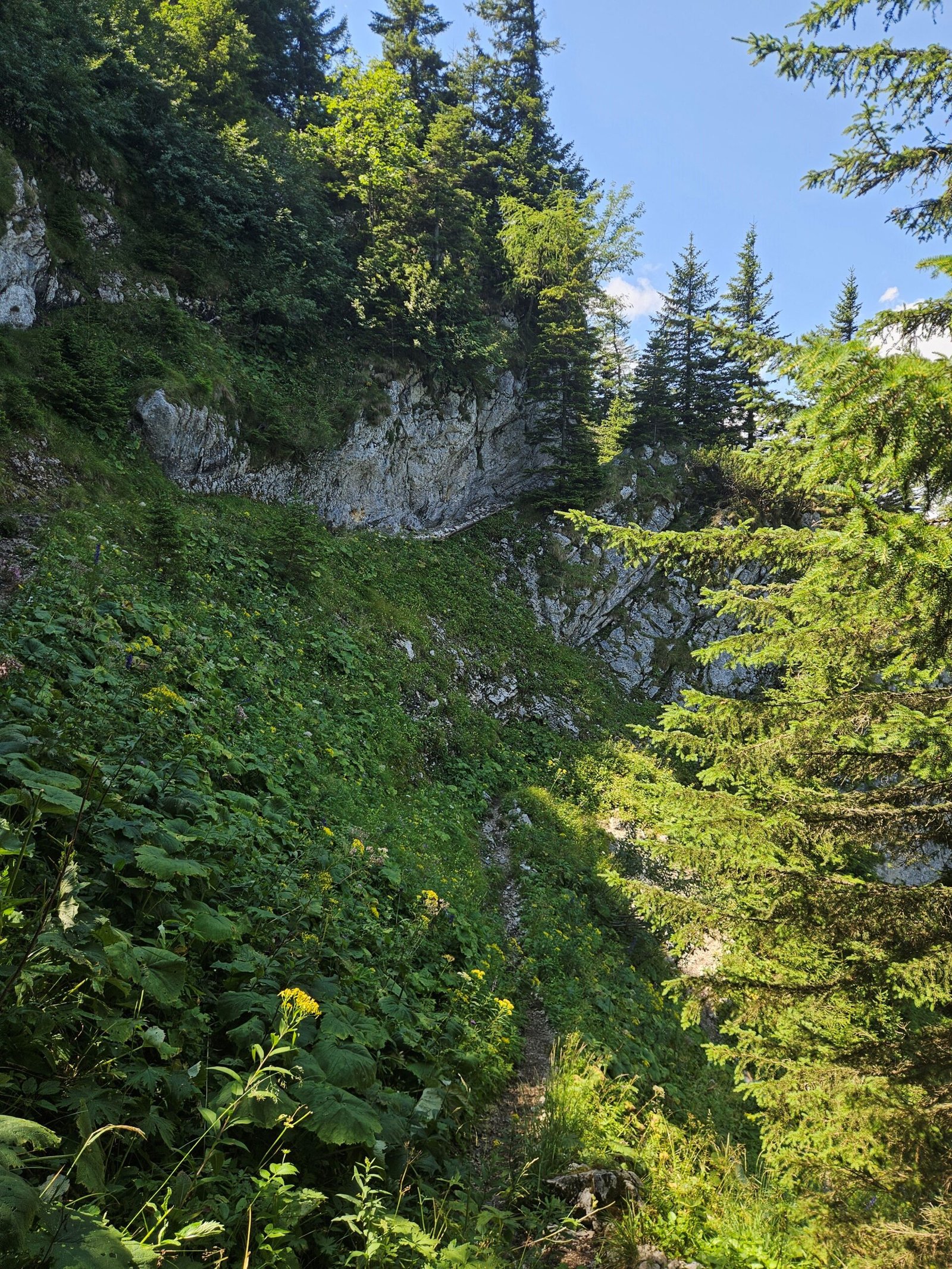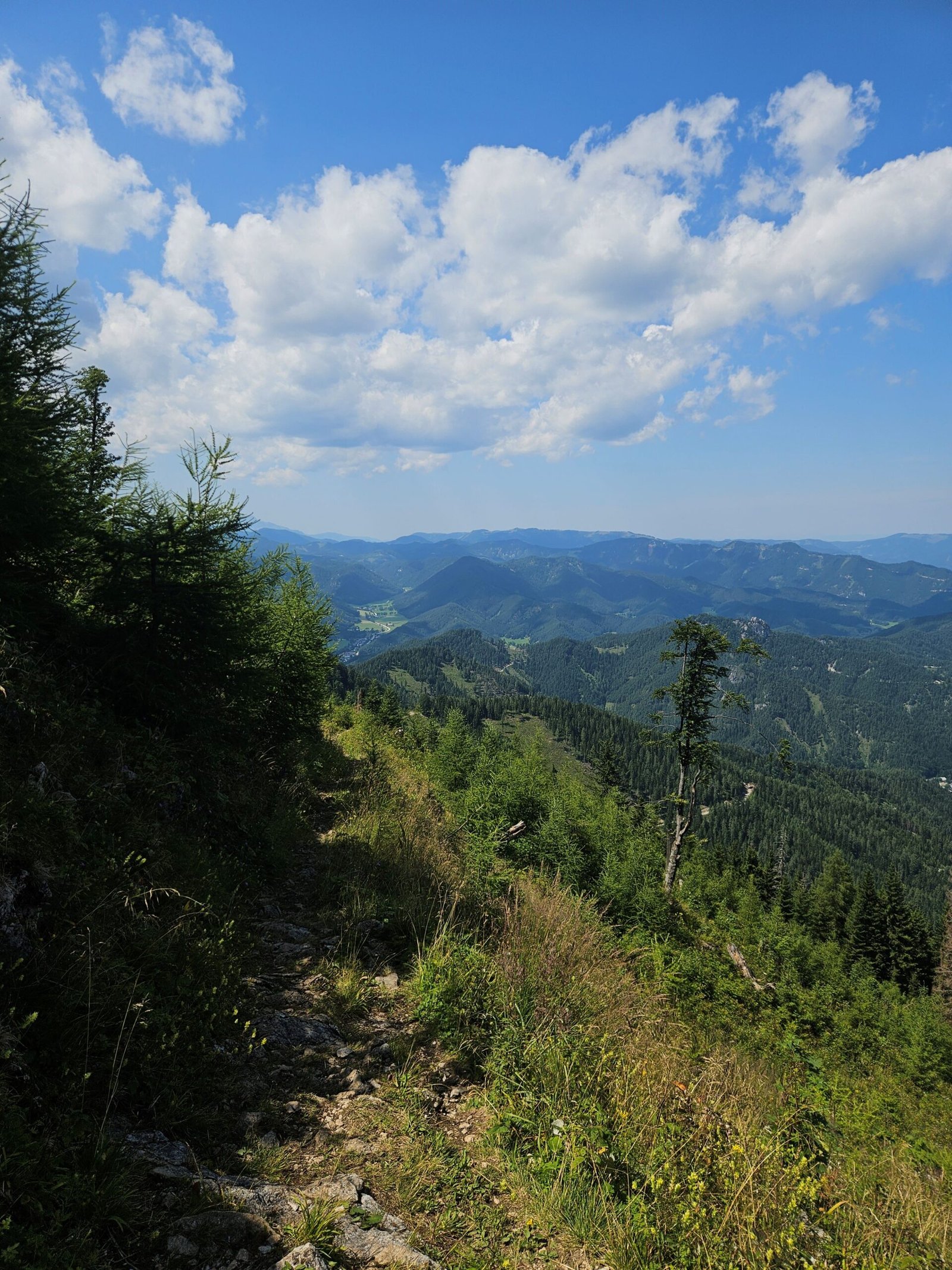 Am Gippeltörl wechseln wir dann -gottseidank- endlich auf die dunkle Seite des Mondes, denn der Treibsteig liegt angenehm schattig auf der Nordseite der Felswände des Gippels und kann dadurch mit durchaus erträglichen Temperaturen aufwarten. Entgegen der Kartenmarkierungen handelt es sich hier aber nicht wirklich um einen Kletter-, sondern einen gut ausgebauten und nur kurz mit einem Stahlseil versicherten Wandersteig, auf dem dem Namen nach auch Kühe mehr oder weniger gemütlich auf die Almfläche gelangen können oder konnten. Auf dem schmalen Pfad geht es schnell bergab, die eng gezogenen Serpentinen mit dem knallgrünen Bewuchs wecken dabei Erinnerungen an die Nordseite des Schafbergs. Bald finden wir uns wieder in der gewohnt hügeligen Bergwelt des südlichen Mostviertels. Der Gippel erscheint in dieser Landschaft fast wie eine unnatürliche Erscheinung, genauso wie der von beinahe omnipräsente und weithin sichtbare Bruder Ötscher.