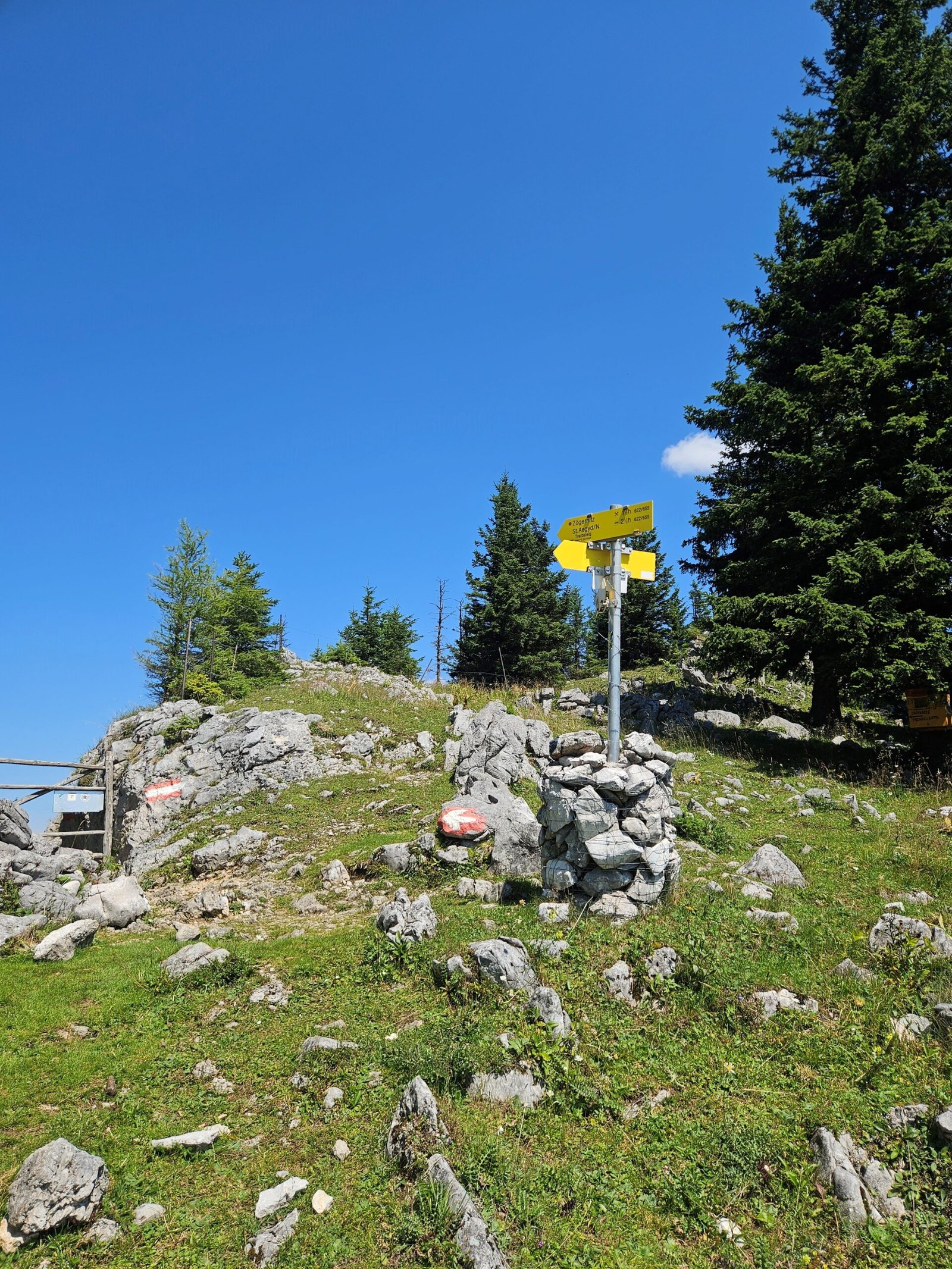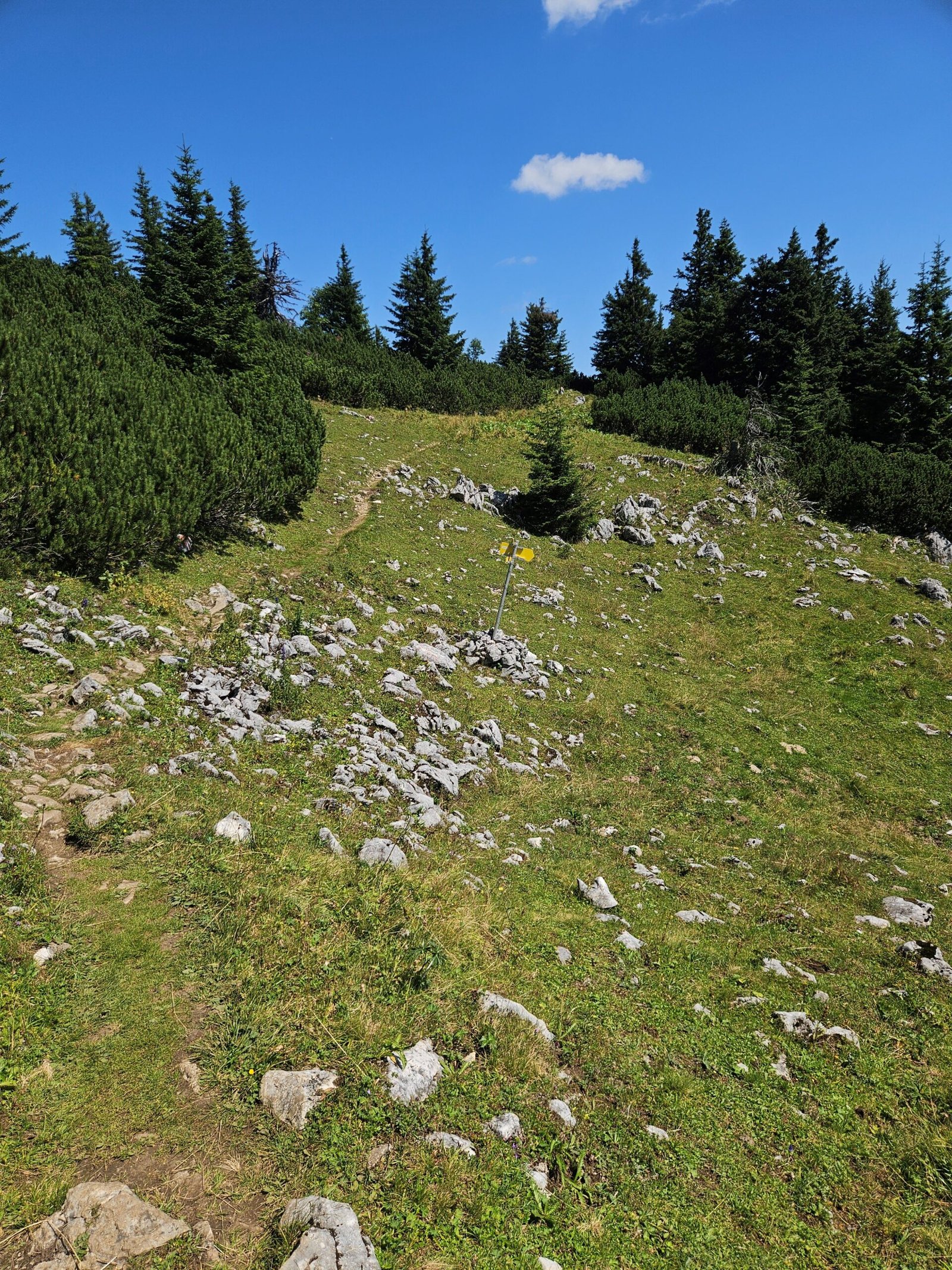 Vorher geht es aber noch ein kurzes Stück bergab zum Sattel an der bereits genannten Polwischalm, wo sich im Sommer gerne ein paar Kühe an der grünen Wiese gütlich tun. Am Ende der Freifläche müssen wir uns dann für den letzten Wegabschnitt entscheiden. Entweder folgen wir nach rechts dem Roman-Majewski-Steig, welcher uns unterhalb des Gipfels auf die Seite der Gippelalm hinüberführt. Oder wir steigen links hoch bis an das scheinbare Ende vom Gelände, steigen über einen Weidezaun und befinden uns damit direkt am Einstieg des (zumindest hier) unmarkierten ÖBRD-Steigs (laut Internet 1+/A/B; meiner Meinung nach halten sich die Schwierigkeiten in Grenzen, er ist halt einfach im ersten Abschnitt ganz ordentlich ausgesetzt und es braucht vielleicht etwas Geschick und Überwindung beim Abklettern der Kletterssteigstelle).