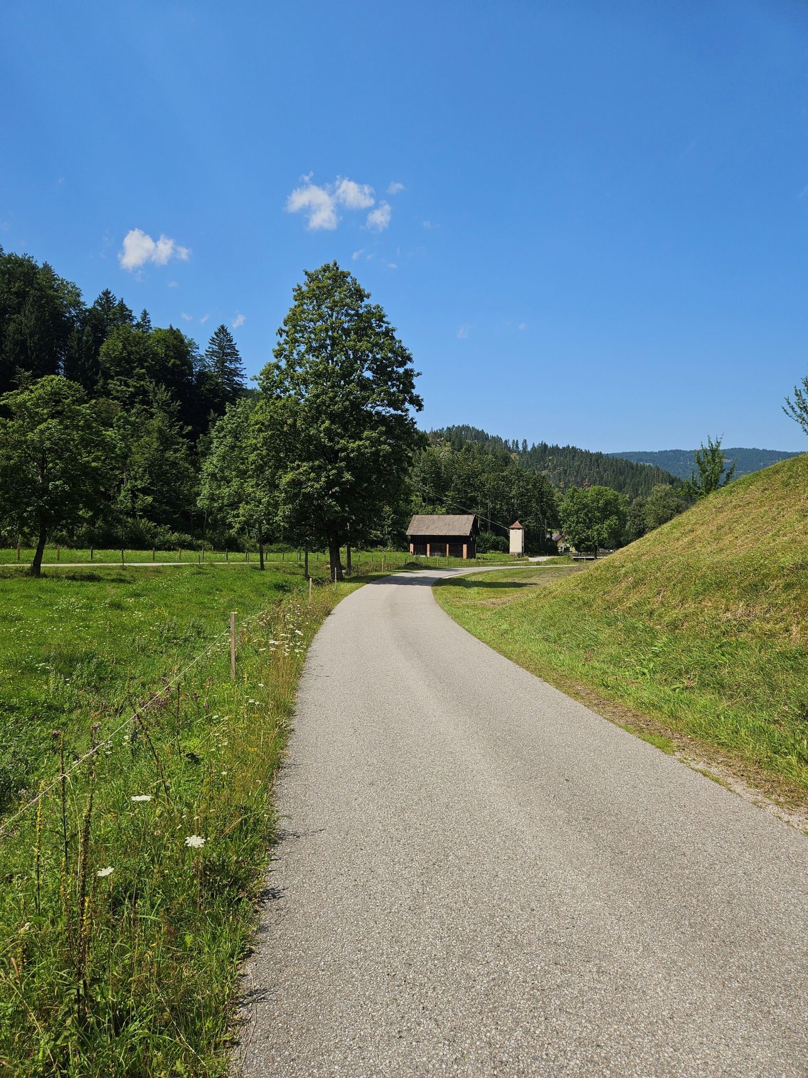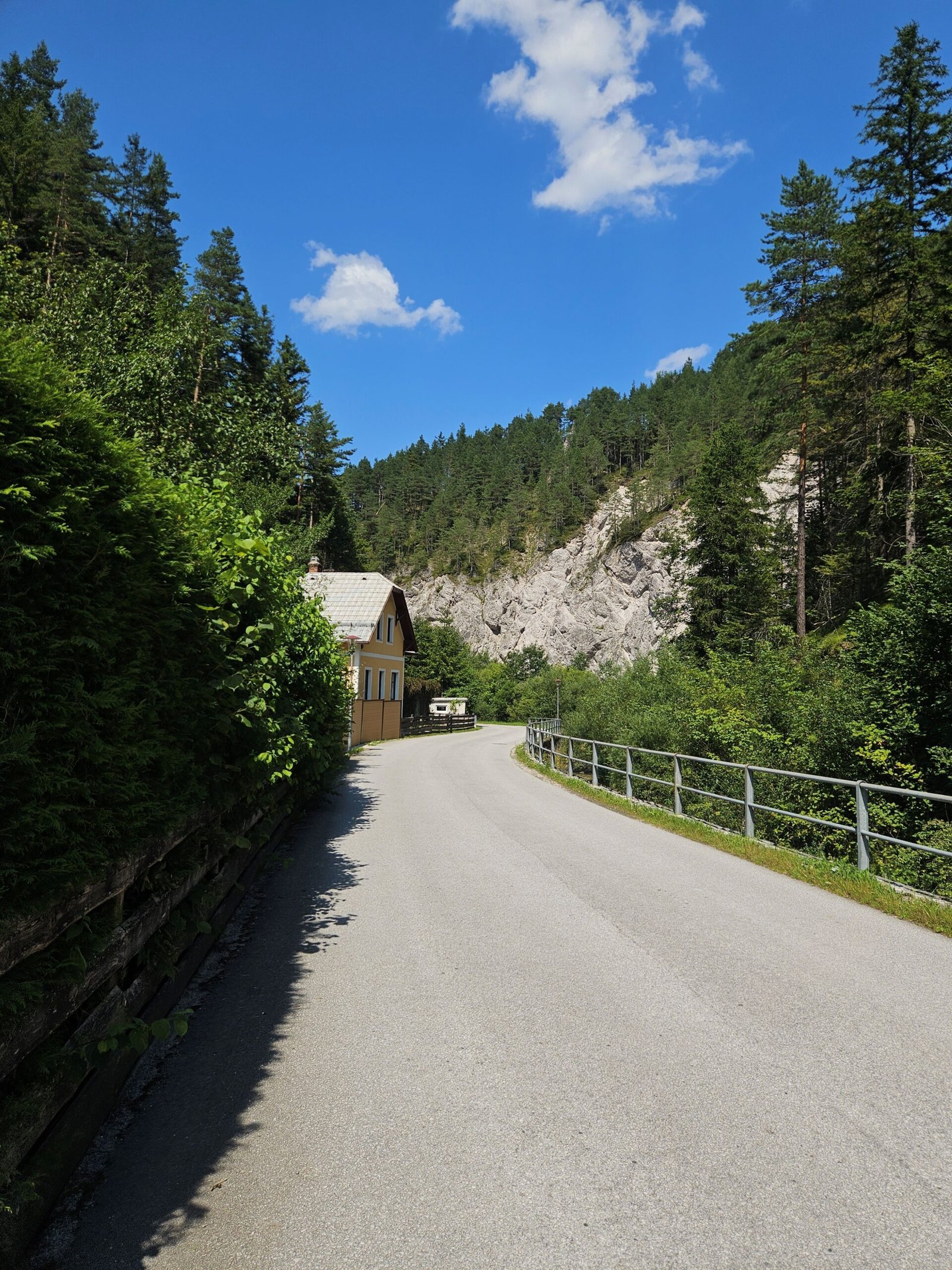 …nicht aber für uns, denn als brave Erdenbürger gönnen wir uns auch noch den elendigen Hatscher auf der von der Sonne backofenartig aufgeheizten Straße. Diese bringt uns völlig unereignisreich, aber brennheiß, in gut vier Kilometern nach St. Aegyd am Neuwalde und damit zur schon sehnsüchtig herbeigewünschten Busanbindung. Das verheißungsvolle Bachbett an der Straße füllt sich dabei im Hochsommer erst im letzten Drittel des Abschnitts und kann daher nur bedingt für Abkühlung sorgen. Ein kleiner Trost: Direkt neben der Bushaltestelle befindet sich dann aber ein Supermarkt, bei welchem sich auch der gröbste Durst stillen lässt.
