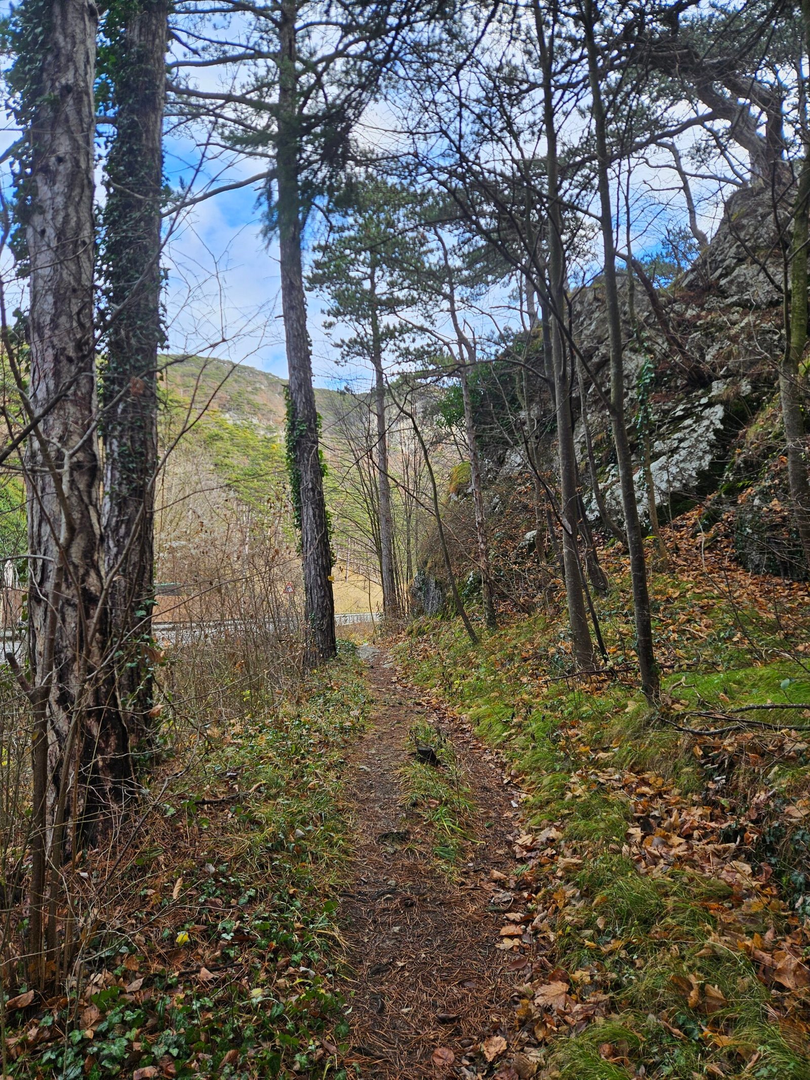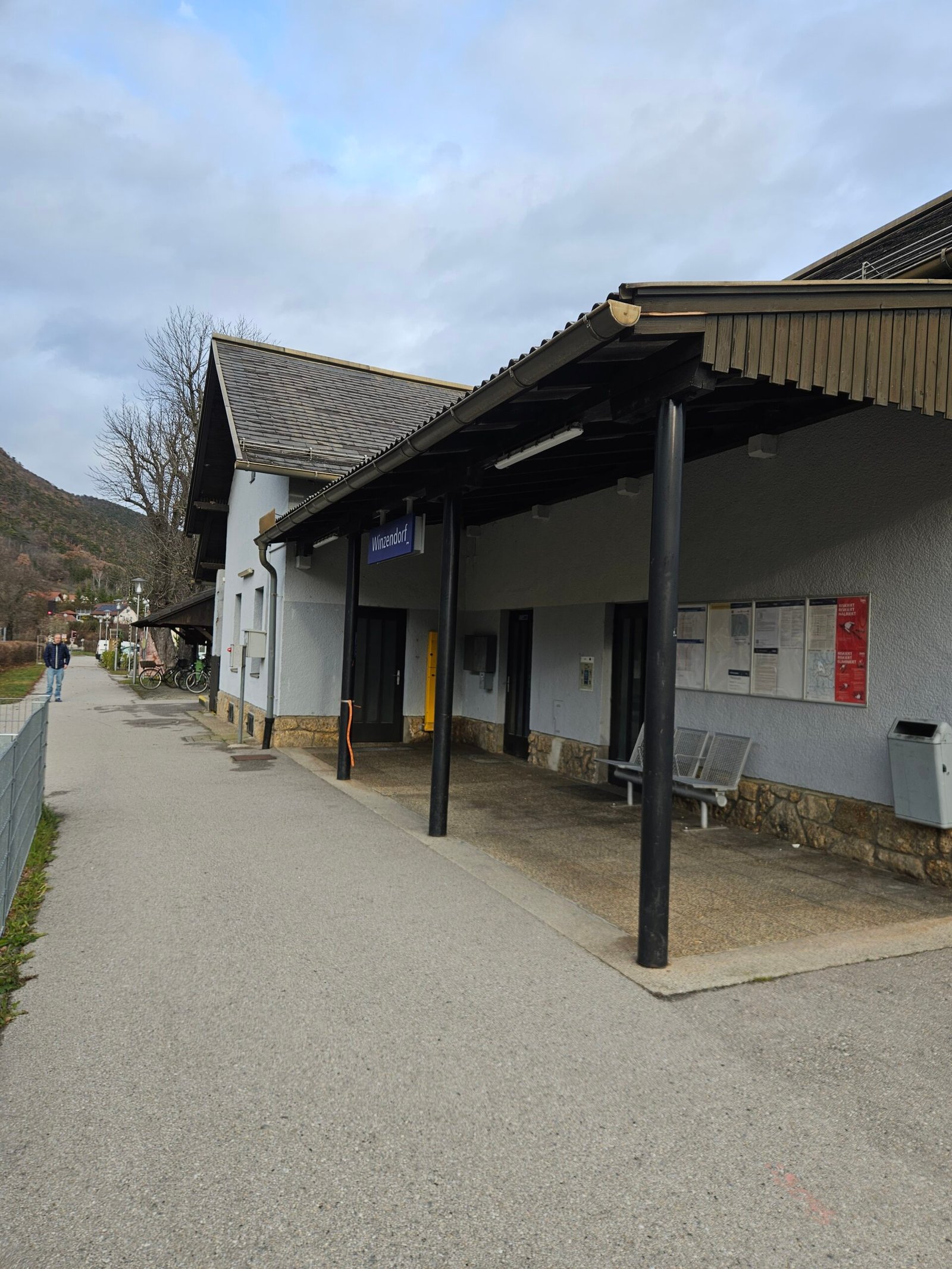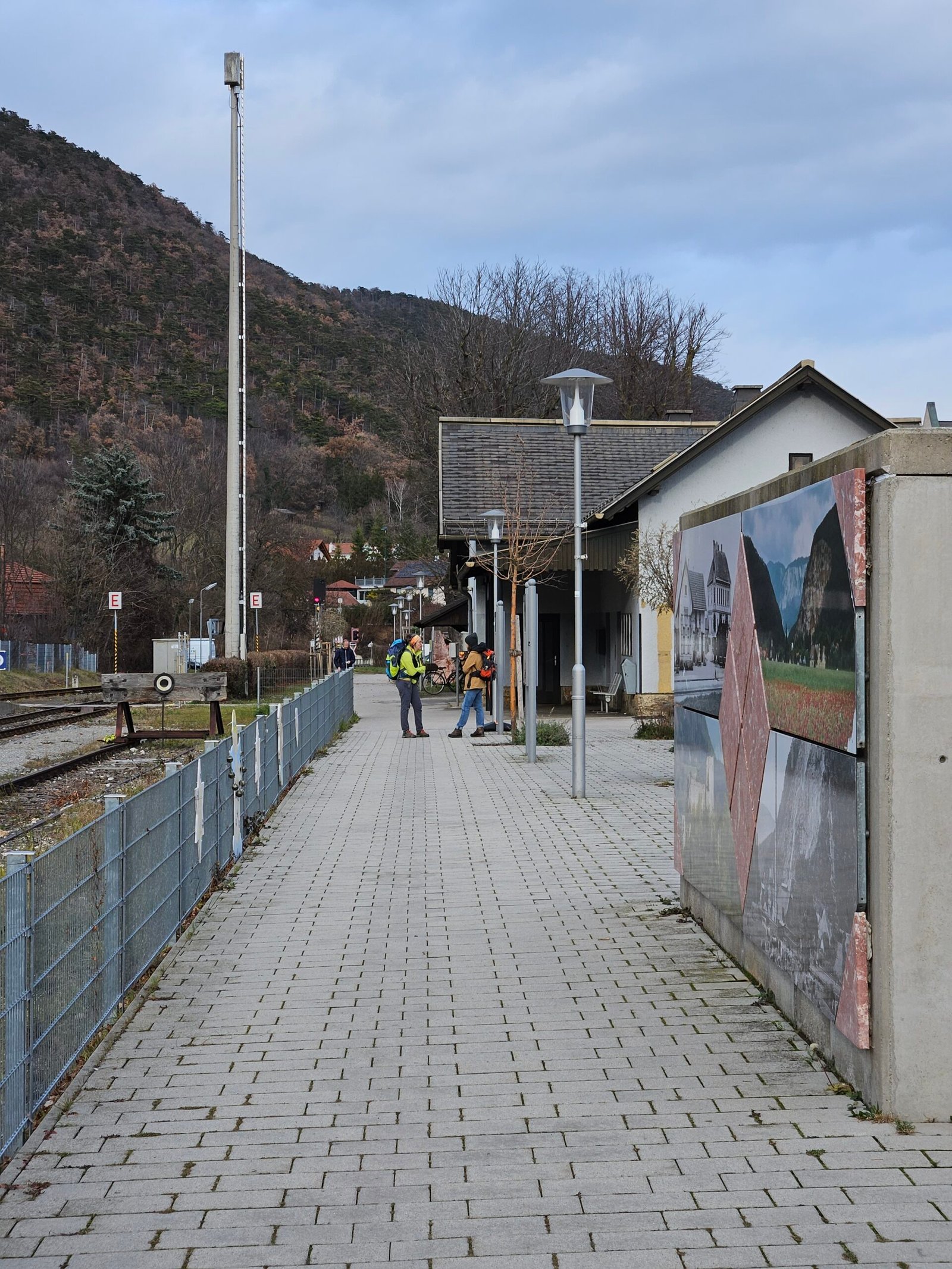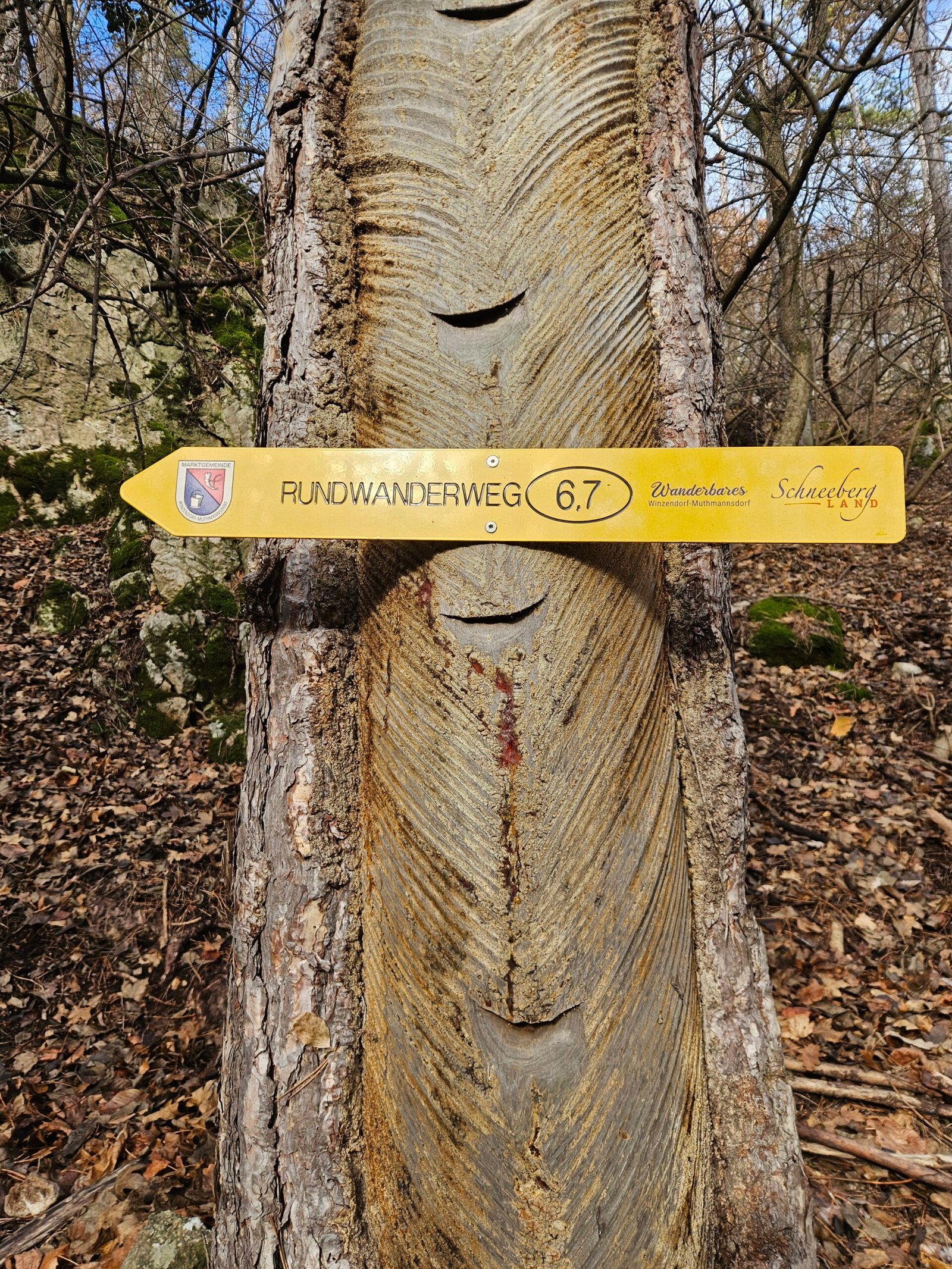 Wir starten unseren fast schon frühlingshaften Dezember-Ausflug von der Bahnhaltestelle Winzendorf. In Richtung Hohe Wand folgen wir zuerst der Straße nach Nordwesten, vorbei an den Winnetour-Festspielen im benachbarten Steinbruchgelände, queren dann die Straße nach links und stapfen gut einen Kilometer am Jubiläumssteig den Prossetbach entlang.
