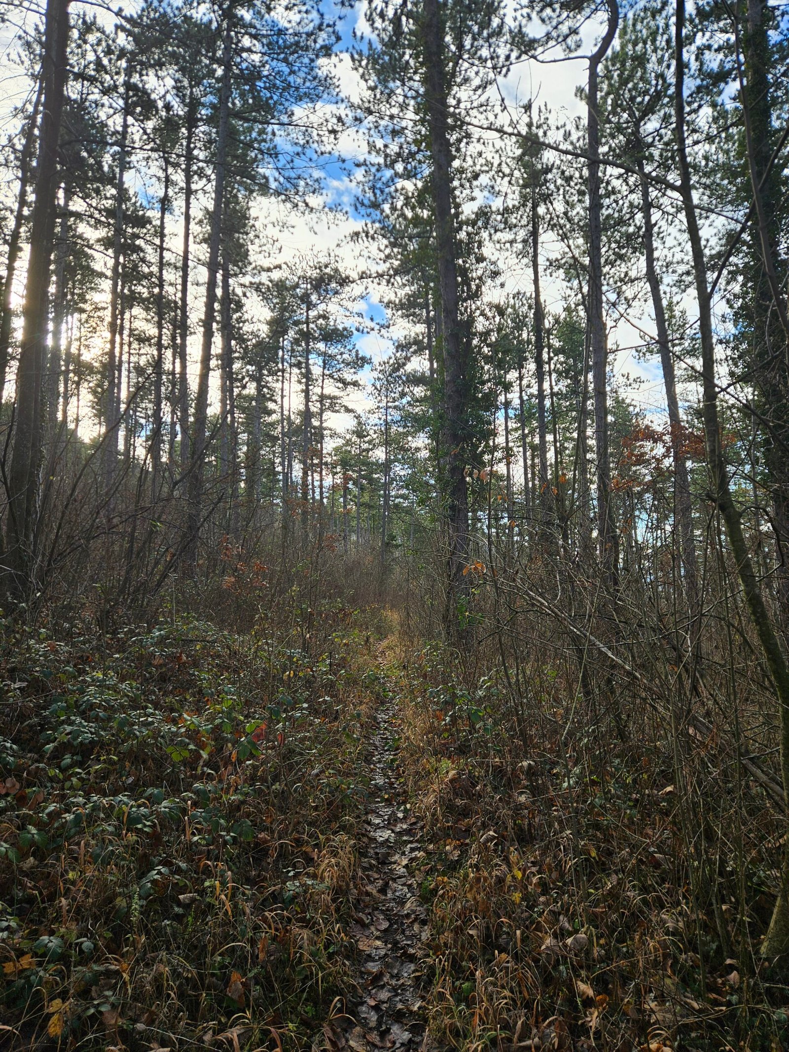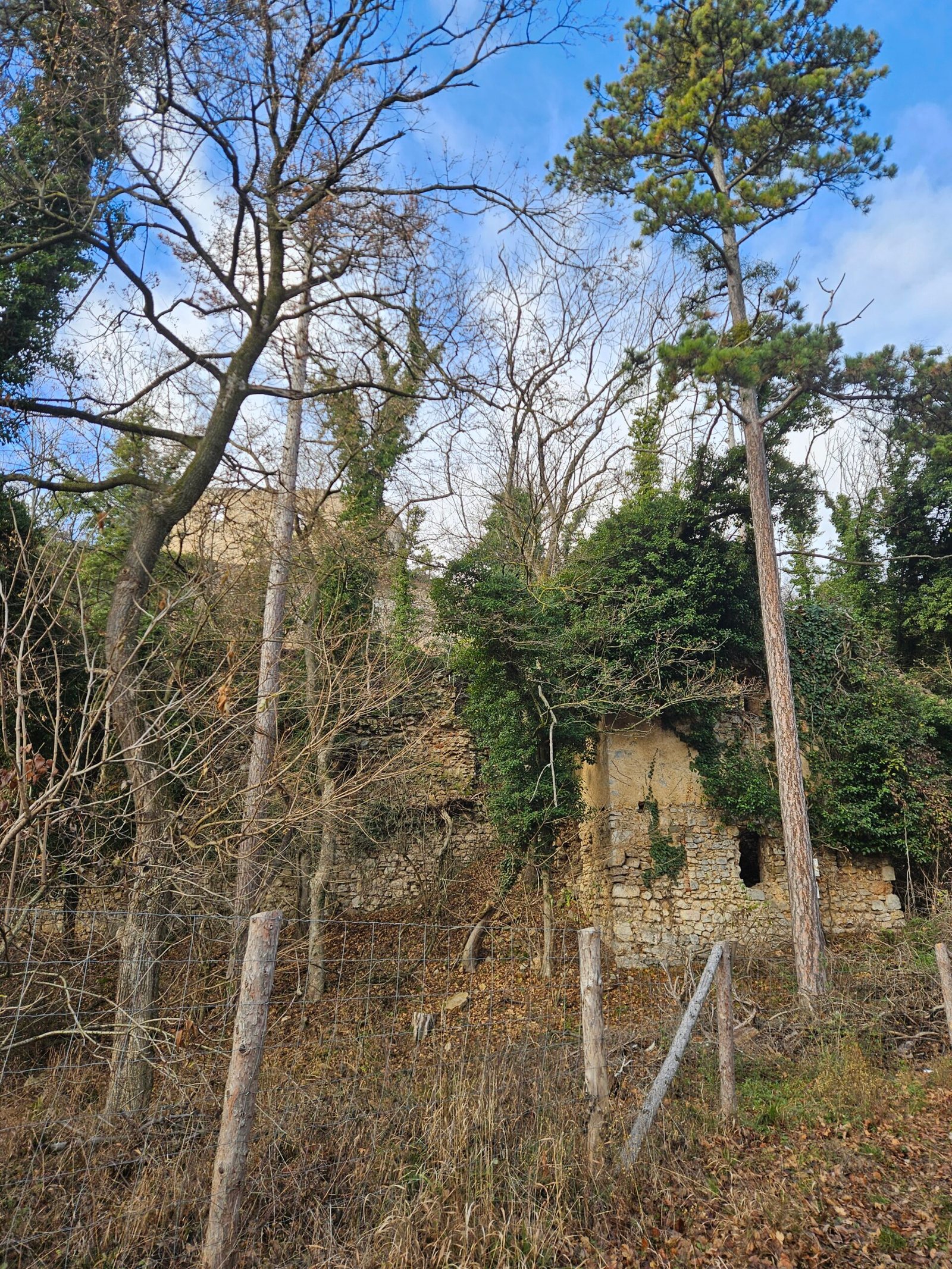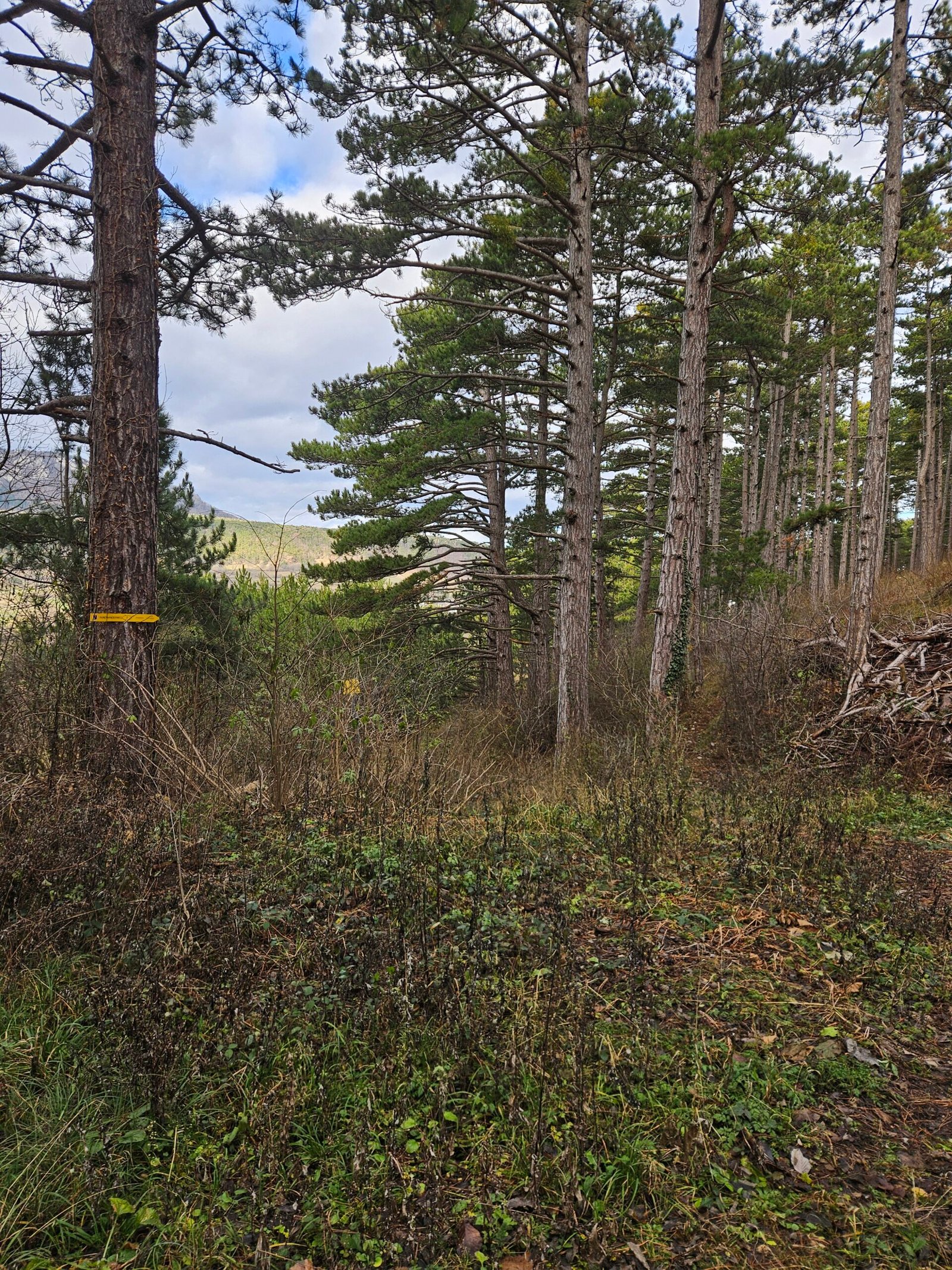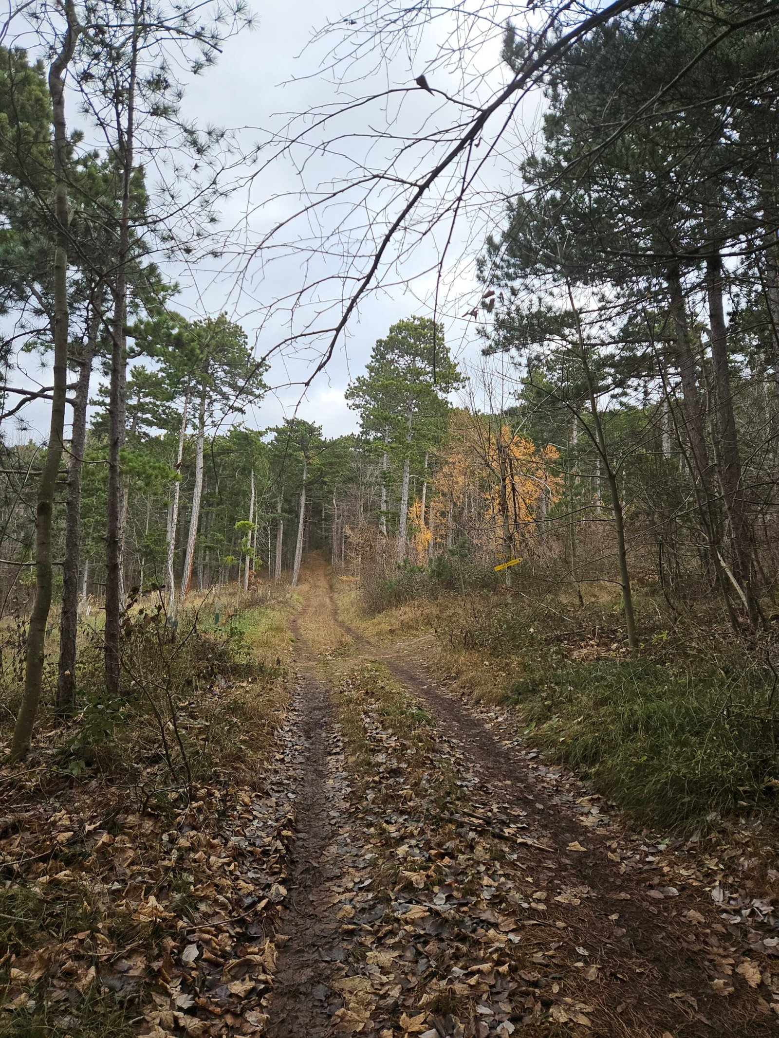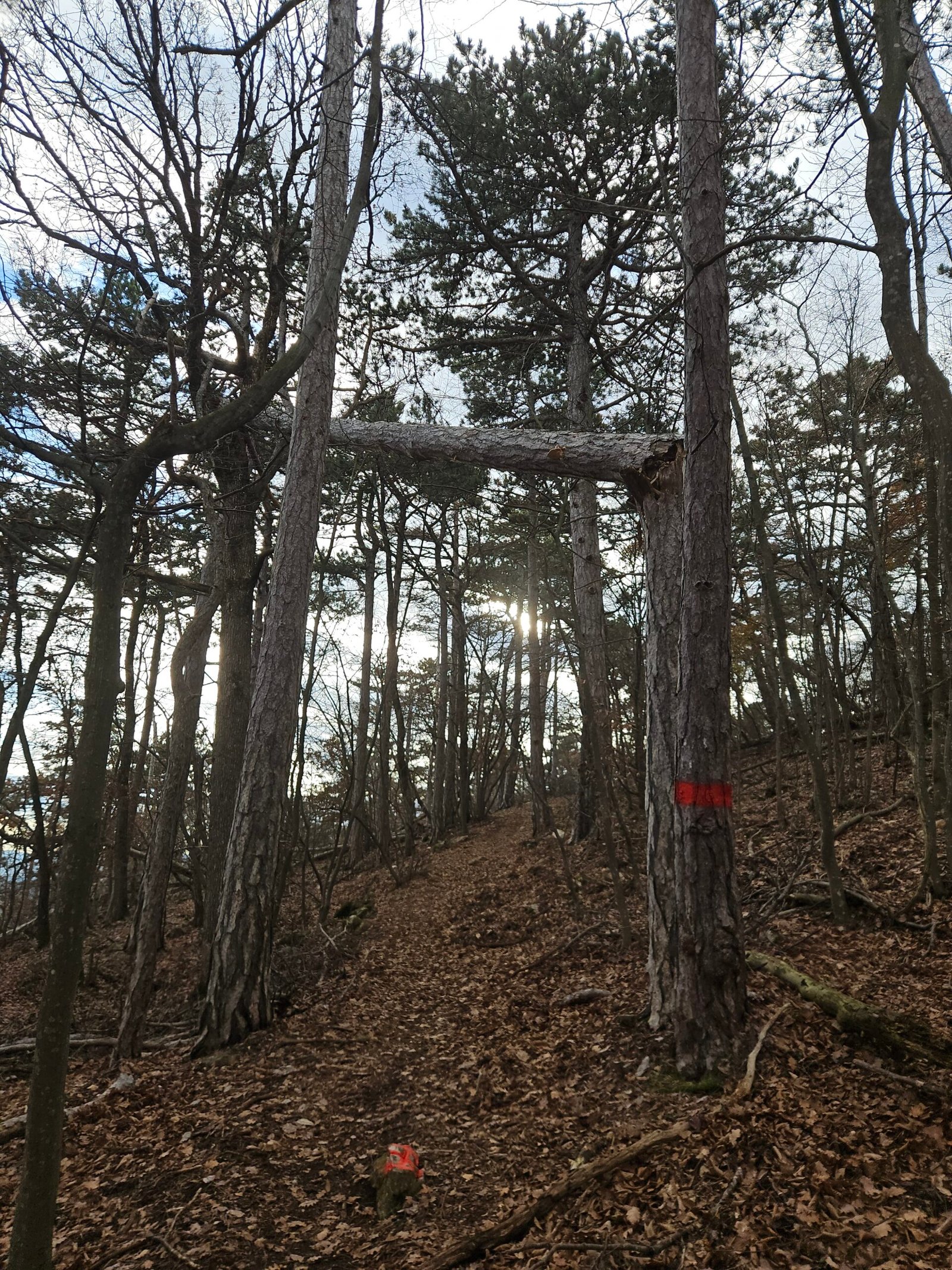 Am Ende des malerischen, aber dennoch sehr verkehrsnahen Wegleins müssen wir wieder zurück auf die viel befahrene Landstraße. Ein kleiner Holzsteg bringt uns retour auf den Straßenboden der Tatsachen und tatsächlich müssen wir jetzt wieder ein paar Meter auf dem Gehsteig zurück gen Winzendorf wandern, bevor wir bei der kleinen Häuseransammlung in Emmerberg nördlich in den Wald hineinstechen. In weiterer Folge orientieren wir uns eigentlich immer an den Wanderwegen Nummer 6 und 7, die hier durchgehend gut beschildert sind. Ein schmaler Trampelpfad führt uns nunmehr leicht bergauf zur (behördlich gesperrten) Burgruine Emmerberg. Vorbei am ehemaligen Burgtor steigen wir auf der anderen Seite wieder hinunter und wandern auf einer gut befestigten Forststraße nach Nordosten, die bald darauf in einen leicht überwachsenen Waldpfad mündet.