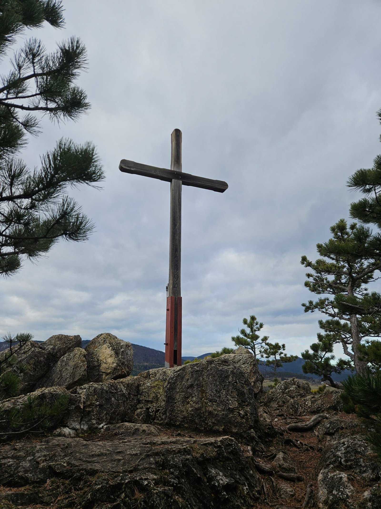 Wir flanieren nunmehr über sanfte Wanderwege -immer parallel zur Hohen Wand- nach Nordosten, bis wir kurz vor Muthmannsdorf wieder auf die anfängliche Landstraße 87 treffen. Kurz darauf verlassen wir diese aber auch schon wieder und begeben uns nach rechts auf den rot-markierten Größenbergweg. Dieser führt uns zuerst gemächlich ansteigend Richtung Zimesberg, biegt dann wiederum nach rechts ab und steigt dann etwas steiler zum Größenberg hinauf. Der beschauliche Gupf, identifizierbar durch ein kleines Holzkreuz, trägt den Namen vielleicht mit seinen gut sechshundert Metern über Null etwas zu Unrecht, der Ausblick lohnt sich aber allemal für ein Gipfelfoto. Nicht nur die nahe Hohe Wand lässt sich von hier aus gemütlich von einem Bankerl aus inspizieren, der Blick reicht auch bis zum (in unserem Fall kaum angezuckerten) Schneeberg.