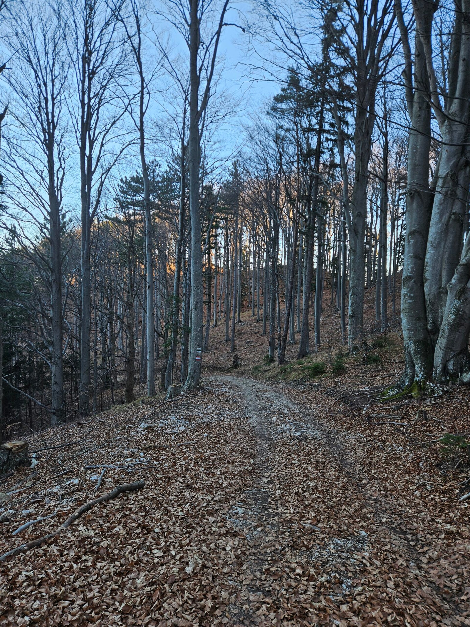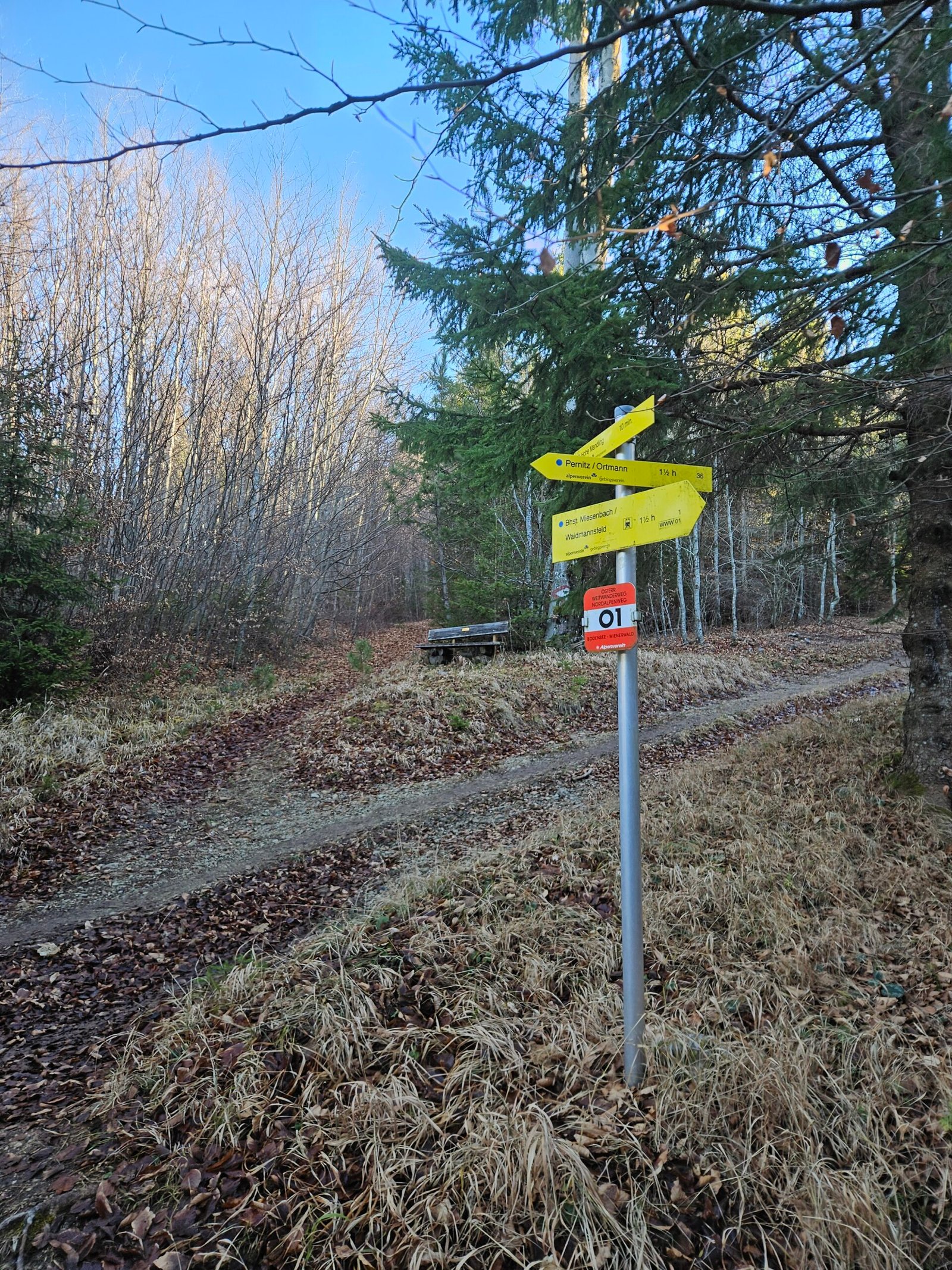 Damit haben wir auch schon den höchsten Punkt unserer Tour erreicht. Die Hohe Mandling (967m) ist dabei sicher kein großartiger Aussichtsgipfel, die herrlich sonnige Hochfläche mit dem kleinen Gipfelkreuz und einer Jausenbank lädt aber dennoch das ganze Jahr über auf einen Abstecher ein. Vor allem im Herbst und Winter kann man hier auch sehr gut dem hartnäckigen Nebel entfliehen. Dann wird es etwas schwierig den richtigen Weg zu finden. Der Weiterweg Richtung Fotzeben startet nämlich nicht direkt vom Gipfel, sondern etwas davor und ist aufgrund es Bewuchses nicht immer ganz leicht zu finden. Der Pfad ist dennoch ganz gut markiert und als Teil des Nordalpenwegs, sowie des Wiener Alpenbogens auch halbwegs gut frequentiert. Highlight ist der schattige Abstieg dabei aber sicher nicht, auch die folgende Forststraße kann als einziger Sehenswürdigkeit mit einem Gedenkschild für den letzten in Niederösterreich geschossenen Wolf aufwarten. Dass dabei nicht dem Wolf, sondern dem armen Geschöpf hinter der Büchse gedacht wird, versteht sich in diesen Breitengraden natürlich von selbst.