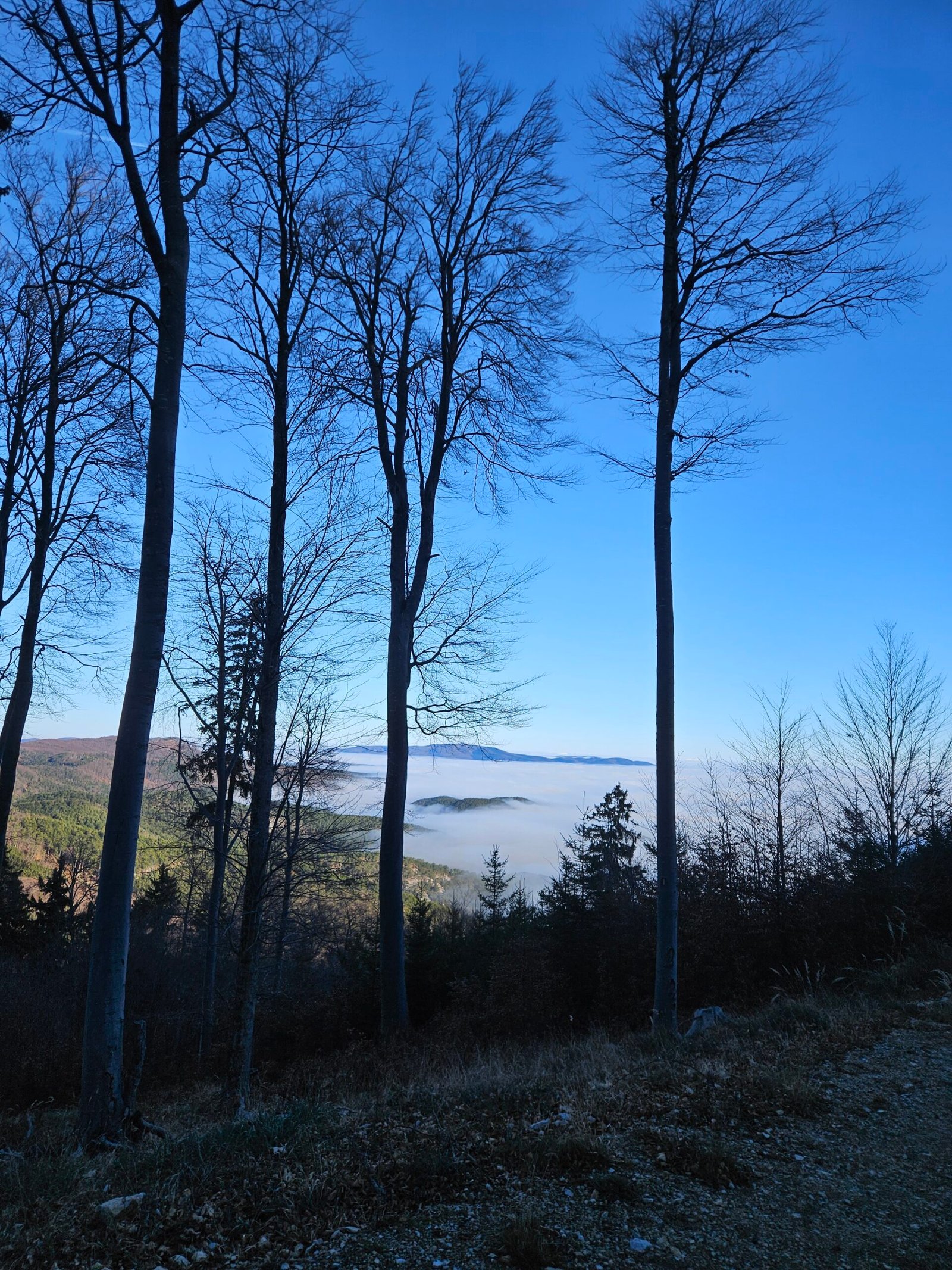 Bei strahlendem Sonnenschein oberhalb der Nebeldecke bahnen wir uns den Weg hinauf. Flachstücke wechseln sich mit kurzen Aufschwüngen ab, richtig steil wird es aber nie. Wir genießen die herrlichen Tiefblicke ins Piestingtal, während wir uns dem immer weiter zulaufenden Endpunkt des Kamms annähern. Auf gut 800 Metern erreichen wir damit auch die “Schlüsselstelle” des Aufstiegs, ein minimal kurzer, leichtestens ausgesetzter Kammabschnitt, der aber wohl nur bei sechs Metern Schnee irgendwelche Probleme bereiten könnte. Das Gelände flacht dann spürbar ab. Linkerhand erhebt sich noch ein kleiner, unscheinbarer Aussichtsfelsen, der zu einem Abstecher einlädt, dann geht es durch ein kurzes Waldstück hinüber zur Forststraße von Ortmann. Wir queren diese und steigen an einem Jägerstand vorbei geradeaus hinauf Richtung Gipfel.