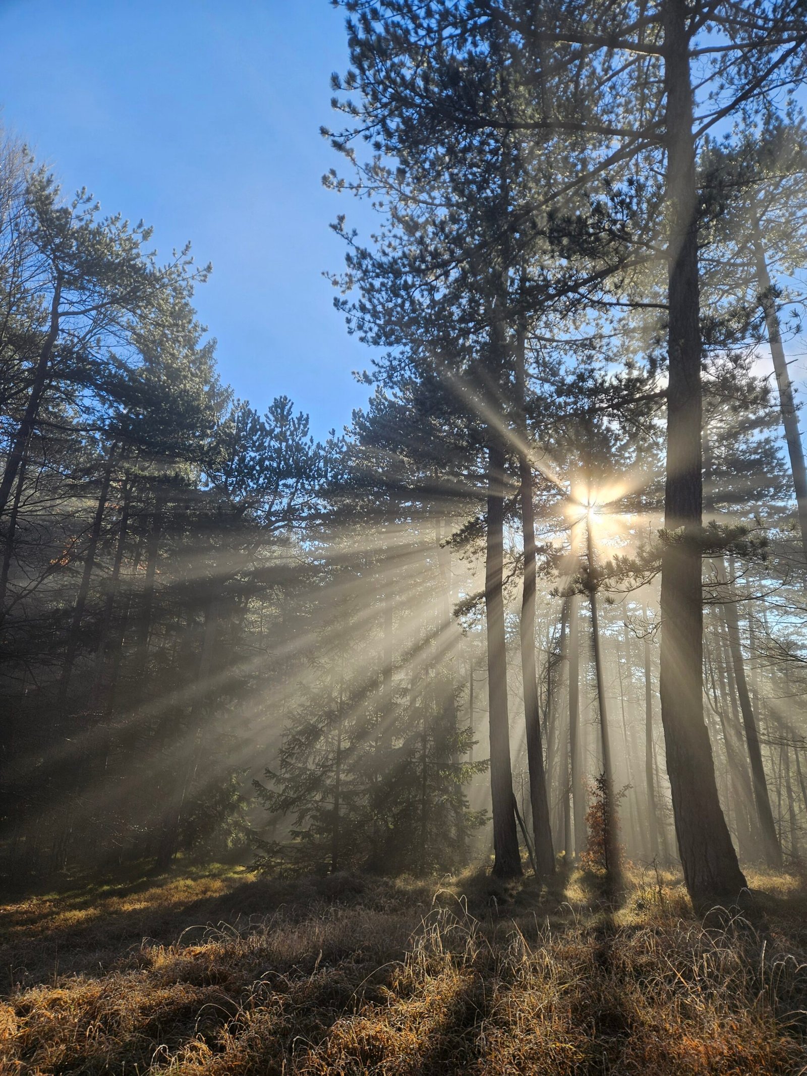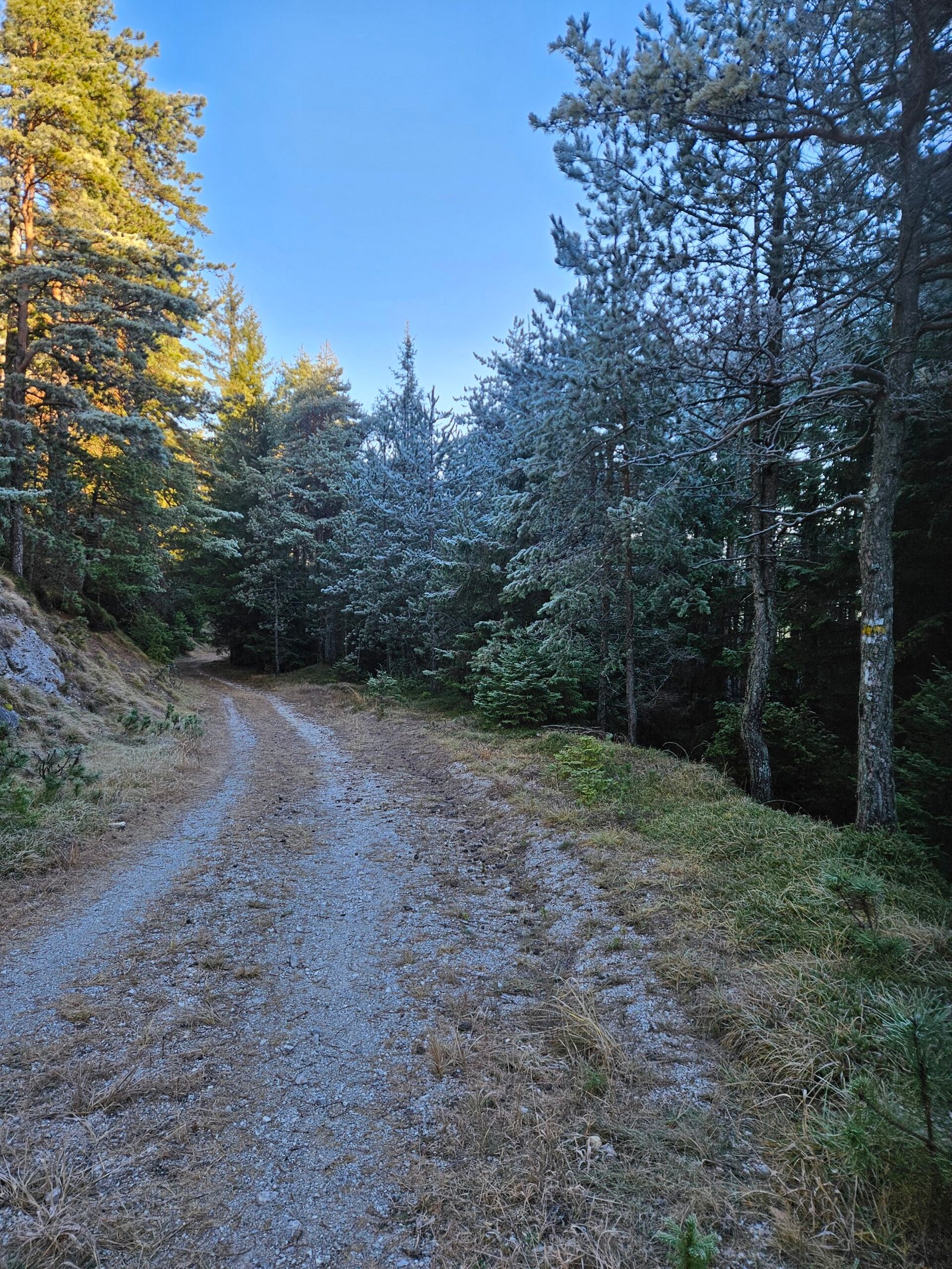 Auf dem nächsten, wettertechnisch wechselhaften Abschnitt treffen wir dabei auf herrliche Eisgebilde, die sich an die angetauten Verästelungen der Jungbäume klammern, während es von oben konstant Wassertropfen trommelt. Der schattige Geyersattel gibt sich dann gänzlich dem Frost hin, hier sinkt die Temperatur noch einmal spürbar, während wir uns an den Weiterweg durch den Geyergraben machen. Dazu folgen wir mittig der gelb markierten Forststraße nach Nordosten. Das durch die Bäume fallende Lichtspiel ist dabei ein wunderschönes, aber dennoch ein letztes Aufbäumen, bevor es endgültig zurück in die dichte Nebelsuppe geht.
