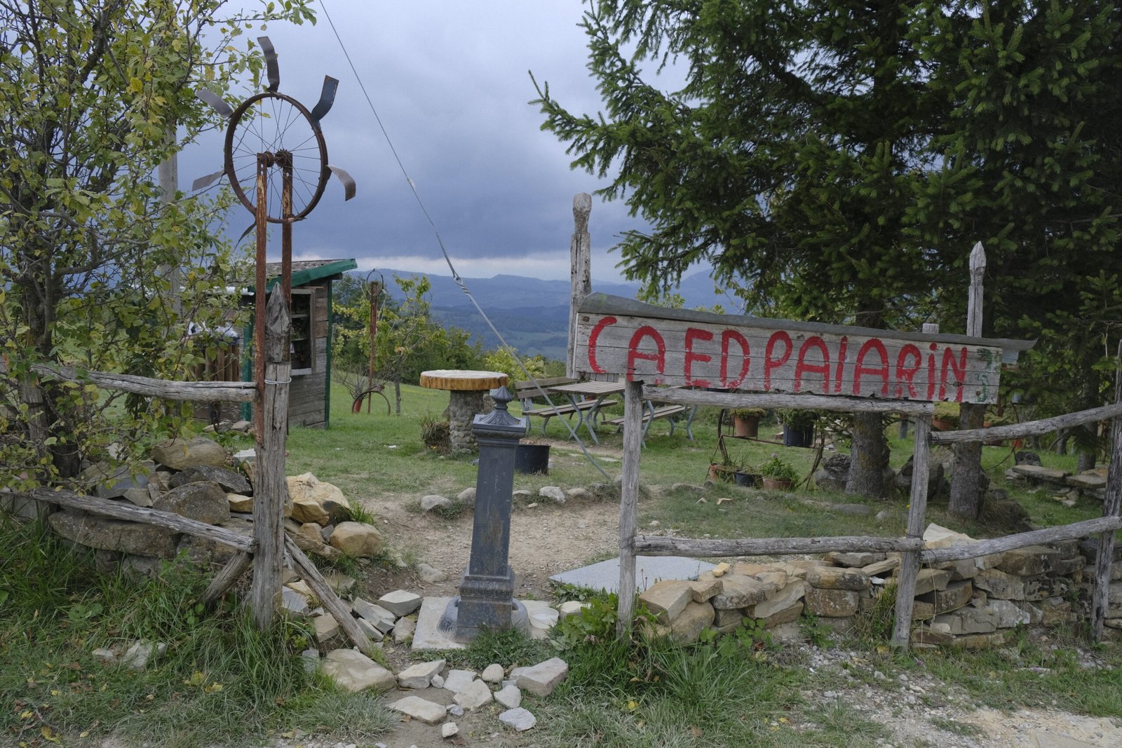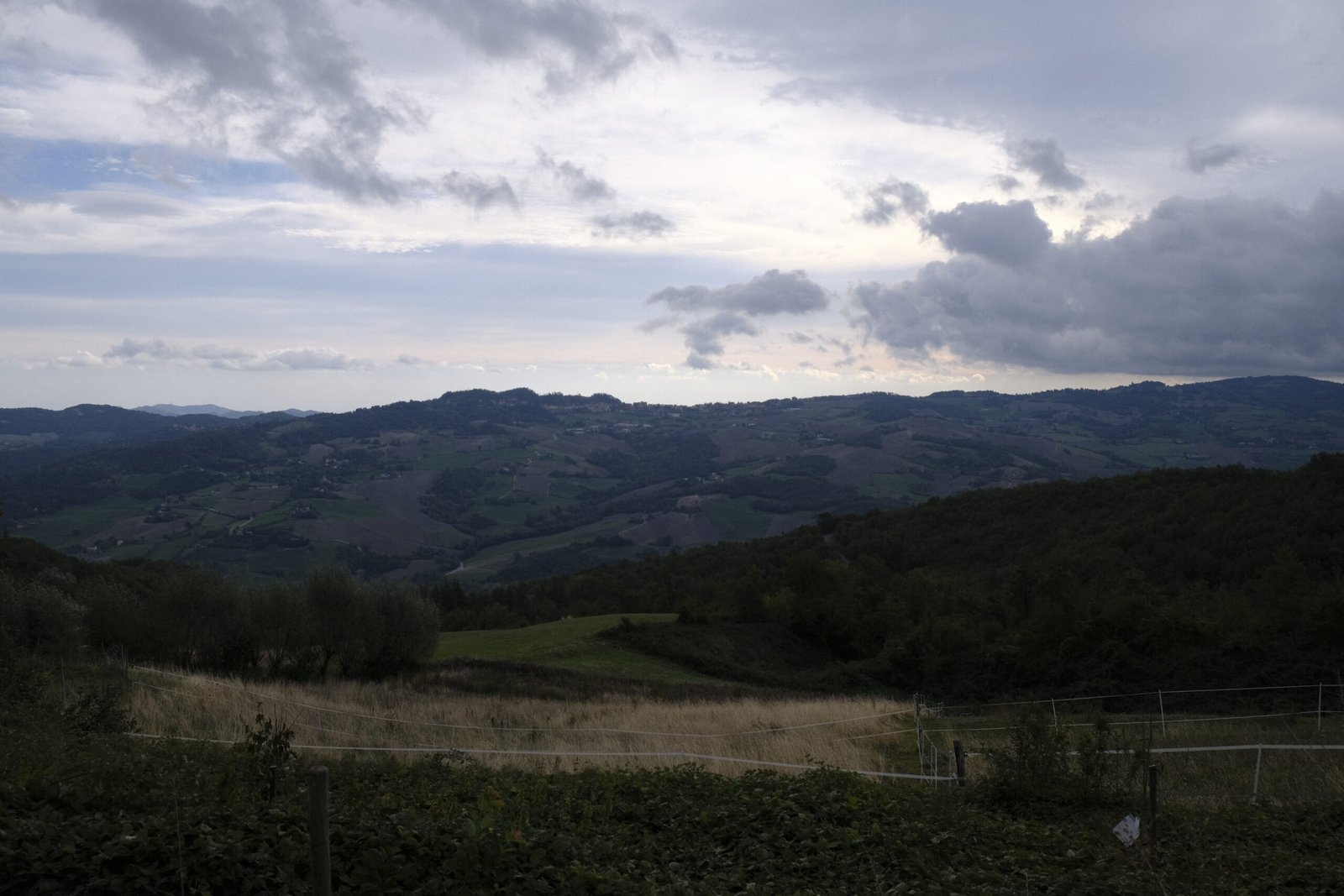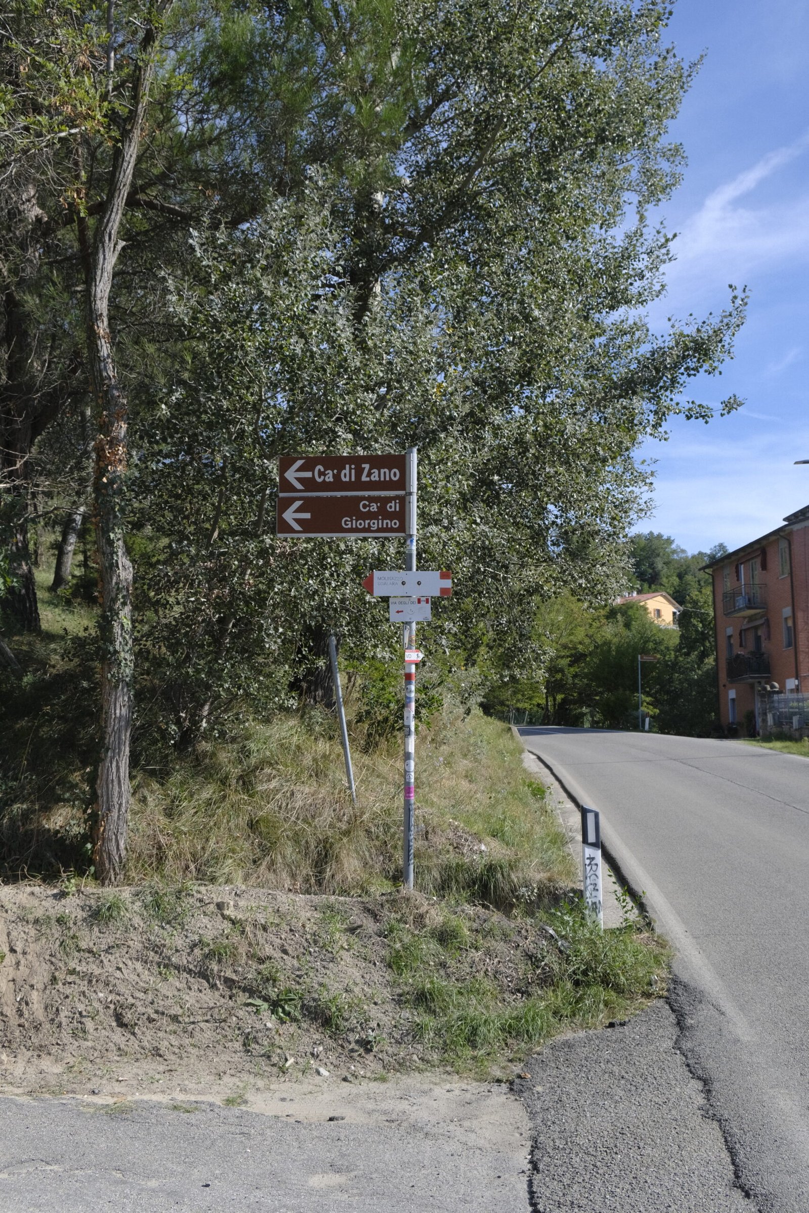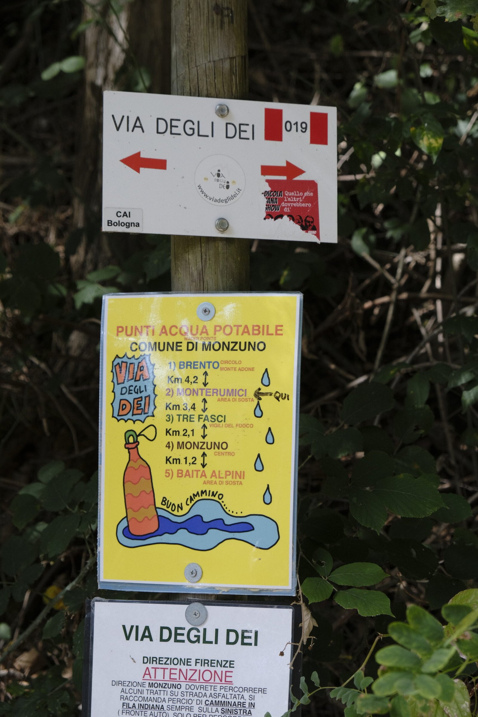 Der folgende Abschnitt gehört gleichzeitig landschaftlich zum Schönsten und wegmäßig zum absolut Schirchsten, das die Via degli Dei zu bieten hat. Auf den restlichen elf Kilometern nach Monzuno folgt der Weg entweder direkt dem Straßenverlauf, oder schlängelt sich in geringem Abstand an dieser entlang. Entlohnt wird man dafür mit einem netten Rückblick auf den Monte Adone, so wie weit streifende Aussichten in die umliegende Landschaft. Ein wahres Highlight sind auch die vielen selbst gebastelten Hinweisschilder, Picknick- und Wasserstellen, sowie selbst organisierte Mistkübel entlang des Weges. Im sonst oft gegenüber fremden sehr verschlossenen wirkenden Häusern und Grundstücken (ich sage nur attenti al cane und proprietà privata) ist diese Form der anonymen Gastfreundschaft absoluter Balsam für die Seele. Vorerst sind die Routenbauer auch noch bemüht die Asphaltpiste bei jeder Gelegenheit zu verlassen. Was folgt sind ein paar abenteuerliche Single-Trails durchs Gemüse, ohne jedoch je die nahe Straße aus den Augen (oder zumindest Ohren) zu verlieren.
