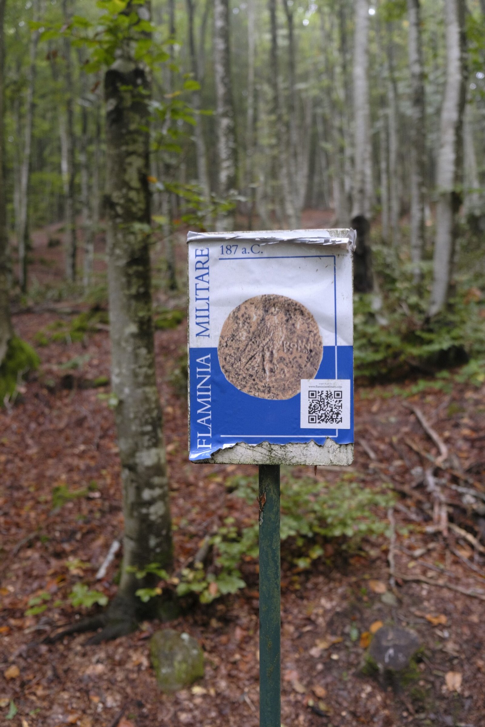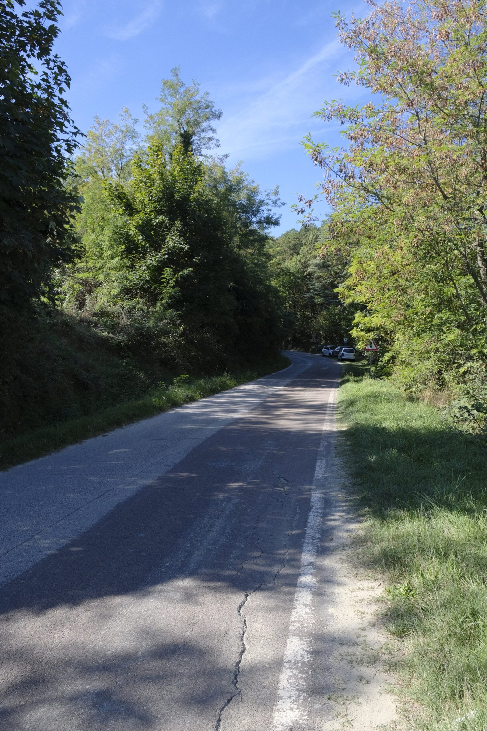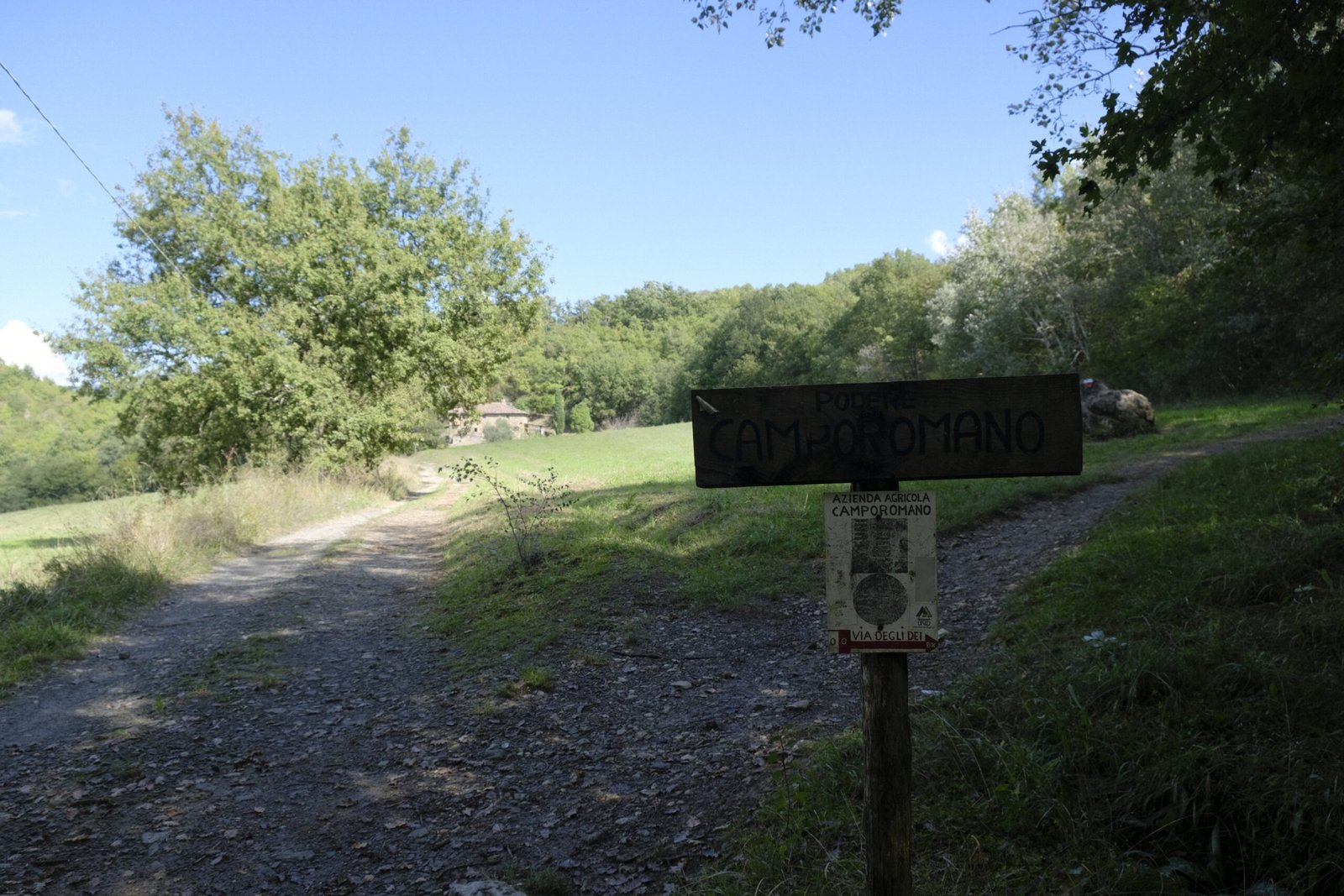 Historisch interessierten bietet sich hier auch zum ersten Mal richtig die Gelegenheit die römische Militärstraße Via Flamina in Augenschein zu nehmen, die hier erfolgreich ausgegraben wurde. Wir wandern weiter durch den Wald, bis wir auf eine weitläufige Weidefläche stoßen. Bei einem kleinen Bauernhof mit einem alten verlassenen Piaggio Ape verlassen wir den Weitwanderweg und steigen dann zuerst über steile Feldwege, später über ebenso steile Asphaltpisten hinunter ins 130-Seelen-Dorf Bruscoli, unser Tagesziel. Auf diesem Abschnitt ist die Suche nach Unterkünften nicht ganz so leicht, weshalb es oft erforderlich ist, ein Stück weit vom Weg abzugehen. Viele Unterkünfte bieten aber auch die Möglichkeit eines Transportes von der oder zurück zur Via degli Dei. Diese Angebote sollte man nicht scheuen, denn ein Mehrweg von mehreren Kilometern und einigen hundert Höhenmetern zusätzlich kann auch schnell zur unnötigen Belastung ausarten. In Bruscoli gibt es ein kleines Restaurant und ein paar versprengte Unterkünfte. Ohne Bedenken empfehlen können wir das winzige Zwei-Zimmer-B&B Giu&Dany mitten im Ortskern gegenüber der Kirche.