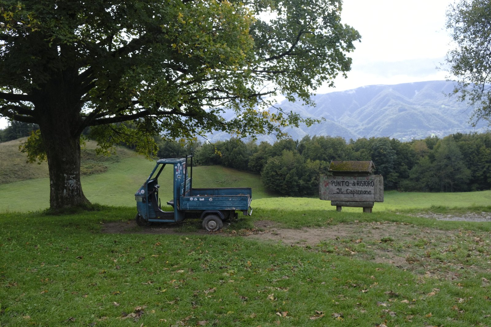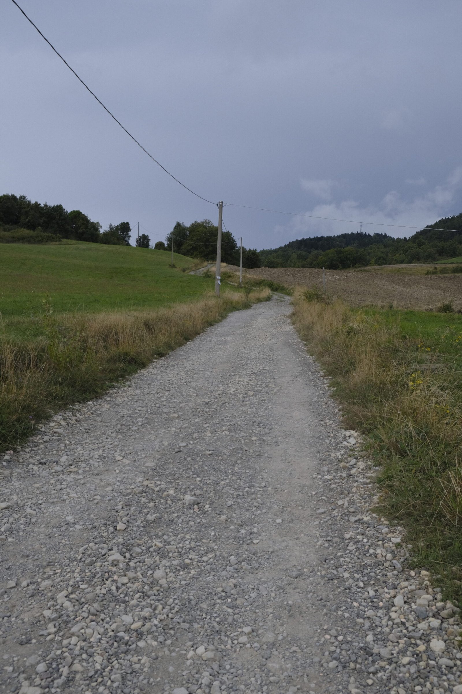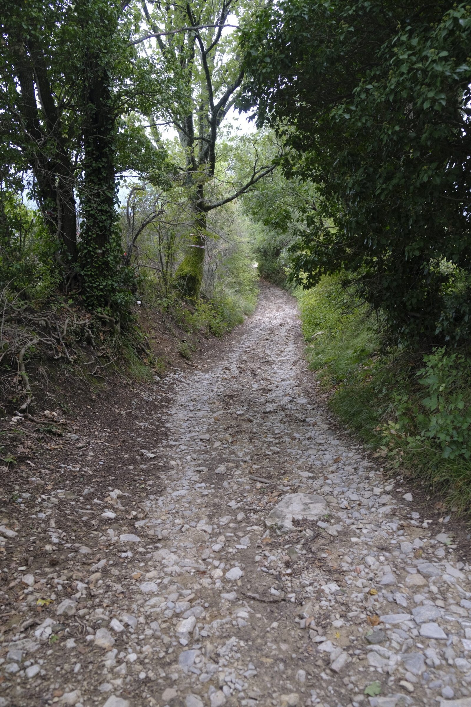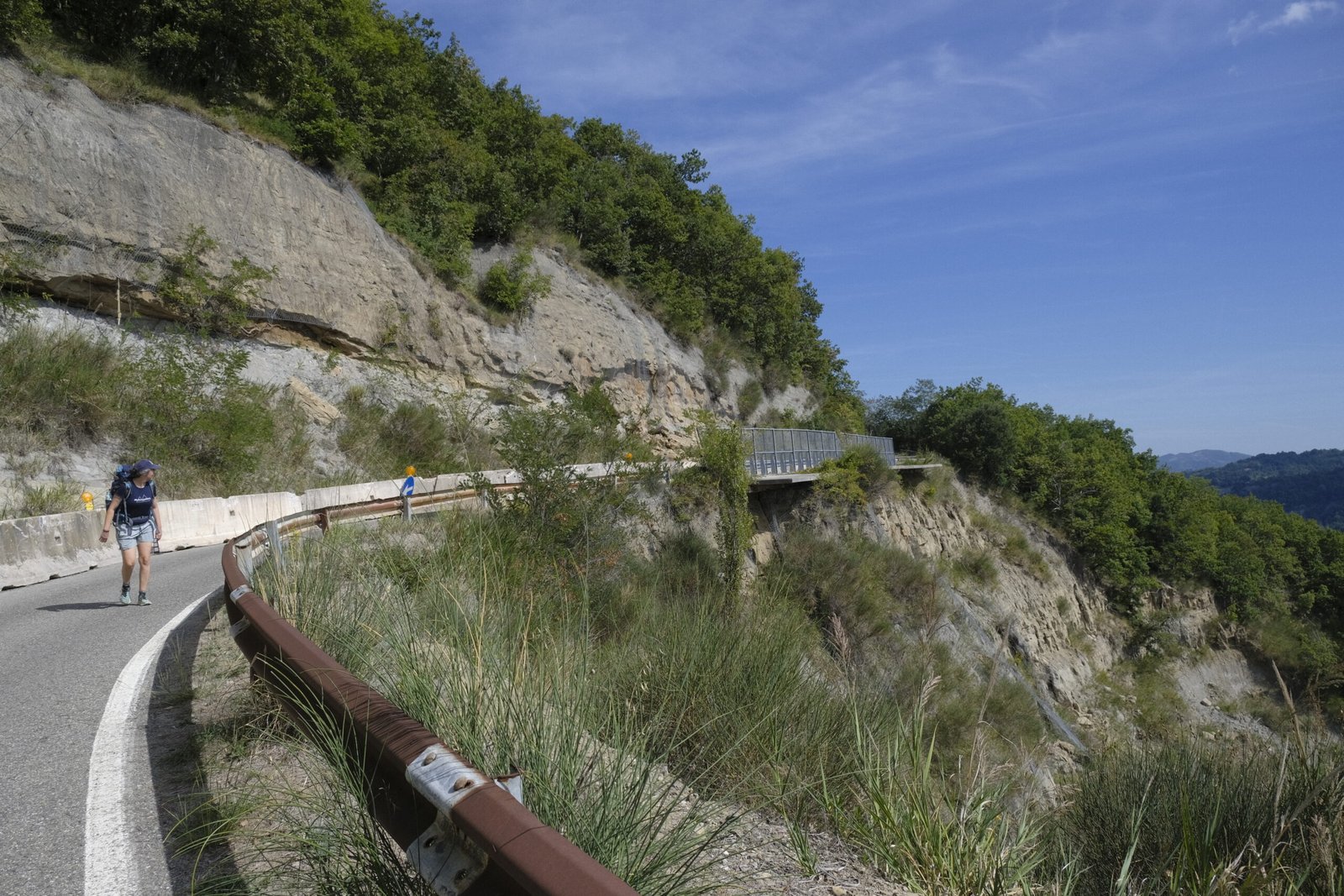 Historisch interessierten bietet sich hier auch zum ersten Mal richtig die Gelegenheit die römische Militärstraße Via Flamina in Augenschein zu nehmen, die hier erfolgreich ausgegraben wurde. Wir wandern weiter durch den Wald, bis wir auf eine weitläufige Weidefläche stoßen. Bei einem kleinen Bauernhof mit einem alten verlassenen Piaggio Ape verlassen wir den Weitwanderweg und steigen dann zuerst über steile Feldwege, später über ebenso steile Asphaltpisten hinunter ins 130-Seelen-Dorf Bruscoli, unser Tagesziel. Auf diesem Abschnitt ist die Suche nach Unterkünften nicht ganz so leicht, weshalb es oft erforderlich ist, ein Stück weit vom Weg abzugehen. Viele Unterkünfte bieten aber auch die Möglichkeit eines Transportes von der oder zurück zur Via degli Dei. Diese Angebote sollte man nicht scheuen, denn ein Mehrweg von mehreren Kilometern und einigen hundert Höhenmetern zusätzlich kann auch schnell zur unnötigen Belastung ausarten. In Bruscoli gibt es ein kleines Restaurant und ein paar versprengte Unterkünfte. Ohne Bedenken empfehlen können wir das winzige Zwei-Zimmer-B&B Giu&Dany mitten im Ortskern gegenüber der Kirche.