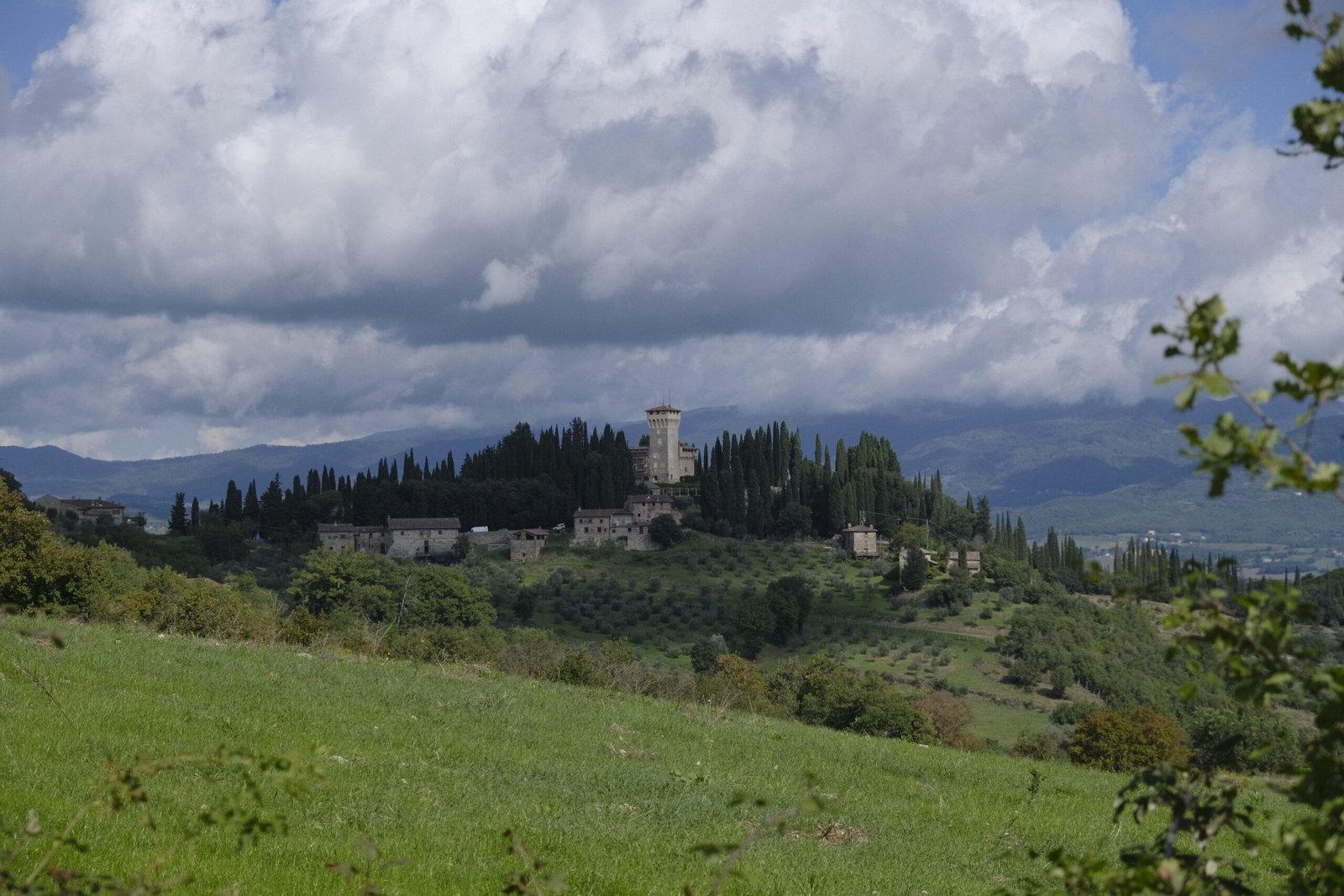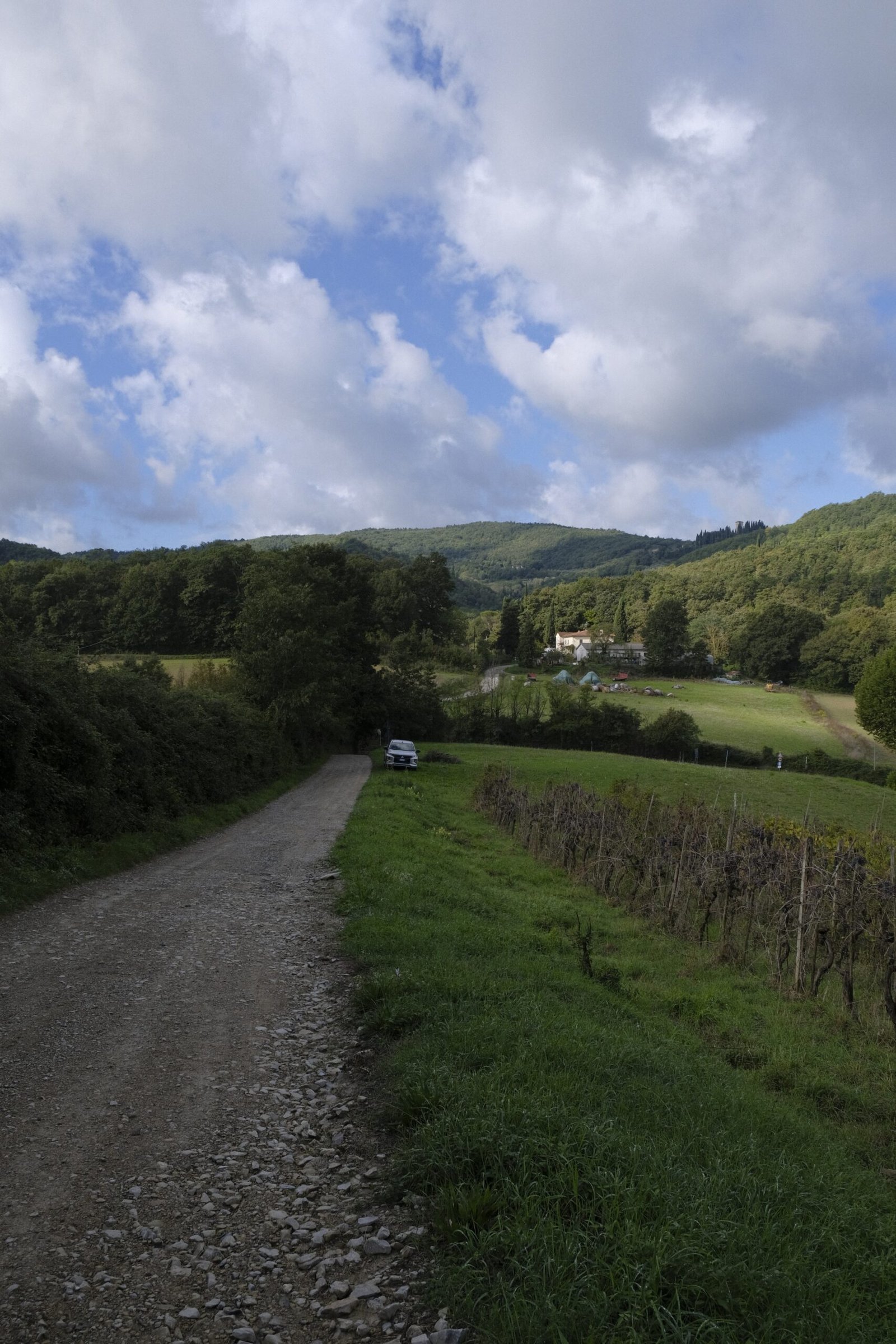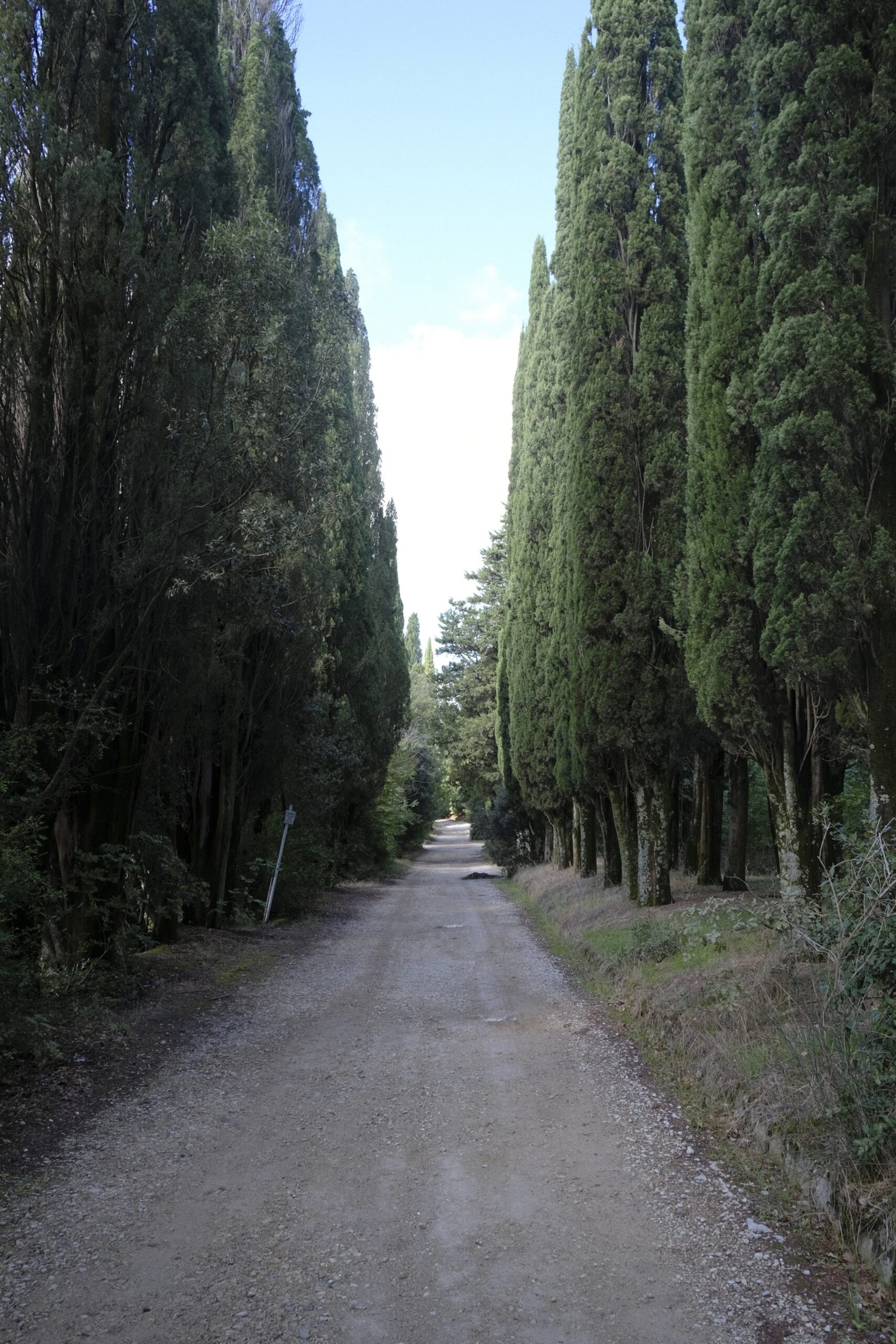 Wir verlassen das Ortszentrum von San Piero sicher nicht so frisch, wie wir schon einmal gewesen sind. Der Vortag steckt uns nicht nur im übertragenen Sinne noch in den Beinen. Wir passieren die Fortezza Meicea, die wir leider nur von der Weite betrachten können, wandern entlang eines etwas weniger historisch bedeutsamen Campingplatz entlang und erreichen dann die Schnellstraße SS65. Auf der anderen Seite geht es dann über eine baumgesäumte Allee durchaus steil hinauf zur Villa del Trebbio.
