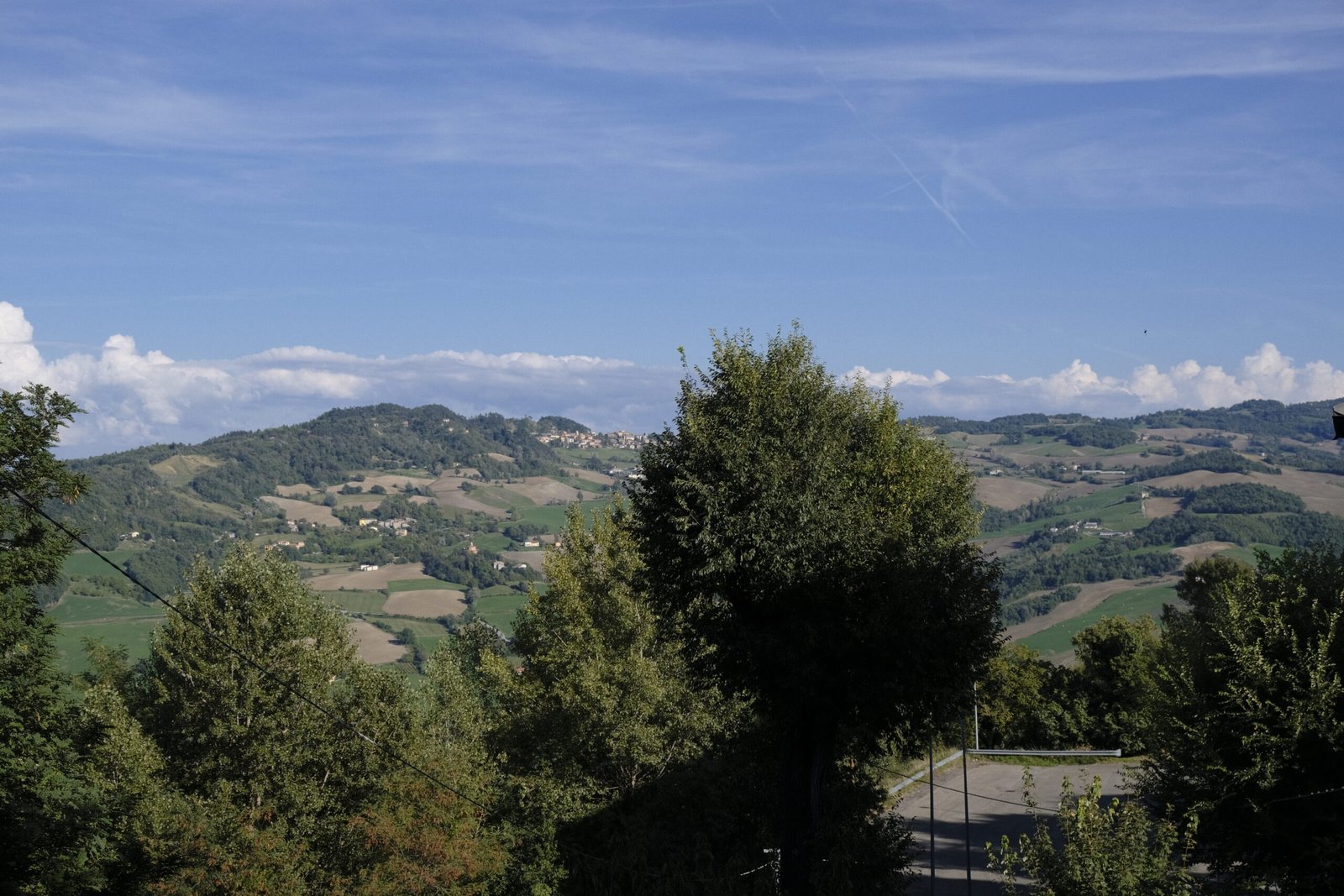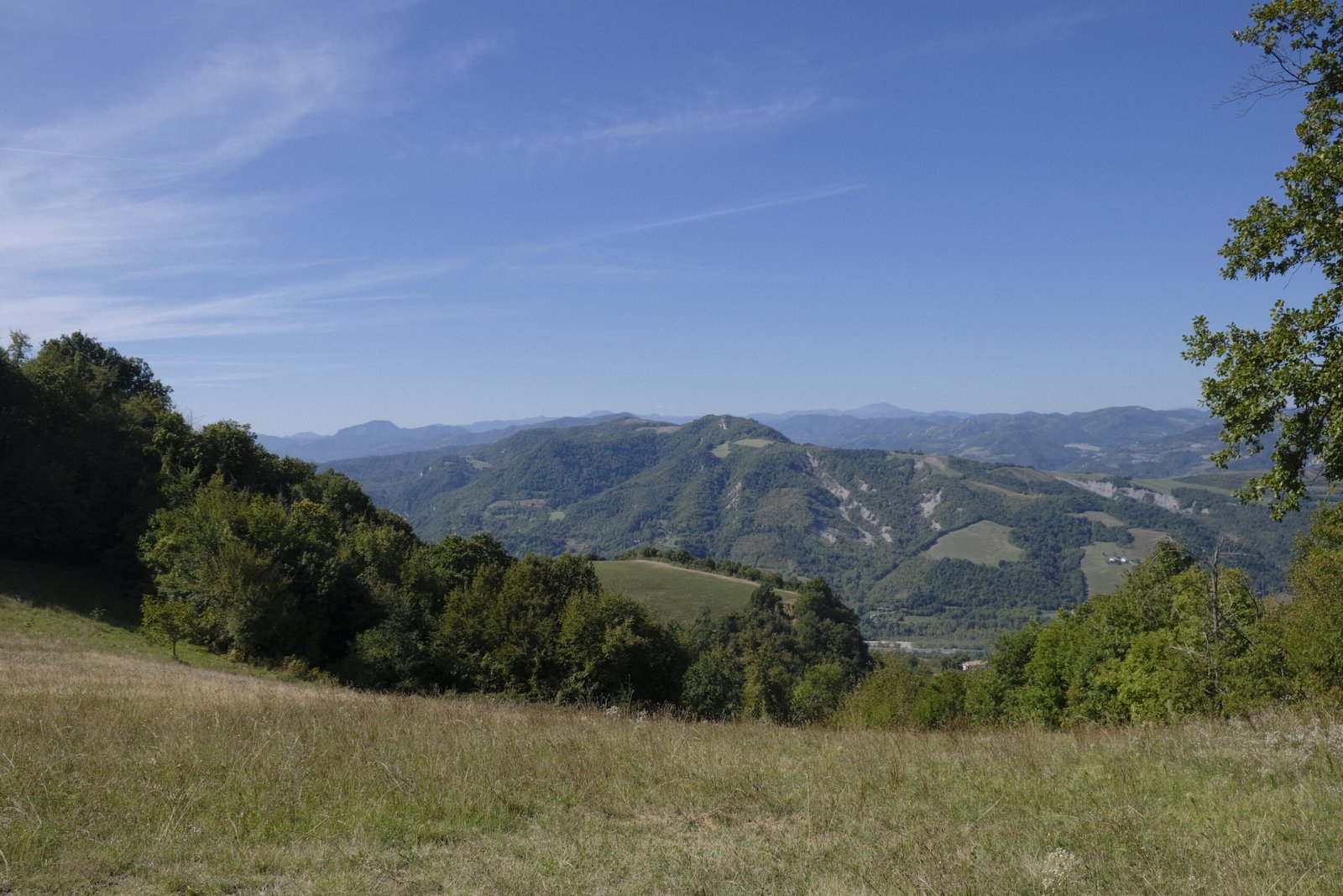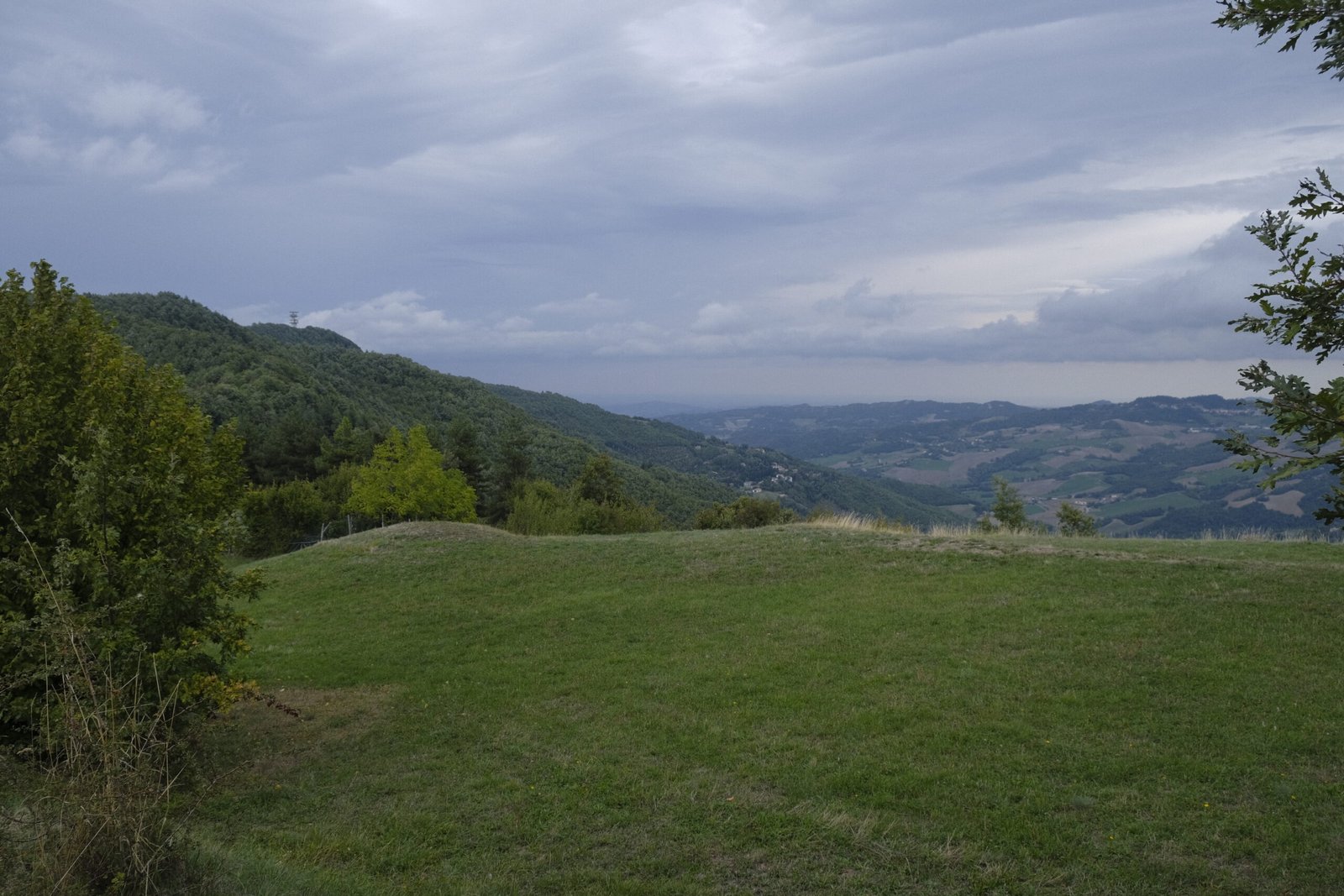 Heute wollen wir es bis in das beschauliche Dörfchen Monzuno schaffen. Die 23 Kilometer klingen zwar nicht allzu dramatisch, die vielen Höhenmeter sollte man aber dennoch nicht ganz unterschätzen. Die zweite Tagesetappe beginnt mit einem wenig schmeichelhaften Stadtspaziergang durch das industriell geprägte Sasso Marconi. Wir passieren das weitläufige Sportgelände, sowie den Lokalbahnhof und überqueren dann auf der Ostausfahrt den Reno. Ein kurzes Stück nach links über die viel befahrene Straße, dann geht es auf der gegenüberliegenden Seite in den Wald hinein. Der schmale und steile Wanderweg hinauf zum Sattel La Piazza ist besonders im unteren Teil ordentlich ausgewaschen und nicht gerade eine Freude zu gehen, weiter oben ist der Pfad dann aber wieder gut befestigt und an den entscheidenden Stellen sogar mit einem Geländer versehen. Oben angekommen begrüßen uns wieder sanfte Wiesenflächen und ein herrlich-romantischer Rückblick auf Bologna.