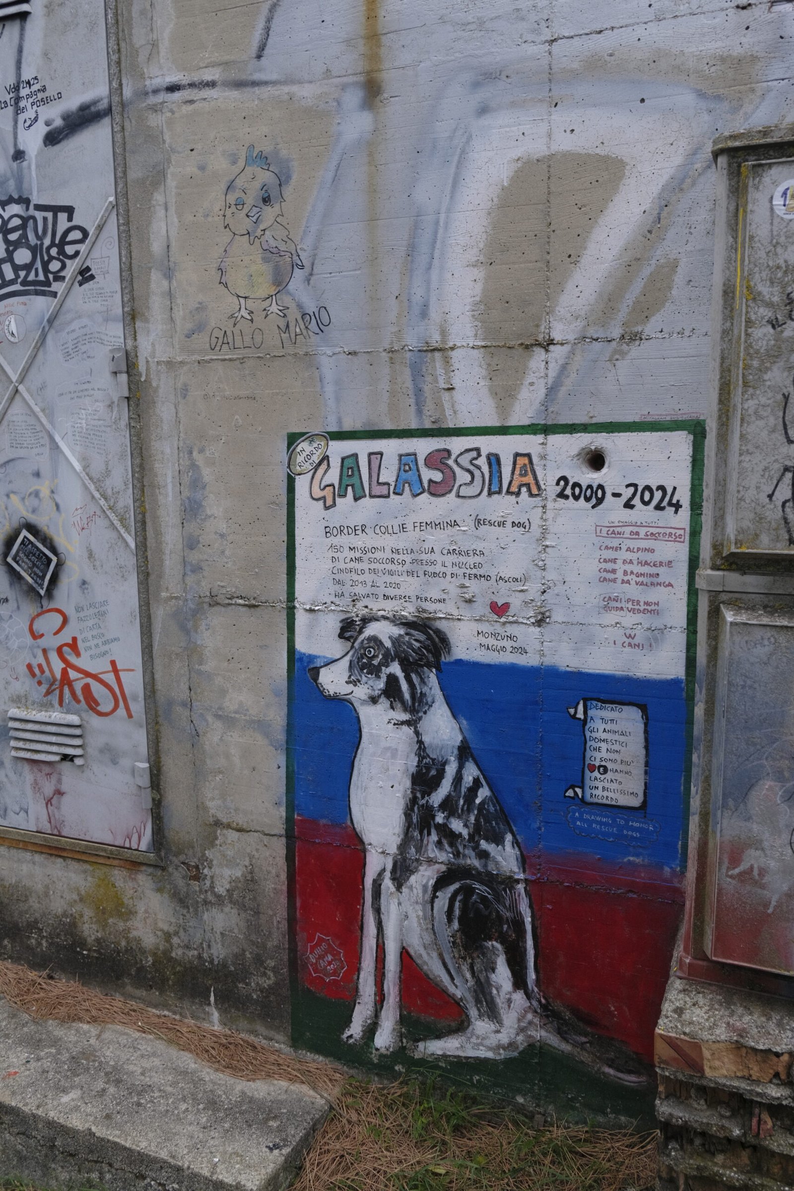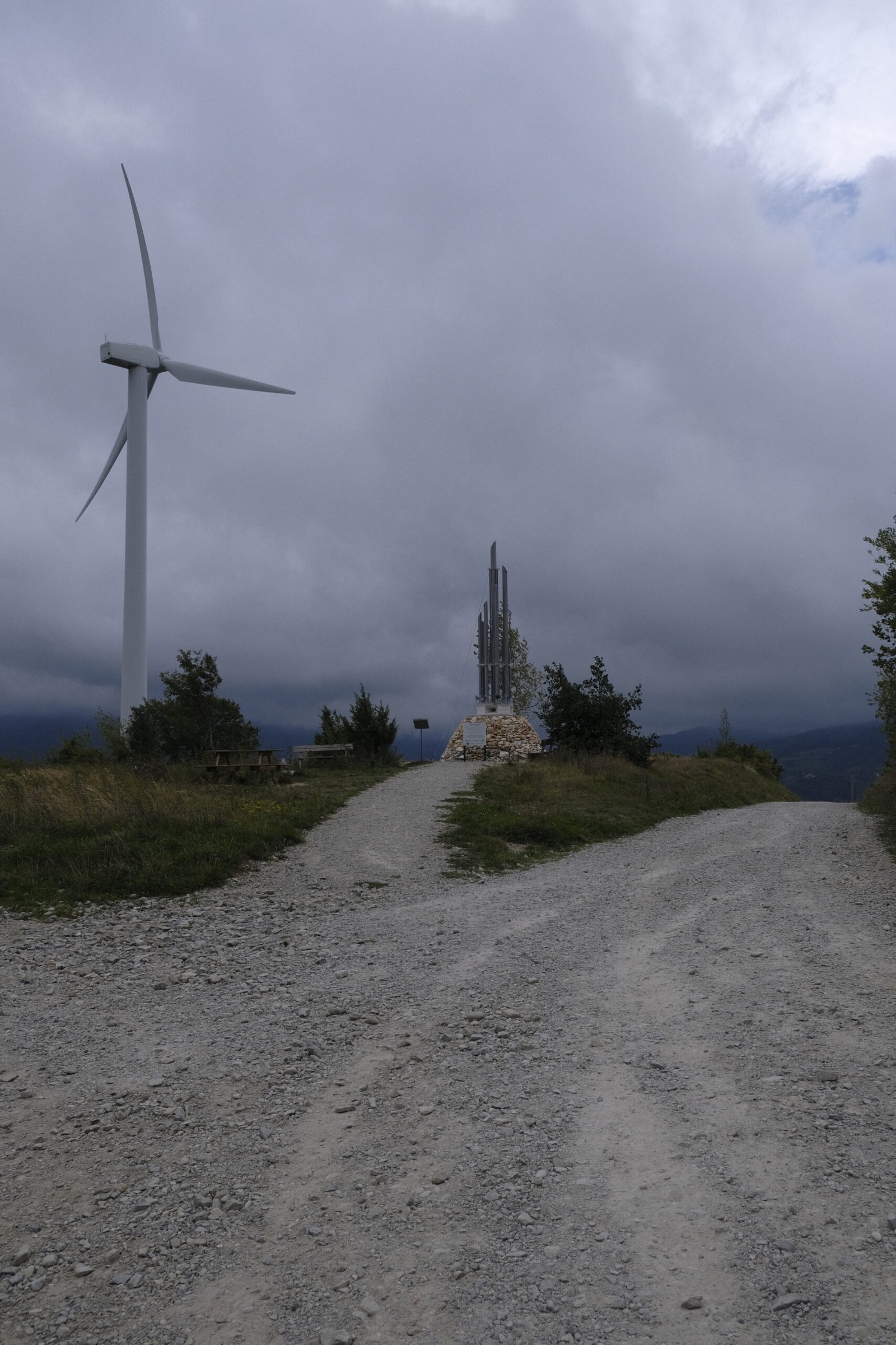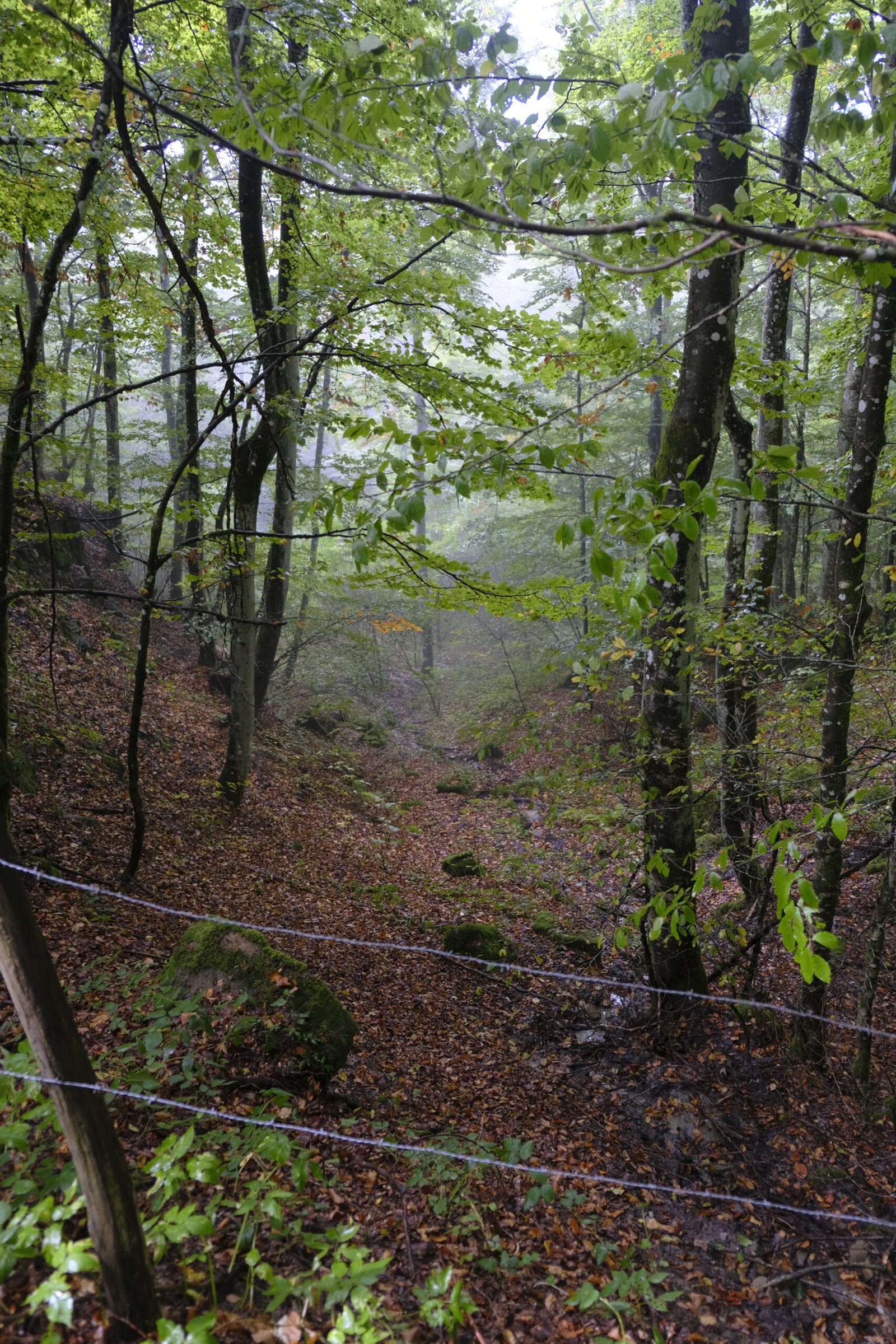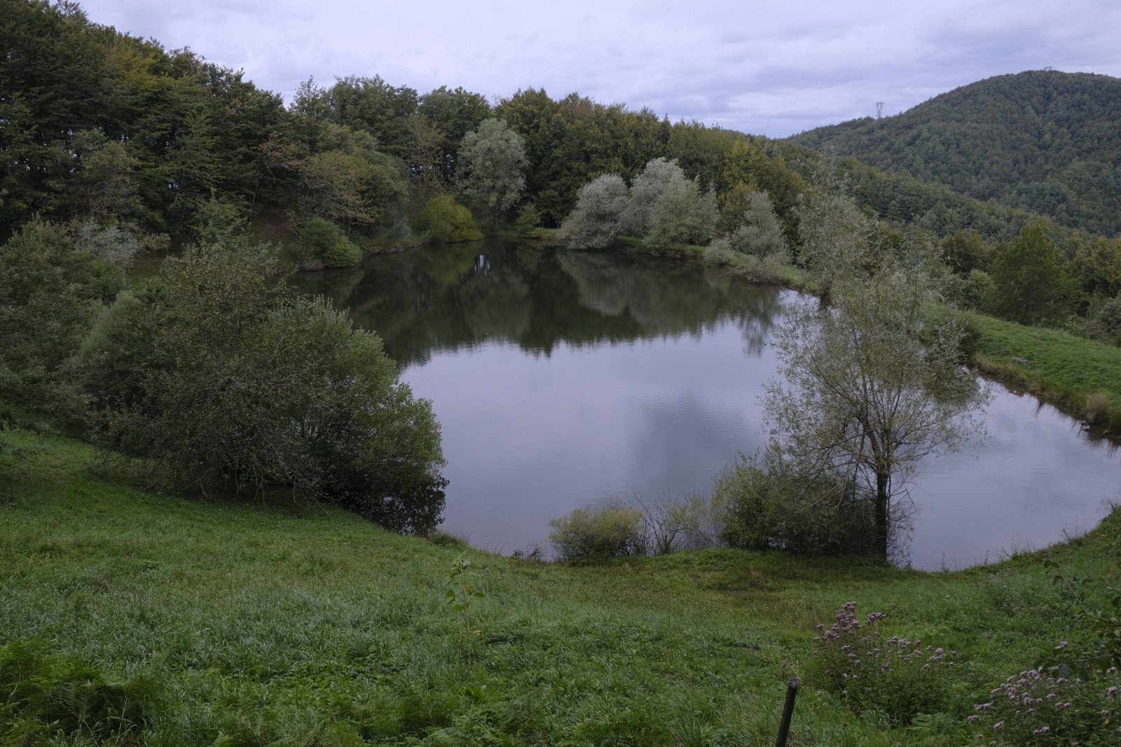 Wir stapfen also (oder gottseidank nur) das letzte Stück hoch zur Passhöhe. Immer öfter wird hier auch die militärische Bedeutung des Höhenzugs deutlich, immerhin verlief hier im zweiten Weltkrieg auch ein Teil der Gotenstellung und damit eine wichtiger Abschnitt der deutschen Verteidigungslinie im zweiten Weltkrieg. Davon zeugen nicht nur viele verfallene oder nicht mehr genutzte Gebäude, sondern auch sehr viele Zäune mit massenweise Stacheldraht. Es ist auch ein erster Vorbote was uns in wenigen Kilometern noch erwartet. Vorerst kann davon aber noch keine Rede sein. Wir umrunden den kleinen (und stacheldrahtumzäunten) Lago del Passeggere um dann etwas gemächlicher zur bewaldeten Kuppe La Banditacce hochzusteigen. Normalerweise würde man dieser unscheinbaren Erhebung im Nirgendwo kaum Beachtung schenken. Hier kündigt aber eine mit allerhand Stickern beklebte Glocke davon, dass an diesem Ort etwas besonders sein muss. Und in der Tat handelt es sich bei der auf 1204 Meter über Seehöhe gelegenen Anhöhe um den höchsten Punkt des gesamten Trekks. Außerdem liegt die Glocke ziemlich in der Mitte der Via degli Dei. Ein guter Grund also die zweite Halbzeit gebührend einzuläuten.