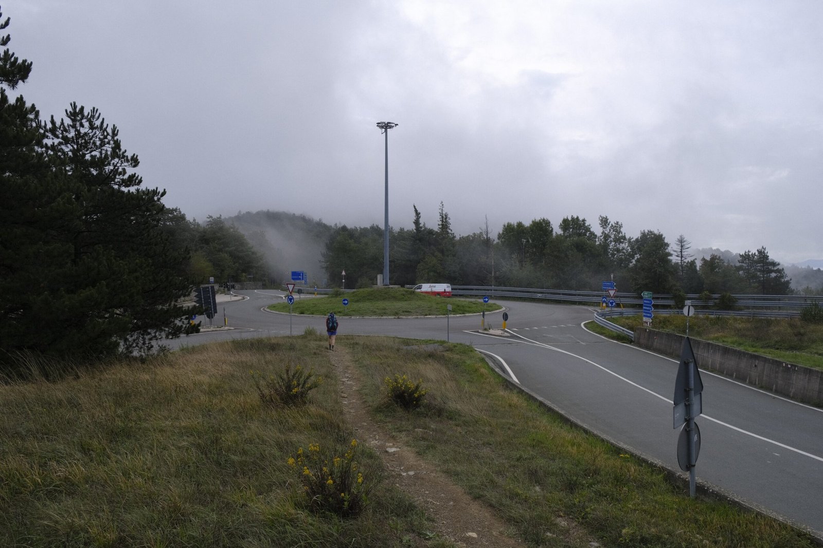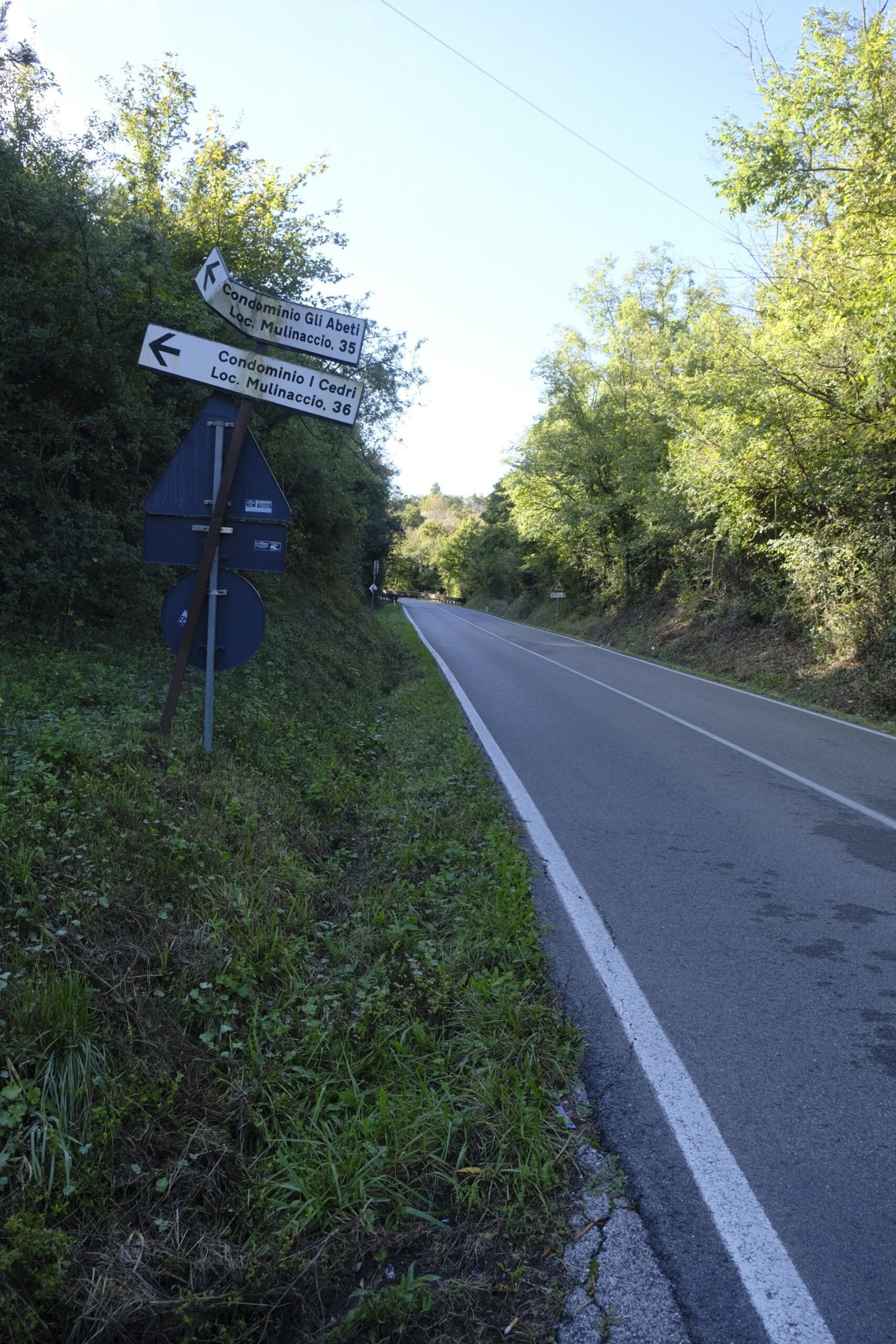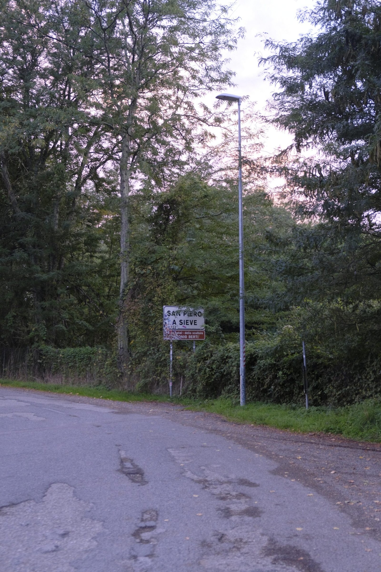 Die Anhöhe mitsamt Rastplatz steht wortwörtlich am Scheideweg, fortan geht es fast nur noch bergab, die restlichen siebzehn (!) Kilometer haben es, allein schon durch die einschüchternde Distanz, noch ordentlich in sich. Wir wandern weiter den Höhenzug entlang, vorbei an Monte Alto (stolze 960 Meter hoch) und Monte Linari, bis wir zu einer eigentlich recht unscheinbaren Abzweigung gelangen. Hier muss man aber genau aufpassen, denn während sämtliche Tourenbeschreibungen und Karten hier weiter geradeaus nach Süden führen, zweigt die neue Routenführung hier auf direktem Weg nach Sant’Agata ab. Wirklich kommuniziert wird diese Entscheidung abermals nicht wirklich und wir wissen auch sonst nichts von einer etwaigen Wegumleitung, weshalb wir munter geradeaus weitermarschieren. Nach kurzer Zeit folgt eine weitere Kreuzung, bei der nunmehr nur mehr der Weg nach Galliano markiert ist. Ein Umweg von locker fünf, sechs Kilometer. Für uns absolut keine Alternative, also stapfen wir weiter auf dem offensichtlich mit viel Leidenschaft ent-markierten Via degli Dei. Man hat sich sogar die Mühe gemacht die rot-weißen Markierungen von den Bäumen zu hobeln. Nach einem recht unangenehmen Abstieg über eine steile Schotterstraße heißt es dann endgültig Land-Ende. Vor dem Hof einer Frau mittelfortgeschrittenen Alters, die zufällig gerade mit zwei Carabinieri vor ihrem Anwesen steht, ist die Straße provisorisch, aber nachdrücklich gesperrt und als Privatgrundstück beschildert. Entweder hatte die Dame ein paar schlechte Erfahrungen mit wanderndem Fußvolk, oder sie ist einfach nur zwider. Gnädigerweise hat man allerdings einen improvisierten Abschneider hinüber nach Sant’Agata angelegt. Das winzige Dorf lag ursprünglich etwas abseits des Weitwanderwegs, zieht nun aber viele erschöpfte Geister an, die sich in der einzigen Bar im Ort erholen und sich am absolut grandiosen Kellner erfreuen, sowie der für Italien fast schon unerhört guten und internationalen Musikauswahl.
