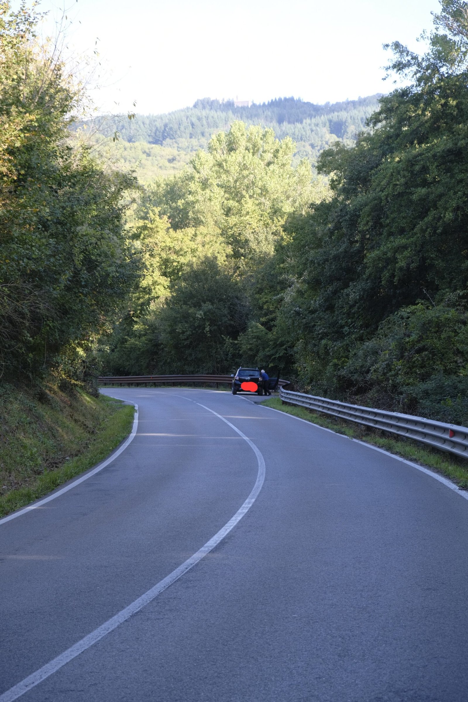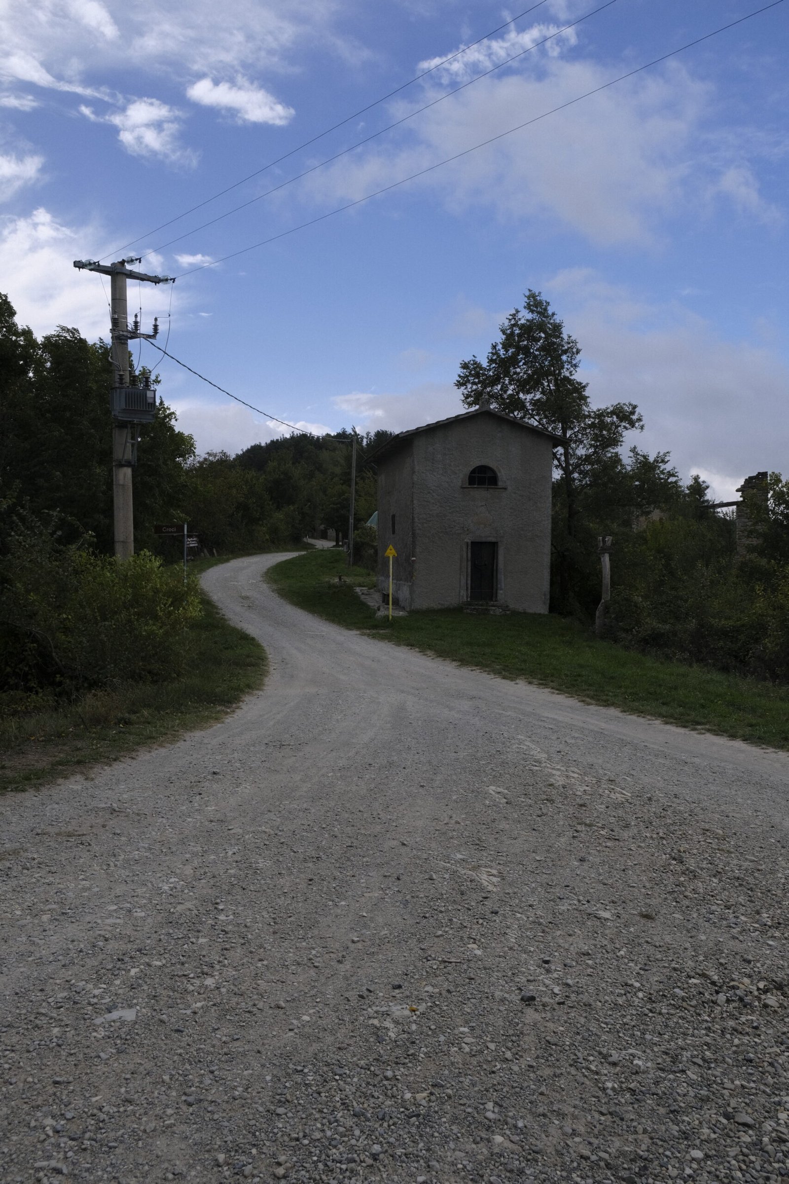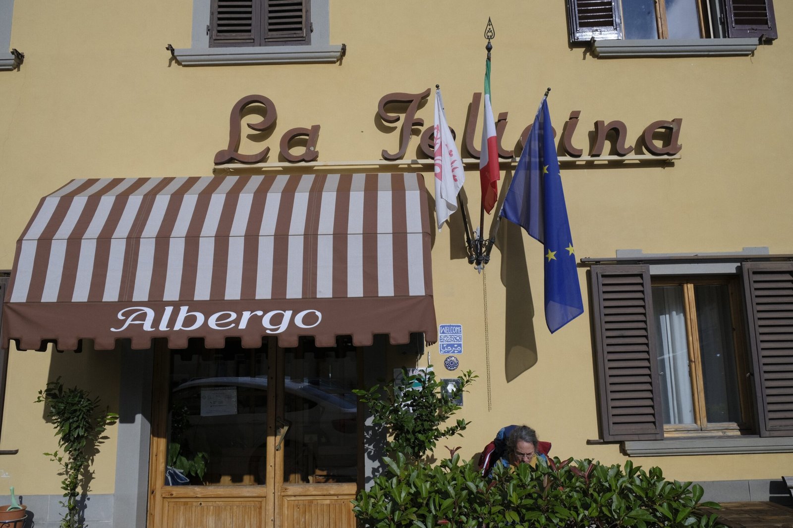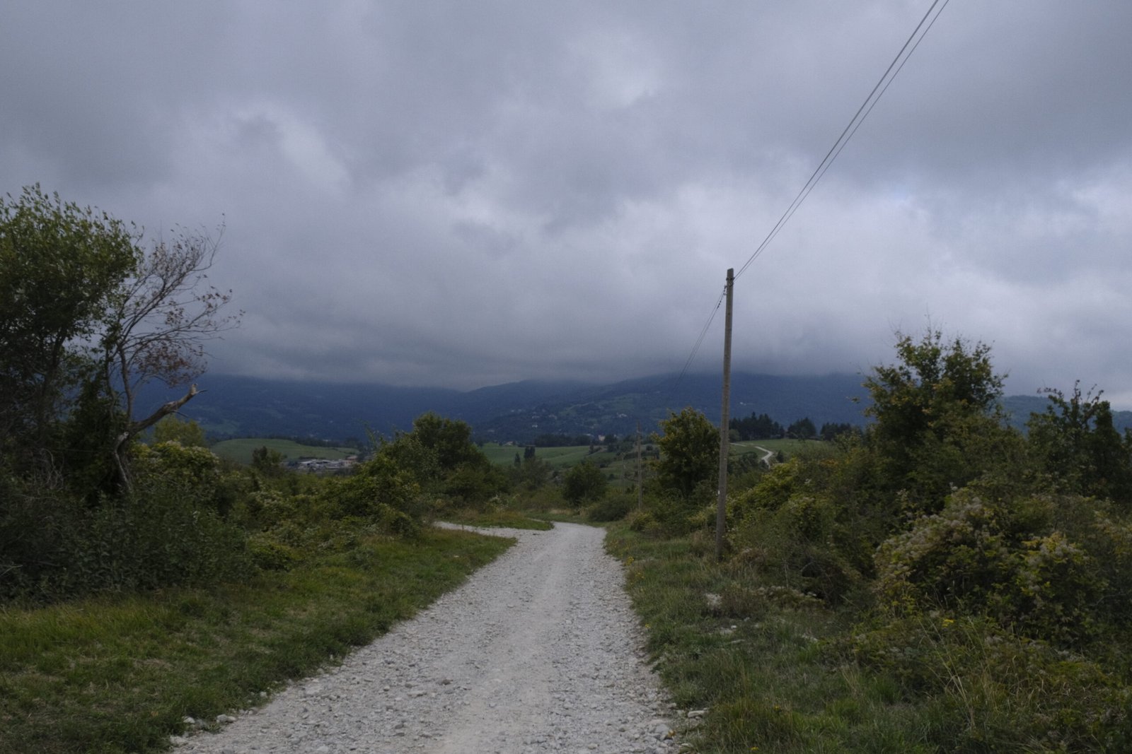 Die Anhöhe mitsamt Rastplatz steht wortwörtlich am Scheideweg, fortan geht es fast nur noch bergab, die restlichen siebzehn (!) Kilometer haben es, allein schon durch die einschüchternde Distanz, noch ordentlich in sich. Wir wandern weiter den Höhenzug entlang, vorbei an Monte Alto (stolze 960 Meter hoch) und Monte Linari, bis wir zu einer eigentlich recht unscheinbaren Abzweigung gelangen. Hier muss man aber genau aufpassen, denn während sämtliche Tourenbeschreibungen und Karten hier weiter geradeaus nach Süden führen, zweigt die neue Routenführung hier auf direktem Weg nach Sant’Agata ab. Wirklich kommuniziert wird diese Entscheidung abermals nicht wirklich und wir wissen auch sonst nichts von einer etwaigen Wegumleitung, weshalb wir munter geradeaus weitermarschieren. Nach kurzer Zeit folgt eine weitere Kreuzung, bei der nunmehr nur mehr der Weg nach Galliano markiert ist. Ein Umweg von locker fünf, sechs Kilometer. Für uns absolut keine Alternative, also stapfen wir weiter auf dem offensichtlich mit viel Leidenschaft ent-markierten Via degli Dei. Man hat sich sogar die Mühe gemacht die rot-weißen Markierungen von den Bäumen zu hobeln. Nach einem recht unangenehmen Abstieg über eine steile Schotterstraße heißt es dann endgültig Land-Ende. Vor dem Hof einer Frau mittelfortgeschrittenen Alters, die zufällig gerade mit zwei Carabinieri vor ihrem Anwesen steht, ist die Straße provisorisch, aber nachdrücklich gesperrt und als Privatgrundstück beschildert. Entweder hatte die Dame ein paar schlechte Erfahrungen mit wanderndem Fußvolk, oder sie ist einfach nur zwider. Gnädigerweise hat man allerdings einen improvisierten Abschneider hinüber nach Sant’Agata angelegt. Das winzige Dorf lag ursprünglich etwas abseits des Weitwanderwegs, zieht nun aber viele erschöpfte Geister an, die sich in der einzigen Bar im Ort erholen und sich am absolut grandiosen Kellner erfreuen, sowie der für Italien fast schon unerhört guten und internationalen Musikauswahl.