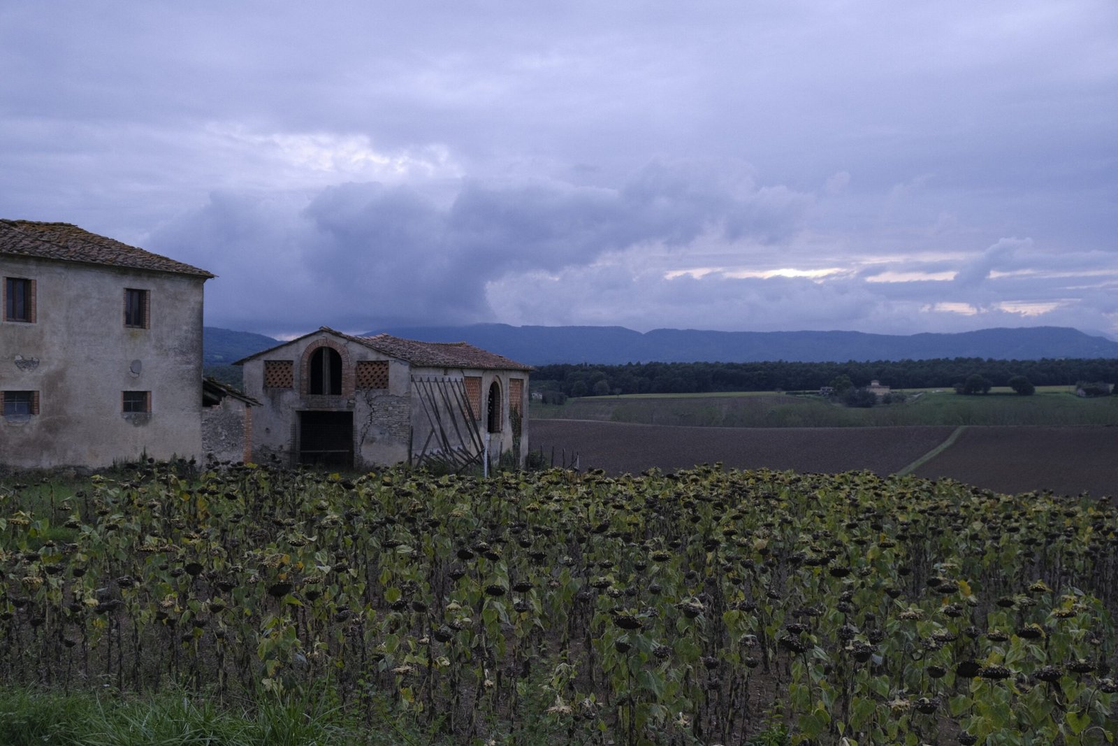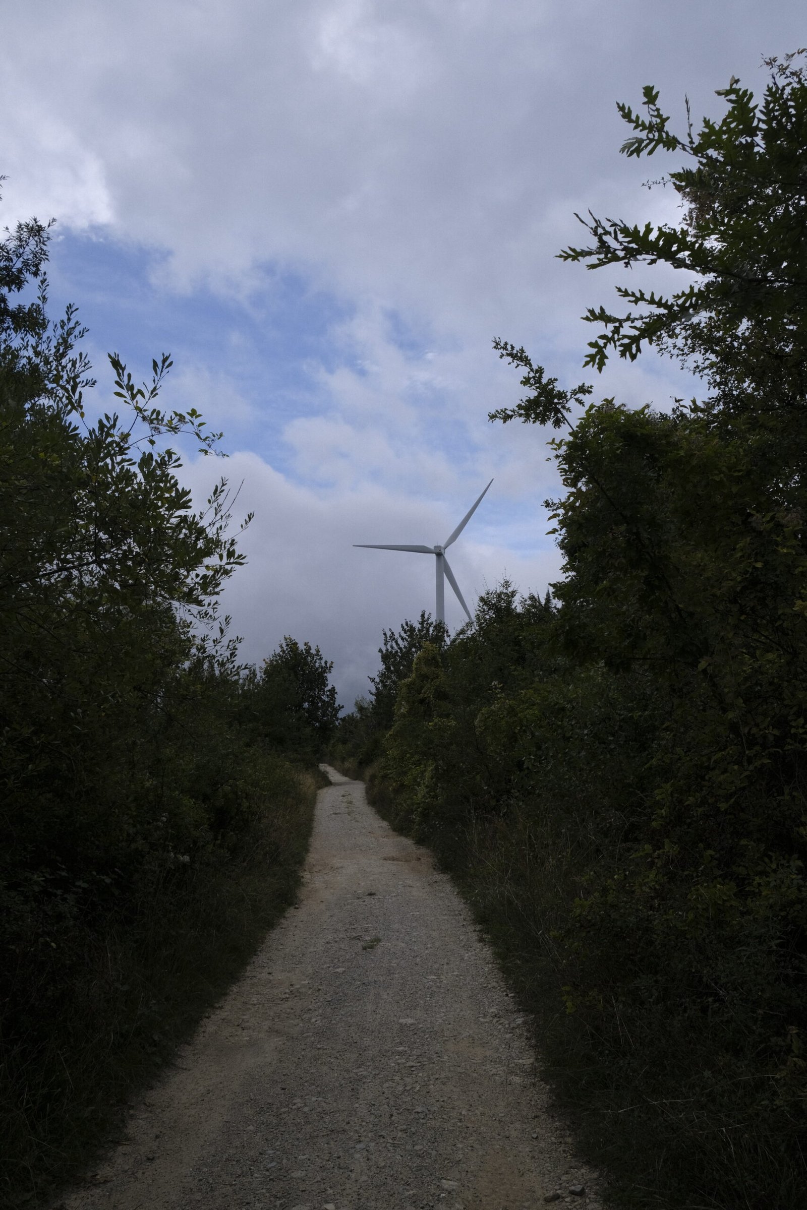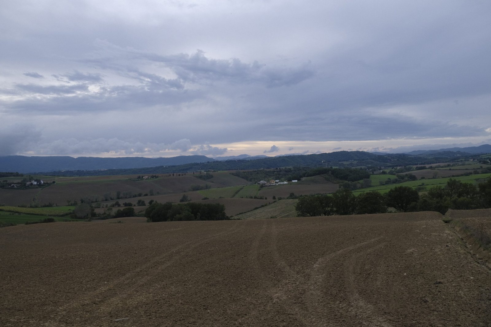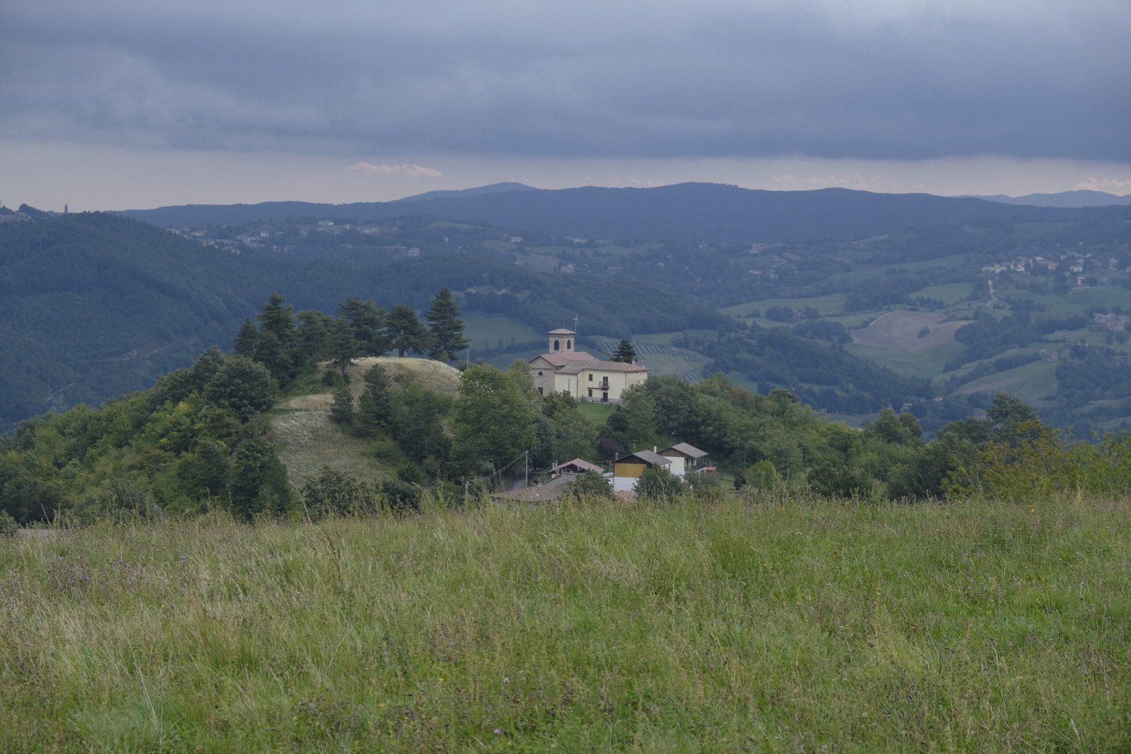 Wir verlassen die kleine Häuseransammlung nach Südwesten. Der Weg windet sich der Hügelkette entlang hinüber zum Monte del Galletto mit seinen aus dieser Perspektive fast schon bedrohlich wirkenden Windrädern. Dass diese bei der Lokalbevölkerung nicht immer auf Gegenliebe stoßen, ist hinlänglich bekannt. Dass sie allerdings an der absolut richtigen Stelle stehen, wird an diesem stürmischen Spätsommertag mehr als deutlich. Der folgende Abstieg bietet eigentlich alles, was das Herz sich von einer Mittelitalien-Reise wünscht. Weite Landschaften, saftige Hügel und verstreute Landgüter und der eine oder andere altertümliche Sakralbau.