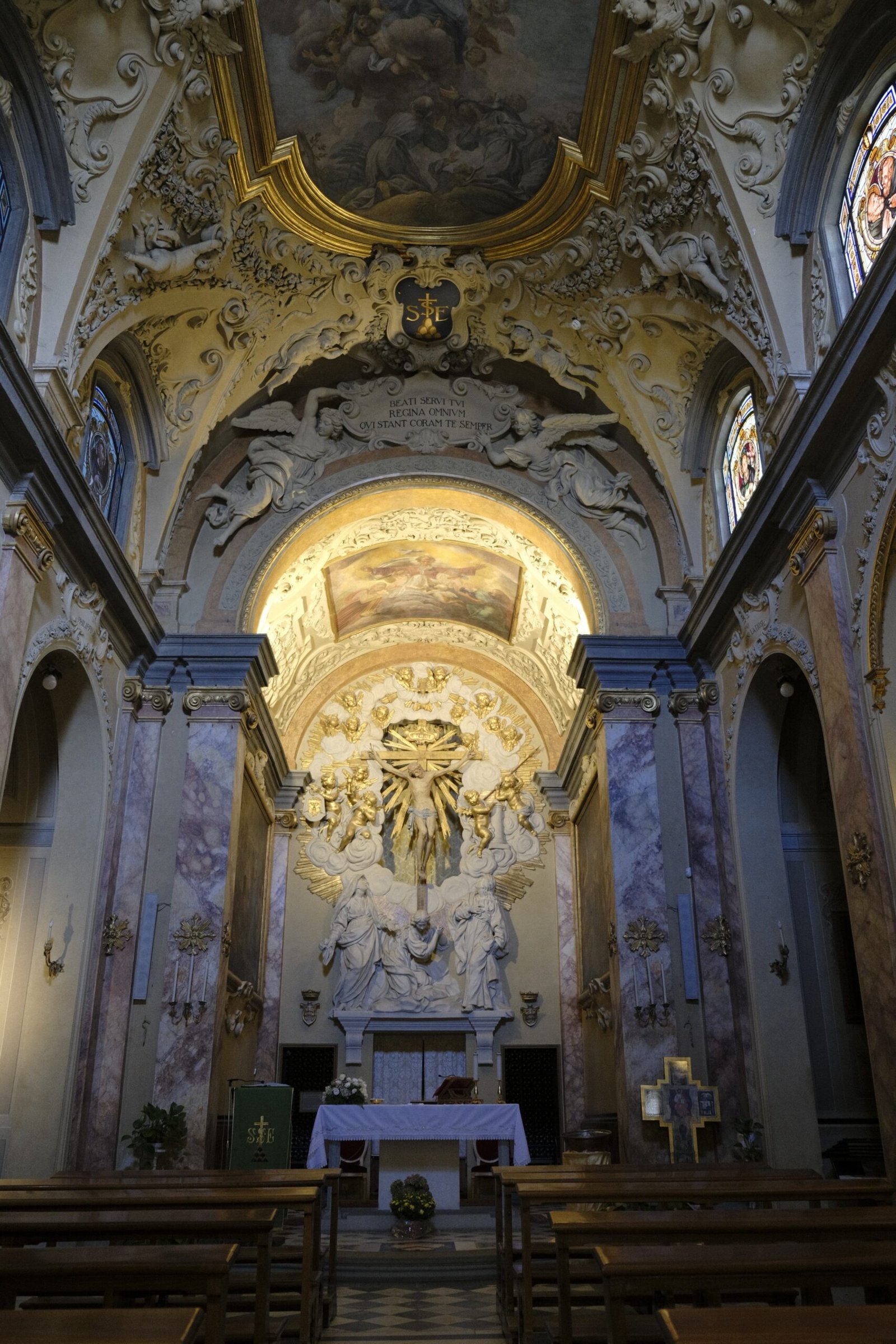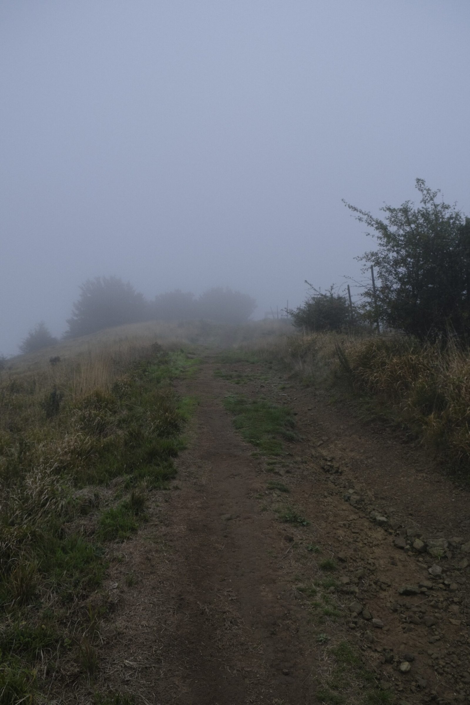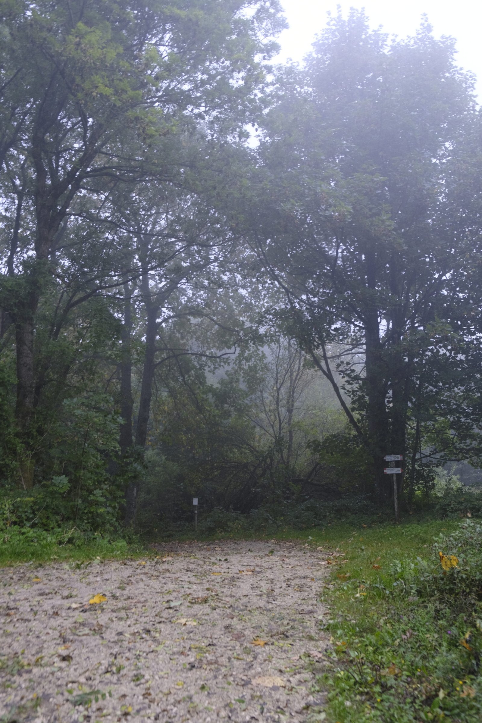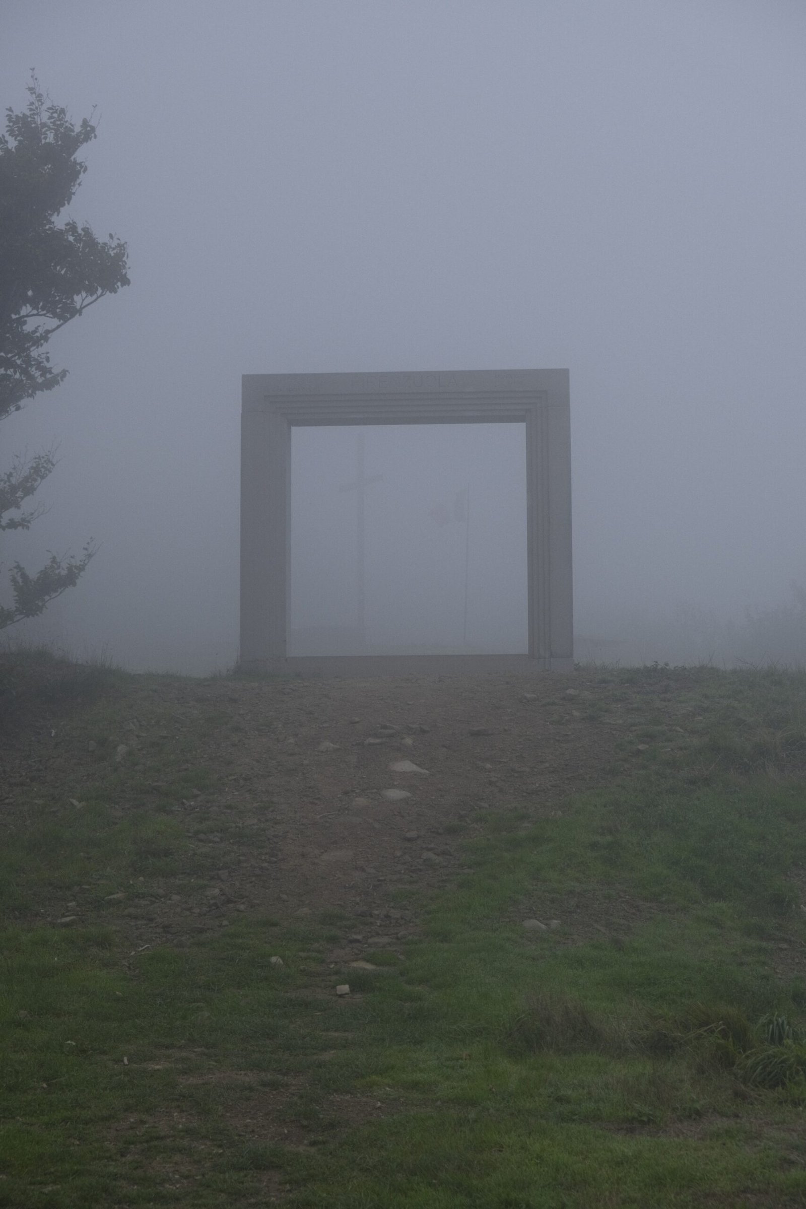 Wir steigen überqueren die Straße und steigen dann relativ unaufgeregt und bei null Fernsicht hinauf zum Monte Gazzaro. Der Gipfel des 1125m hohen “Bergerls” wäre grundsätzlich der perfekte Ort für einen kurzen Boxenstopp, immerhin warten einige Jausenbänke brav auf müde Wanderer, Wind und Hochnebel vermiesen uns dies aber an diesem Tag gehörig. Auch das Fenster mit Blick auf Gipfelkreuz und die Tricolore will bei diesem Wetter nicht so richtig zur Geltung kommen.