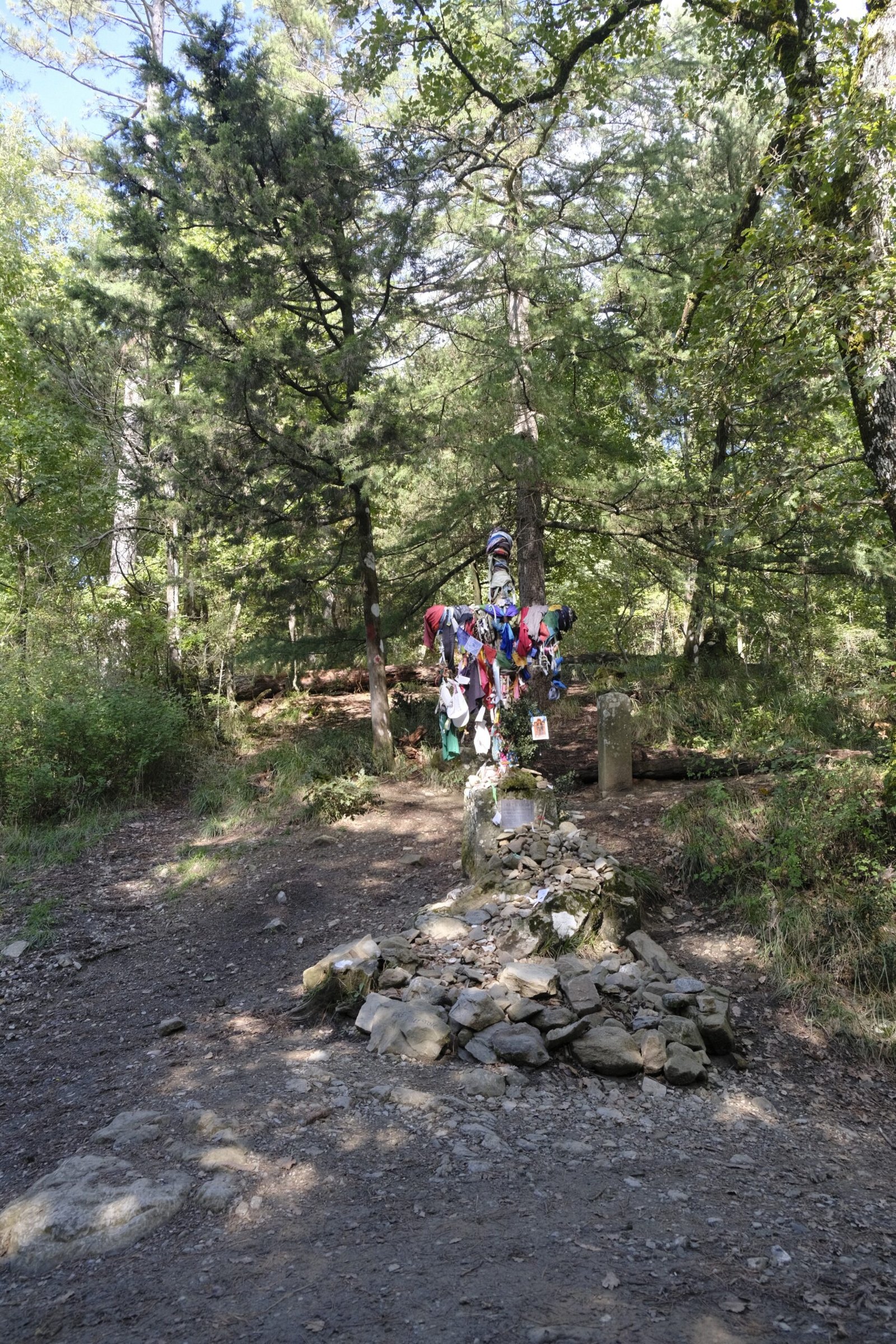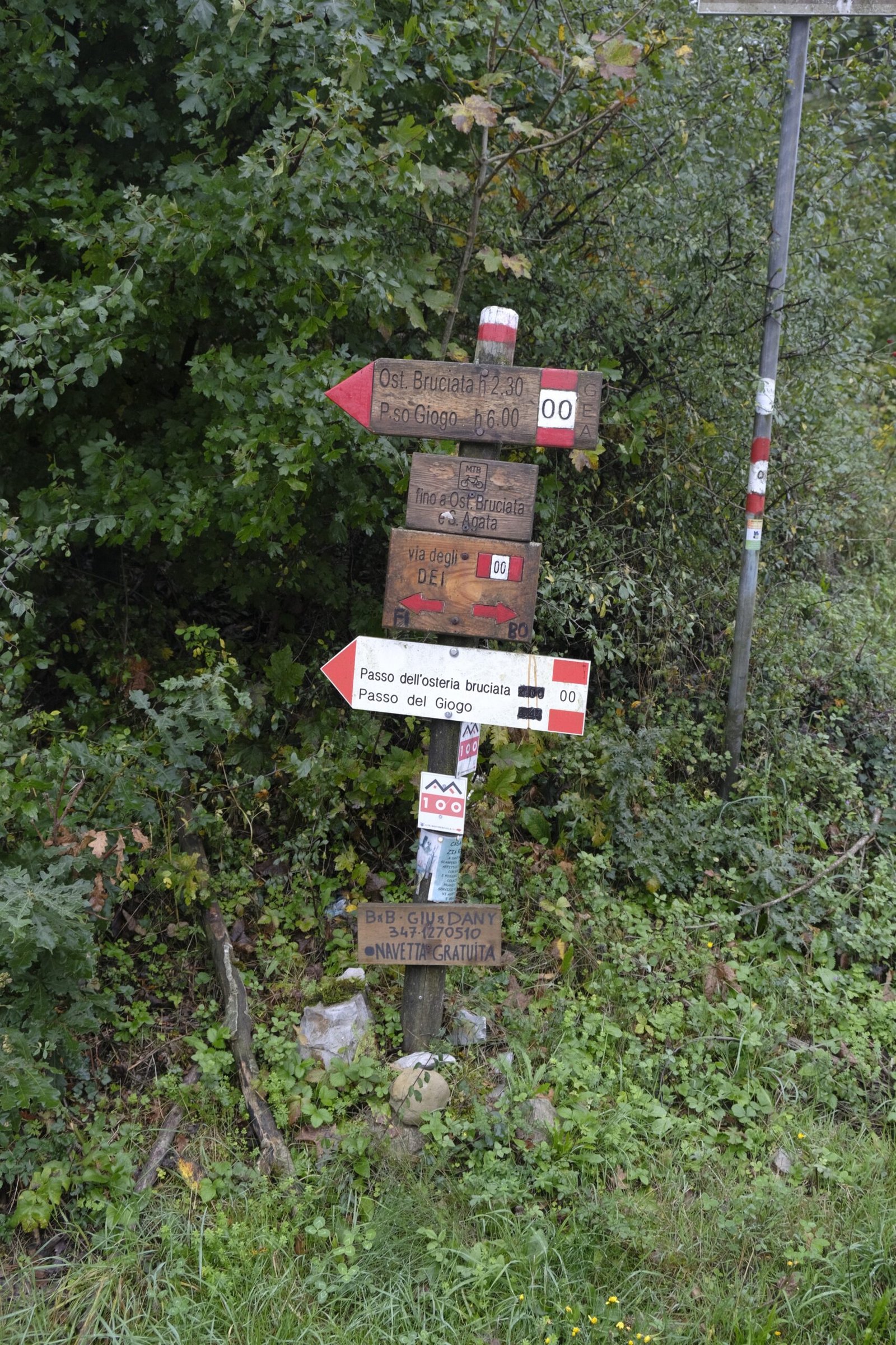 Nach dem etwas mühseligen Auf und Ab glauben wir schon fast an eine wundersame Besserung, als wir ein abstrus wirkendes Sockentor durchschreiten, an dem Wandersleute einem definitiv schrägen Brauch folgend, eine ihrer Socken zurücklassen. Spätestens aber im kleinen Ort Selve hat uns aber die Straße endgültig wieder. Der Weg hinauf nach Monzuno verläuft direkt auf der viel befahrenen SP59 und wer den italienischen Fahrstil kennt (schlecht und viel zu schnell) weiß, dass diese Passage nicht nur unangenehm sein kann, sondern auch echt gefährlich. Besser also einmal mehr den Weg hinter die schützende Leitplanke nehmen, als einmal zu wenig. Warum hier keine bessere Alternative gefunden werden konnte, ist mir absolut unbegreiflich. Schließlich landen wir aber doch über einen kurzen, aber steilen Anstieg im beschaulichen Monzuno, wo es zur Ehrenrettung nicht nur eine (etwas spelunkenhafte) Bar gibt, sondern auch kleine Einkaufsmöglichkeiten samt einer Apotheke mit 24h-Automat. Nicht direkt am Weg, aber dennoch sehr empfehlenswert liegt das B&B Lodole Country House. Das wunderschön renovierte Landgut kann neben einer herrlichen Fernsicht und einem Pool auch mit einem qualitativ grandiosen Frühstücksbuffet aufwarten.