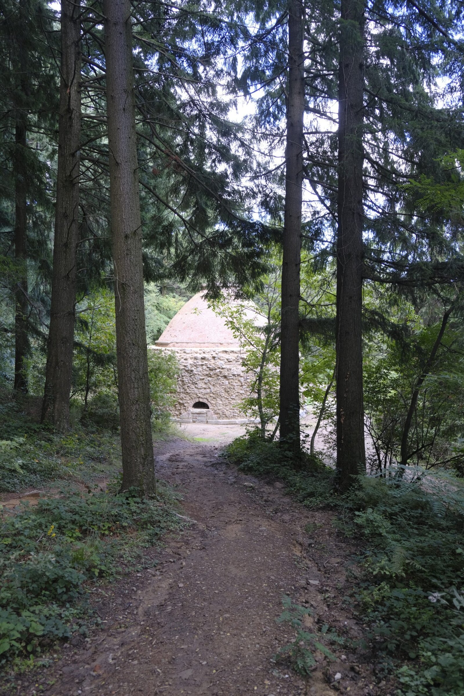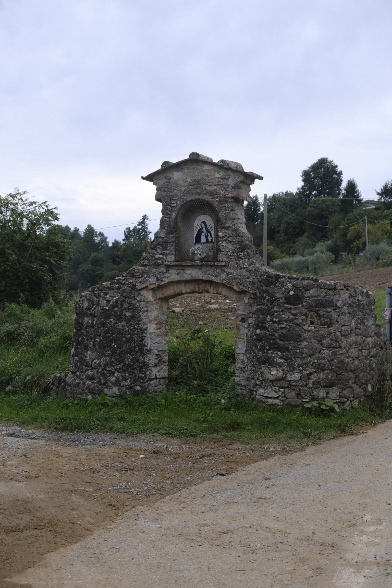 Wir finden uns wieder auf einer langen Zentralachse, die in einem Steinkreuz endet. Hier geht es kurz nach links zu einem bienenstock- oder ofenartigen Gebäude, welches sich bei näherer Betrachtung allerdings als das komplette Gegenteil entpuppt. Der archaische Bau diente tatsächlich zur Lagerung von Eis. Der Weg führt von hier aus über die Straße nach Süden, die direkt nach Vetta le Croce führt. Wir zweigen allerdings bei erster Gelegenheit nach links ab und begeben uns auf abenteuerlichen Pfaden hinunter nach Fontanelle, da sich unsere Unterkunft auf der Via Faentina befindet. Wieder ein gefährlicher Straßenhatscher also, aber die Unterkunft Casa Palmira ist den beschwerlichen Umweg allemal wert. Das Landgut ist wirklich wunderschön und verfügt auch über einen Pool und zur Verpflegung der Wandersleute wird von der Betreiberfamilie kurzerhand eine Sammelbestellung bei der lokalen Trattoria aufgegeben. Dafür lässt man sich doch gerne fast über den Haufen fahren.