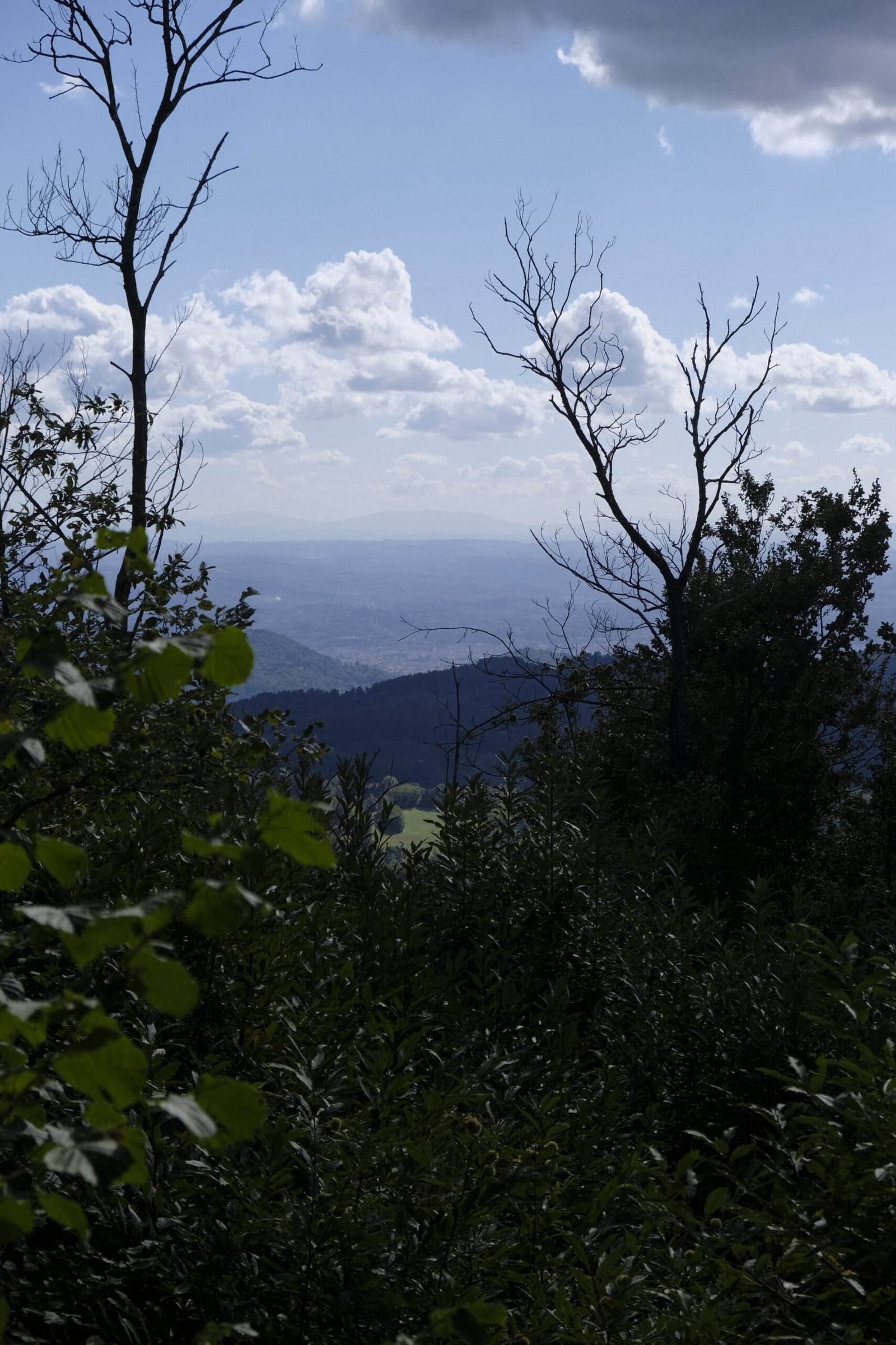 Wenig später passieren wir die eindrucksvollen Ruinen der Badia del Buonsollazzo. Die 1084 gegründete und mehrfach aus- und umgebaute Klosteranlage steht nunmehr seit Jahrzehnten leer und scheint -trotz angeblicher Bauprojekte- gänzlich dem Verfall preisgegeben. Ein Stück müssen wir uns noch abmühen, denn es geht teils steil durch den Wald nach oben. Dann stehen wir vor einem etwas seltsam anmutenden Gebilde, das entfernt an ein Wegkreuz erinnert und auch ein solches darstellen soll. Beim Croce die Mèlago biegen wir nach rechts ab und wandern dann relativ gemütlich der Kammlinie entlang nach Südosten. Völlig unvermittelt fällt unser Blick dabei erstmals auf die Arno-Stadt. Während uns Bologna zu Anfang tagelang begleitet hat, lässt sich die ehrwürdige Florentiner Dame bis fast ganz zum Schluss bitten.