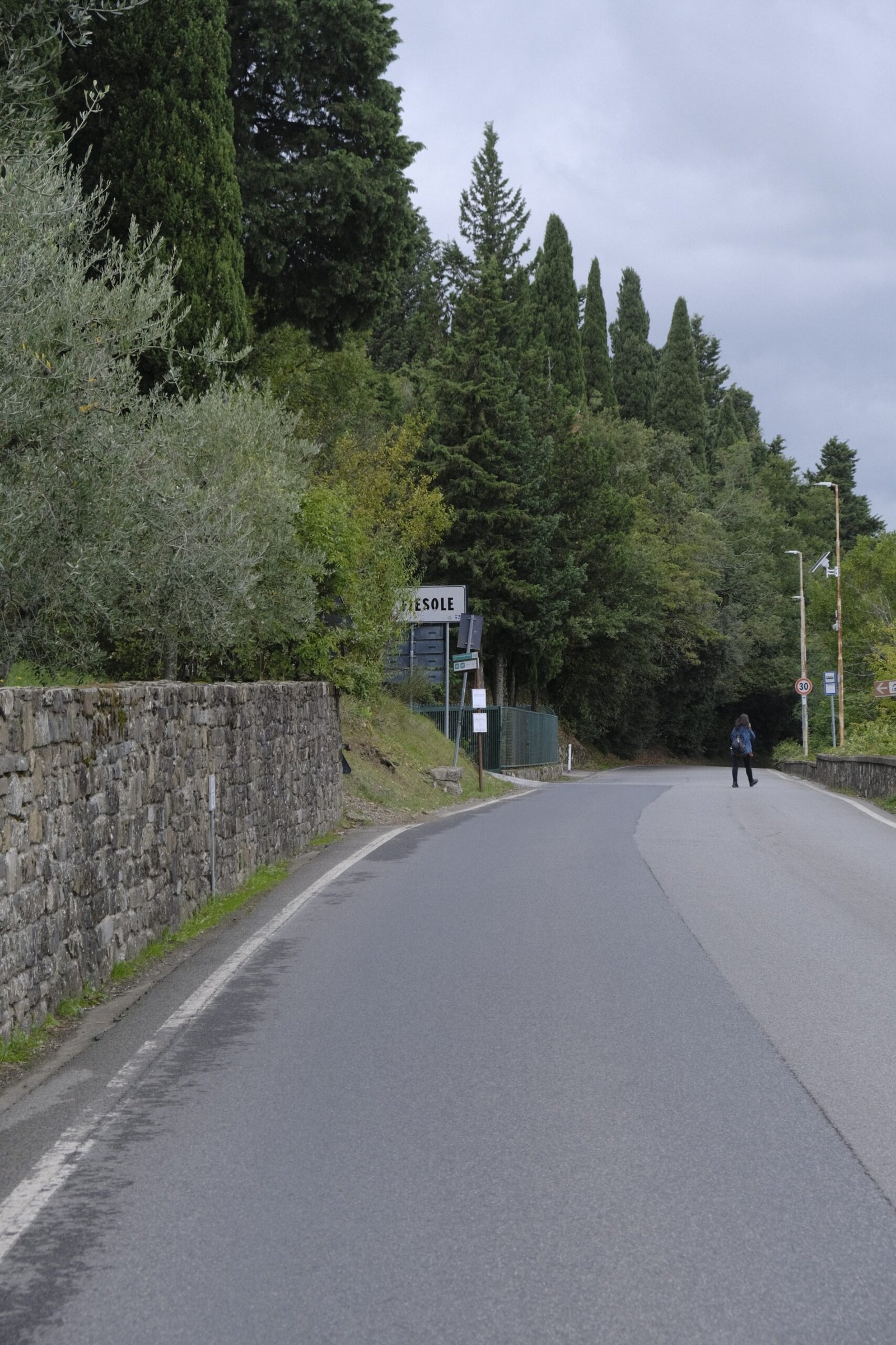 Noch einmal erklimmen wir einen Hügel, namentlich den Poggio Pratone, auf dem sich mehrere Denkmäler befinden und wandern dann hinüber zu einer weniger denkmalartigen Sendeanlage. Beim Abstieg genießen wir den herrlichen Blick auf das uralte Fiesole, welches schon zu den Zeiten der Etrusker ein bedeutendes Zentrum dargestellt hat. Wer die Zeit und Muße hat, sollte sich den Ort und den dazugehörigen Archäologiepark keinesfalls entgehen lassen. Wir tangieren den Ort heute allerdings nur und biegen gleich nach der Ortstafel nach links ab. Der Weg führt uns weiter nach Süden, vorbei am lokalen Campingplatz.