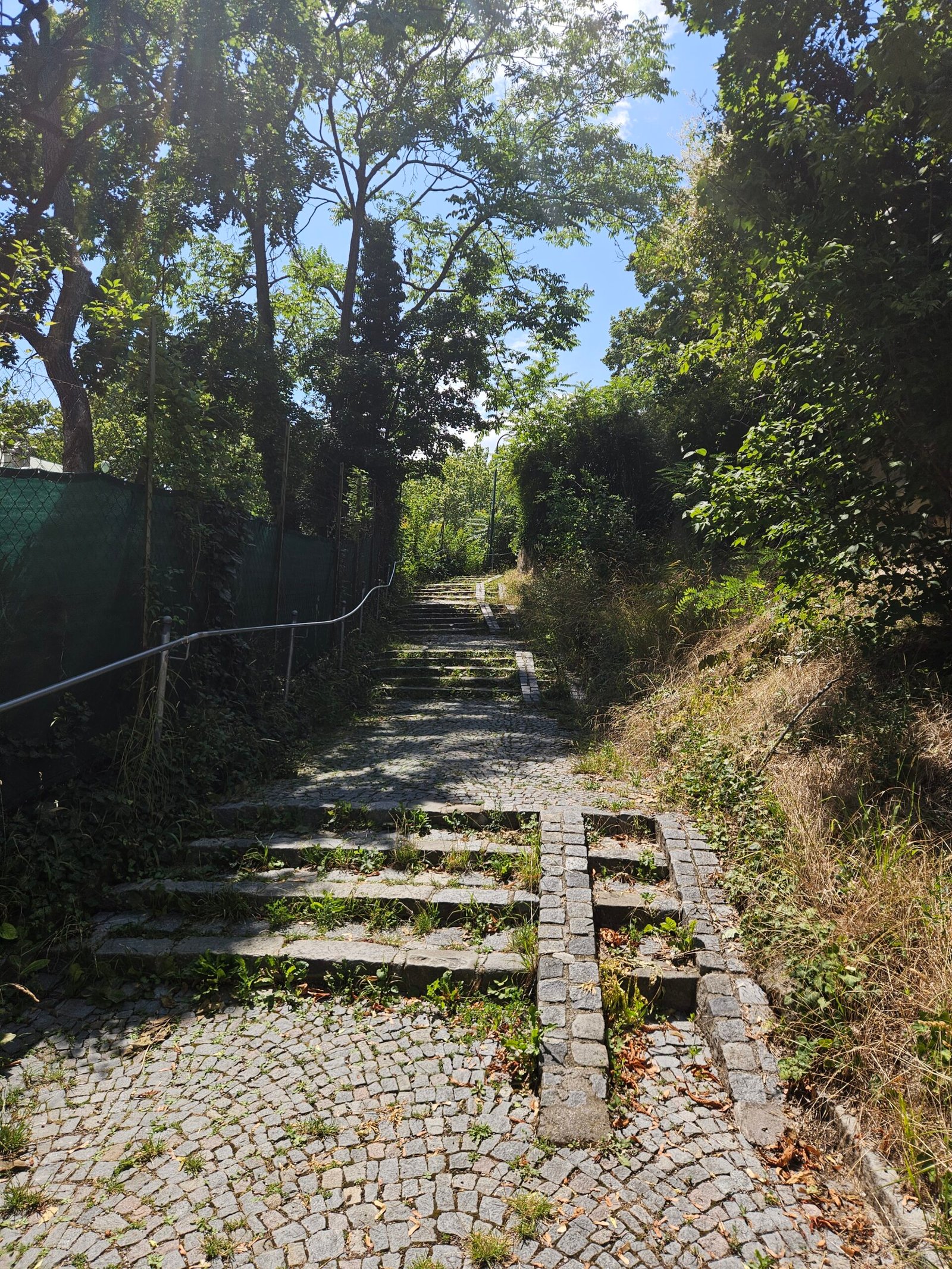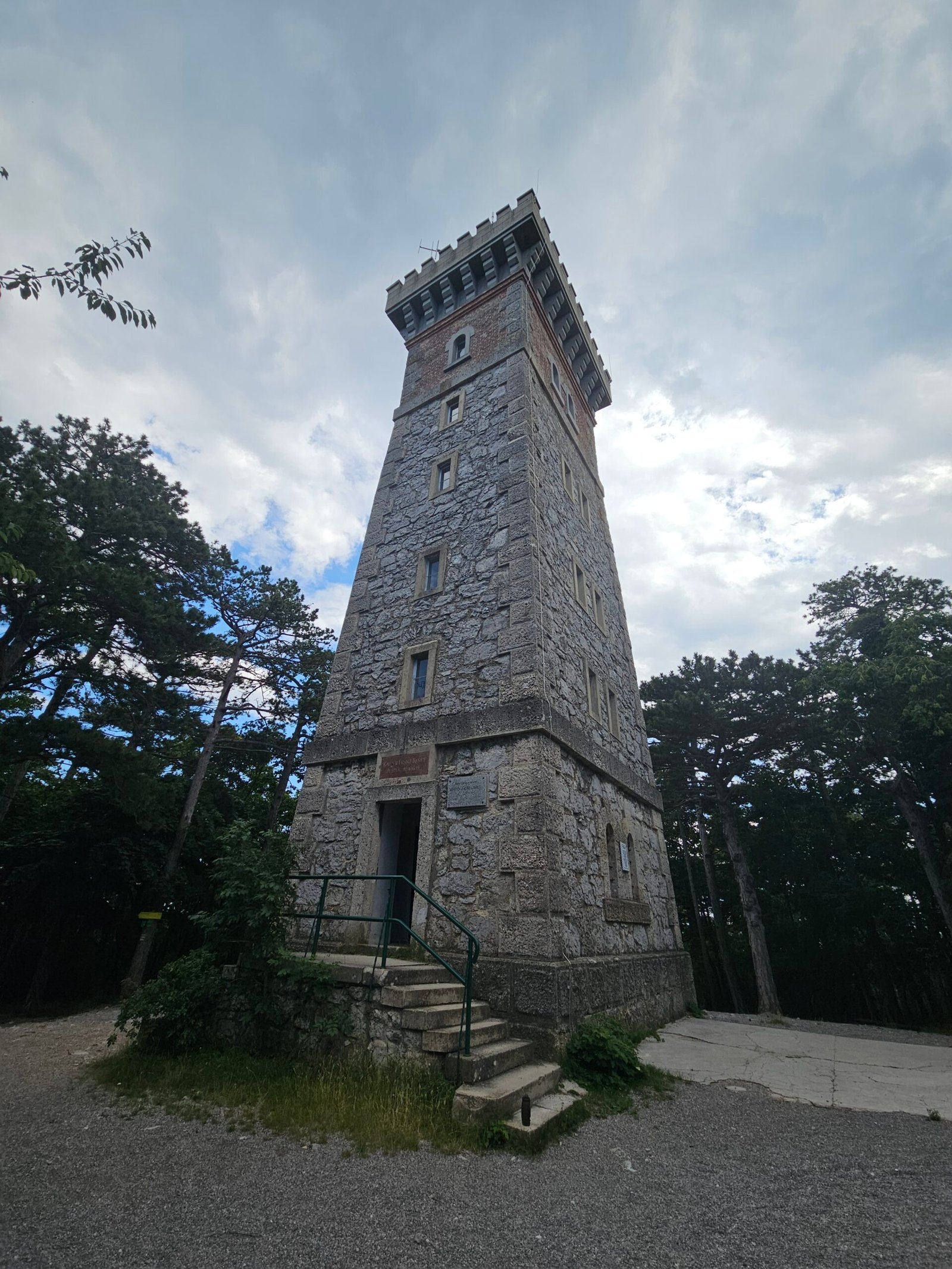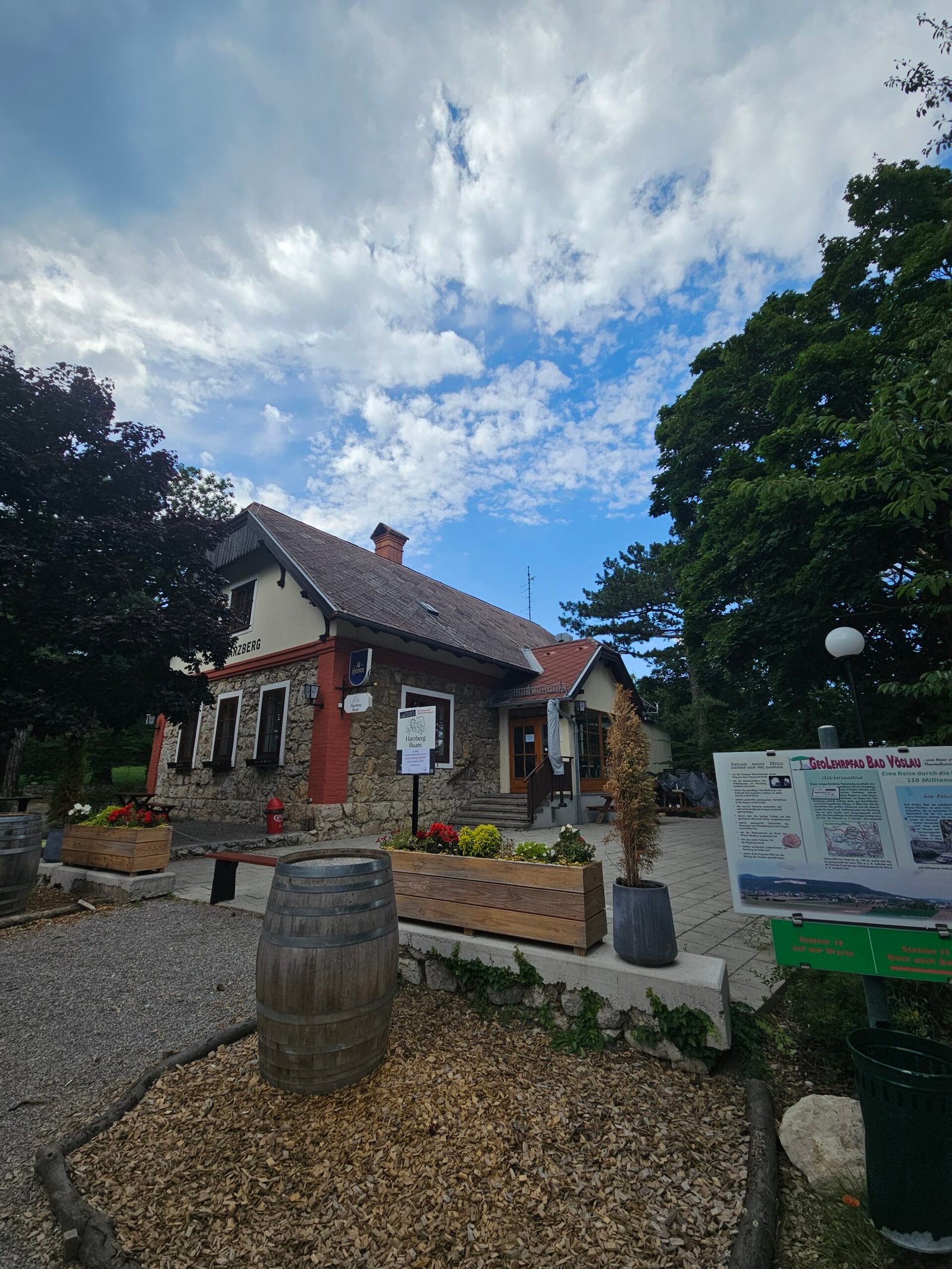 Recht unvorbereitet stehen wir dann auch vor der durchaus eindrucksvollen Jubiläumswarte auf dem Harzberg. Der burgartige Bau aus dem Jahr 1898 wurde, wie so viele andere Jubiläumswarten anlässlich des 50-jährigen Thronjubiläums von Kaiser Franz-Joseph I. errichtet und bietet einen herrlichen Rundblick auf die umliegende Hügellandschaft und das Wiener Becken. Das Ausflugsgasthaus am Fuß des Turms bietet natürlich auch kulinarische Stärkungen, bei der bescheidenen Tourenlänge kann man darauf eigentlich aber auch getrost verzichten und lieber in Vöslau noch genüssliche einen Kaffee schlürfen. Runter geht’s also und damit es nicht zu langweilig wird, nehmen wir dieses Mal die andere (orografisch linke) Seite in Angriff. Mäßig steil und über einen teils gestuften und zusammenbetonierten Waldweg geht es in nordöstliche Richtung recht schnell nach unten und wir treffen rasch wieder auf die geschotterte Harzbergstraße.