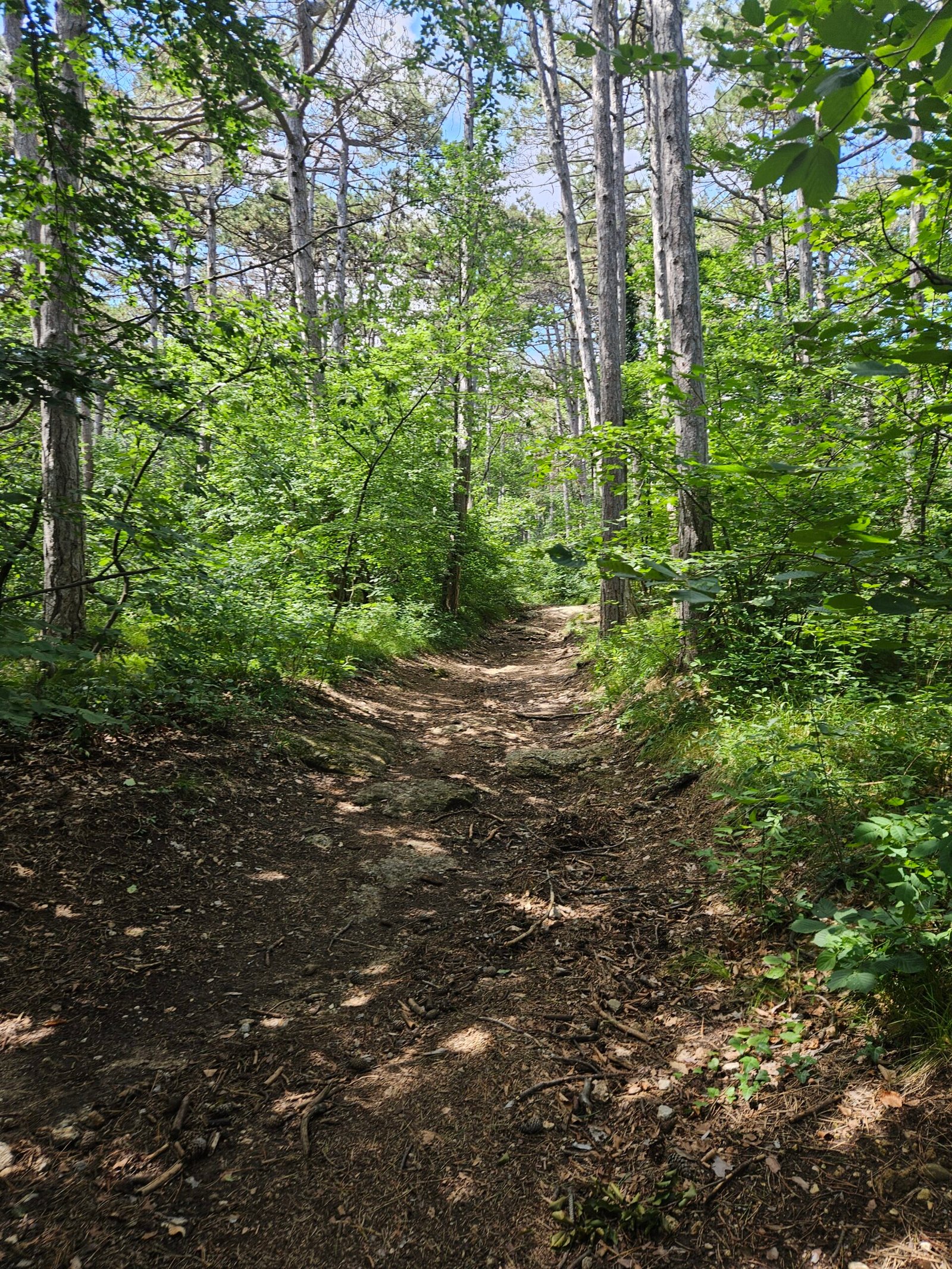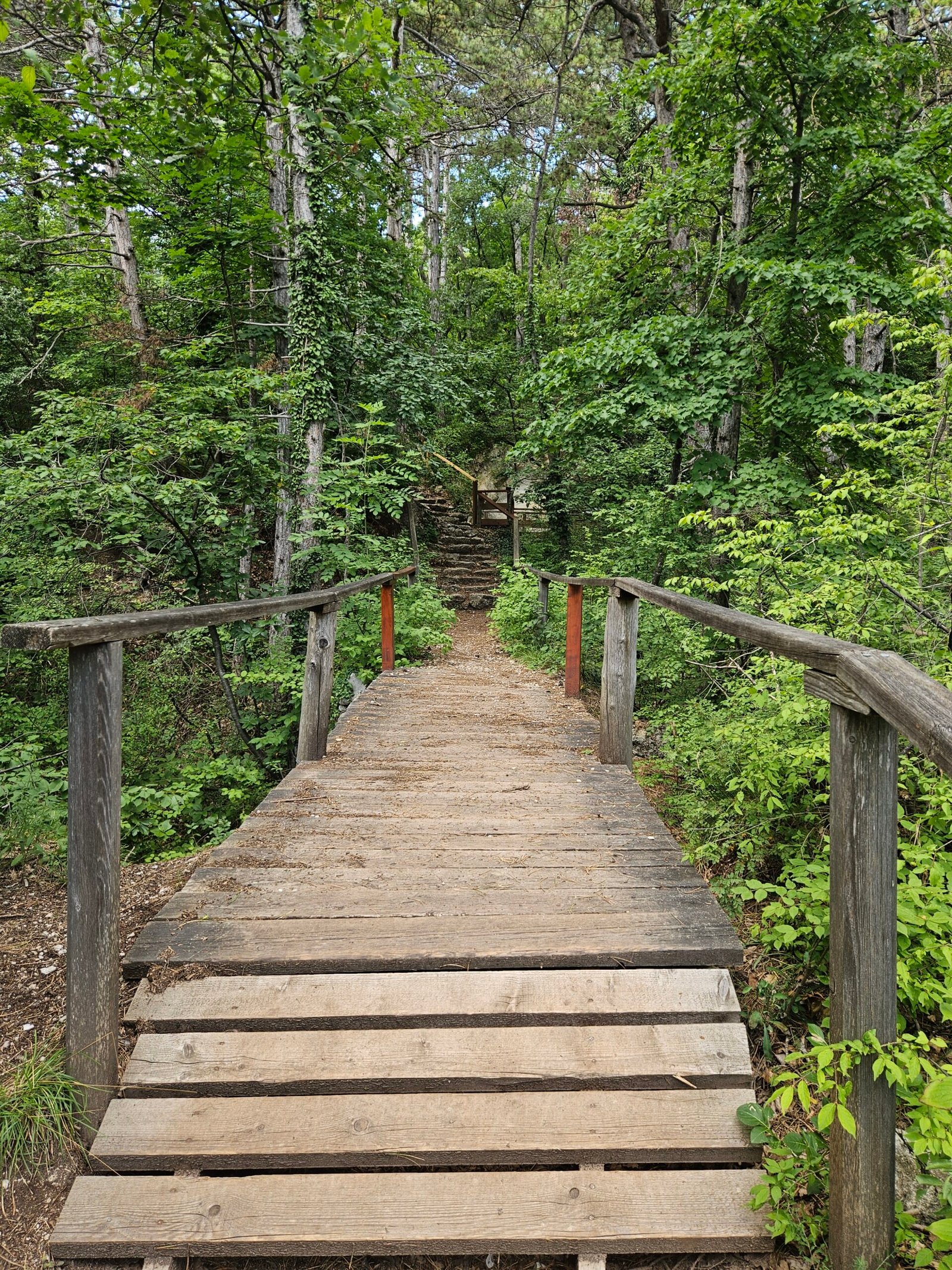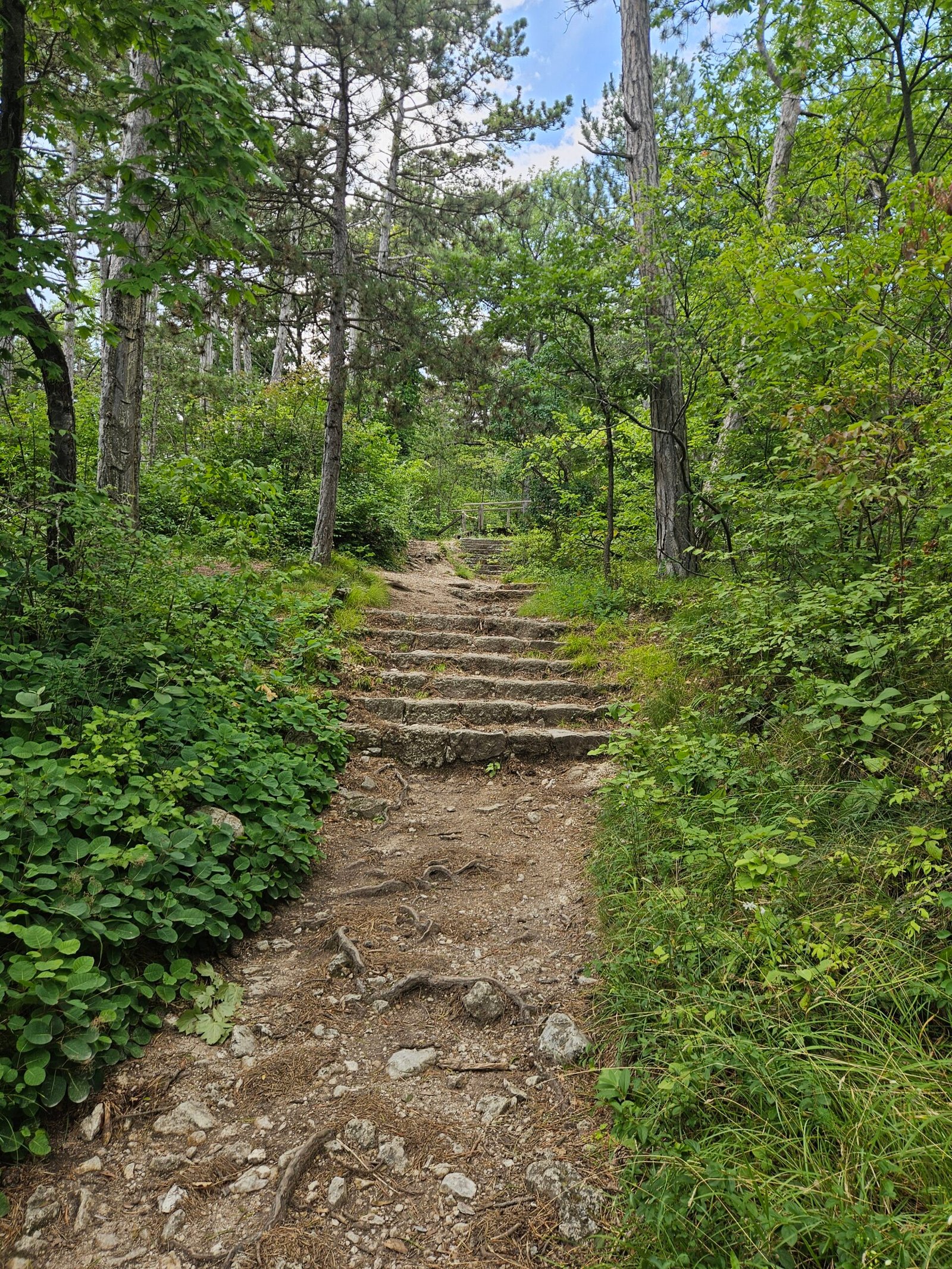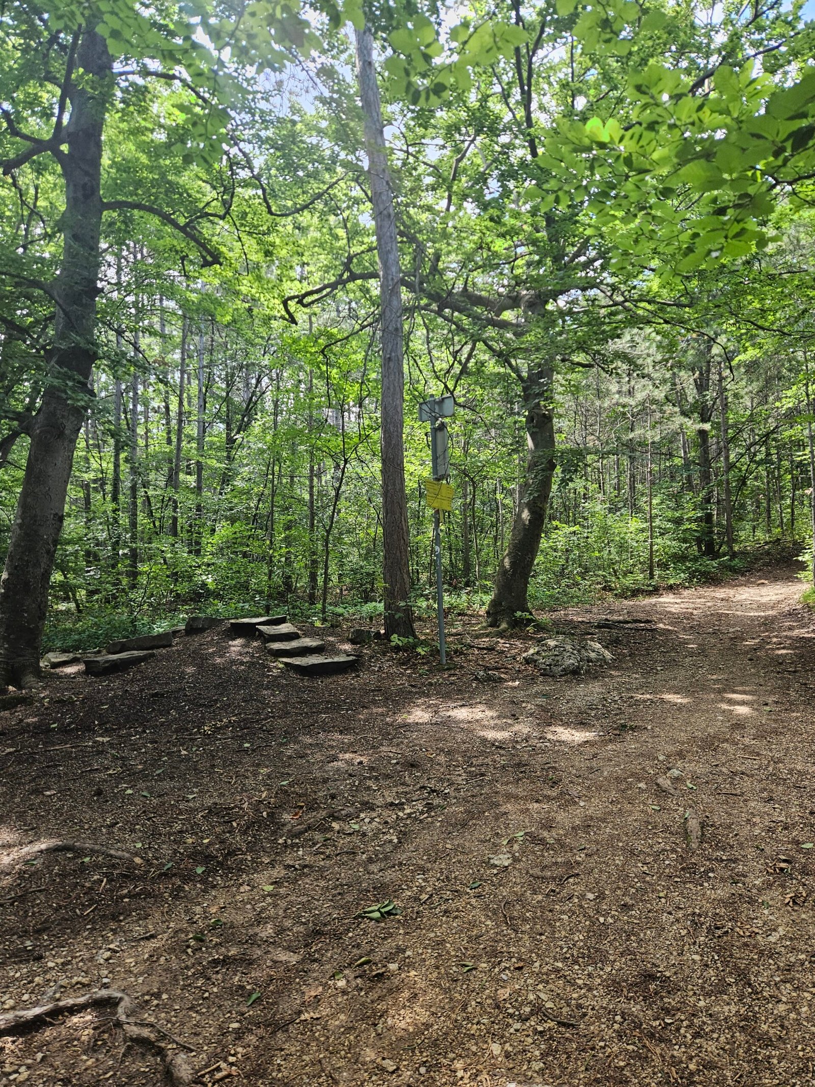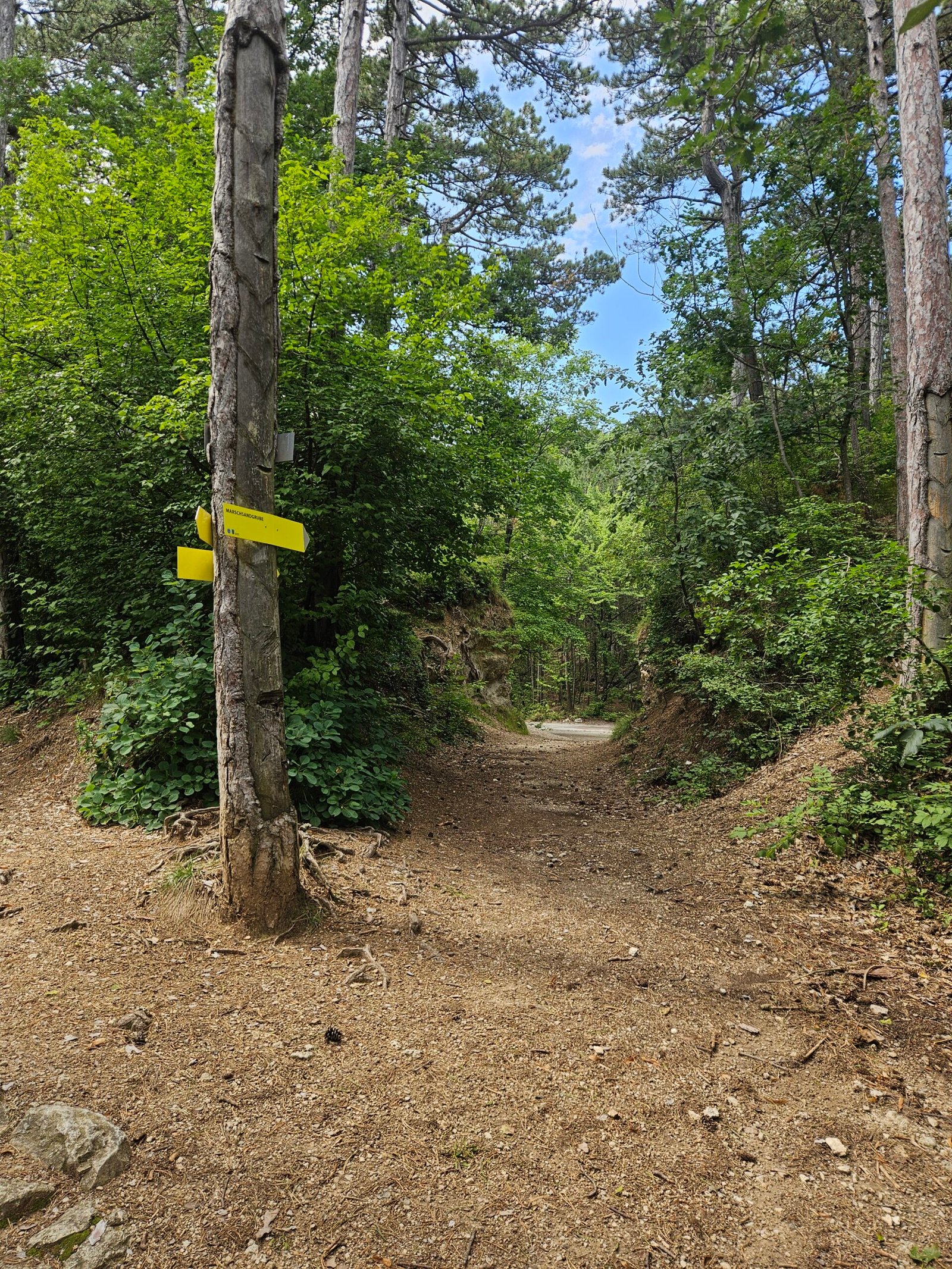 Durch die Vielzahl an Hinweisschildern ist der Weiterweg kaum zu übersehen und doch gibt es abseits des Pfades immer wieder nette kleine Orte zu entdecken, darunter das aufgelassene Sandabbaugebiet in der Marschgrube. Mit zunehmender Höhe steigt etwas kontraintuitiv auch der Ausbau der Weganlage. Stufen und Stiegen helfen über die steilsten Stücke hinweg und Stege und Brücklein helfen über den einen oder anderen Graben hinweg. Mittendrin steht mit der Roverhütte der Vöslauer Pfadfinder:innen auch ein eindrucksvolles Waldgebäude, durch das wir beinahe mittendurchmarschieren. Ein kurzer Aufschwung erhebt uns über die letzten Ausläufer der Sandgrube, dann flacht das Gelände spürbar ab. Über einen schmalen Pfad nähern wir uns dann dem Tagesziel.